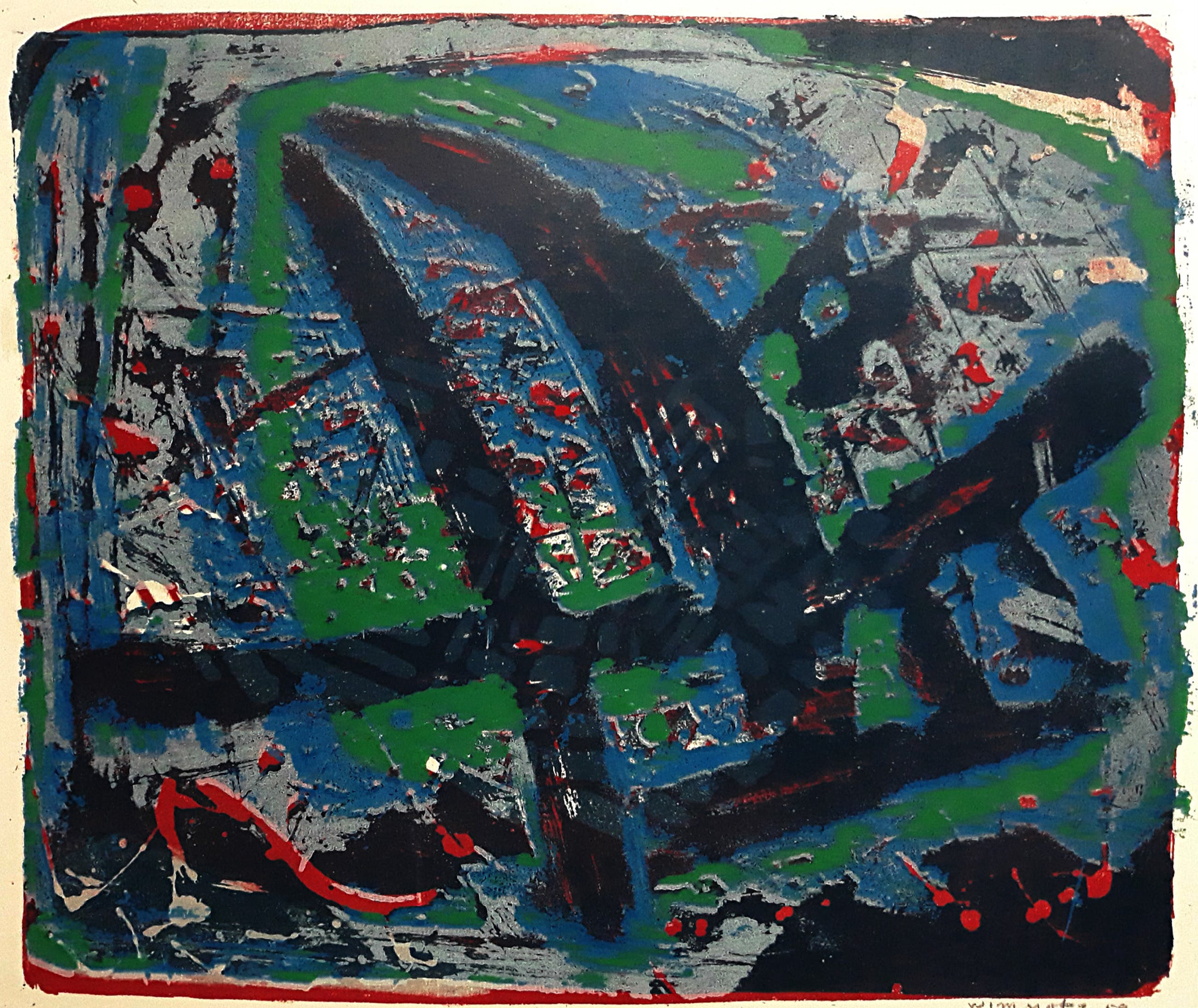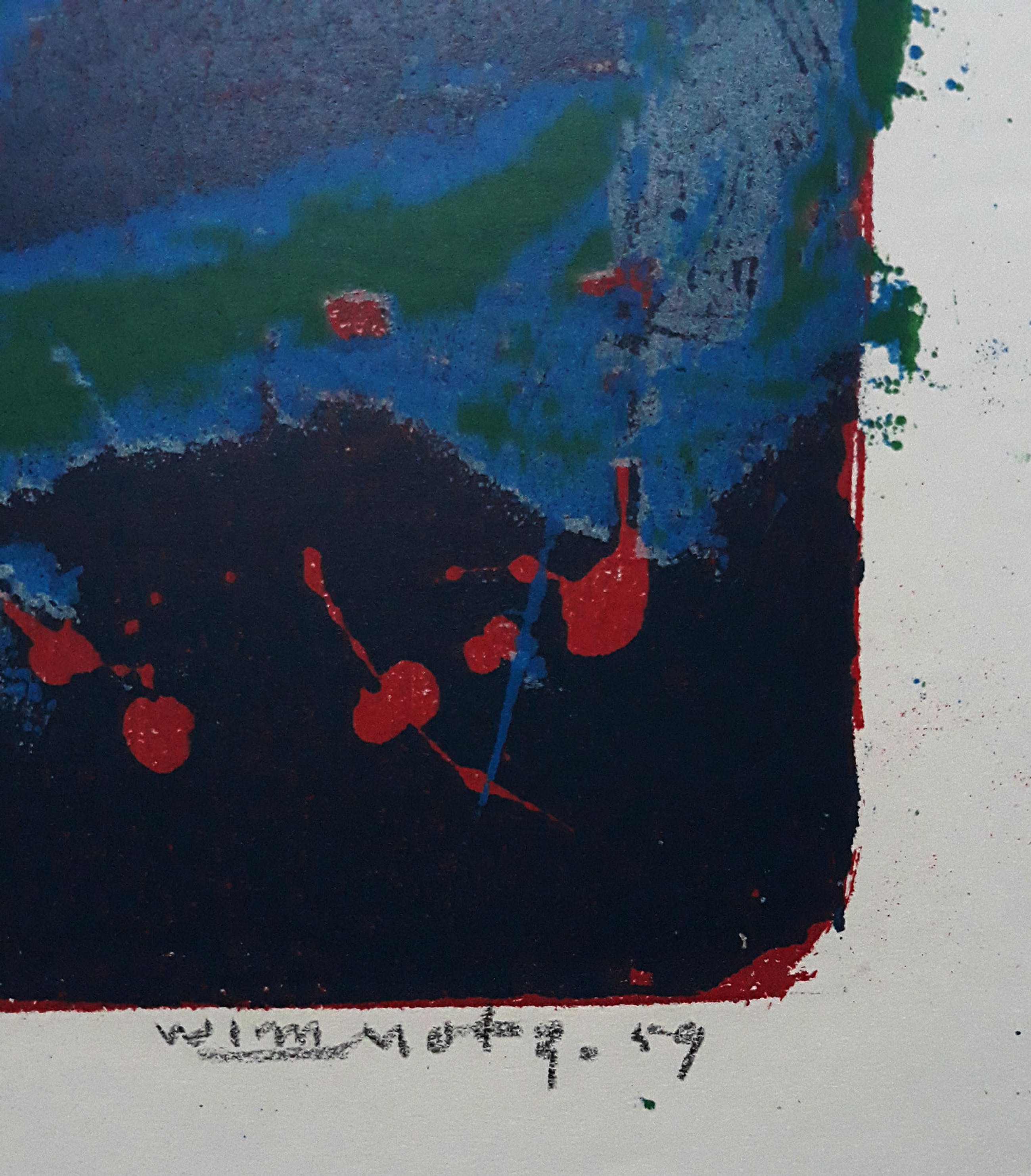 Mooi, wat losser werk van Wim Motz. Litho op papier met watermerk “Pannekoek / Holland”, met potlood gesigneerd en gedateerd (‘59). In zeer goede conditie.