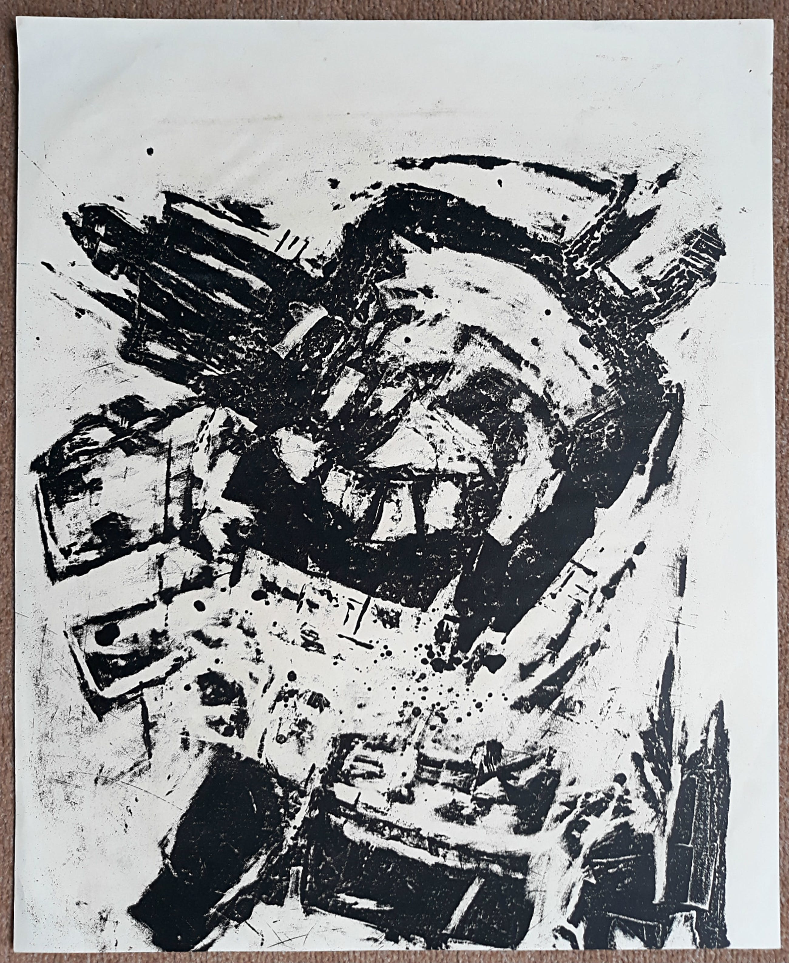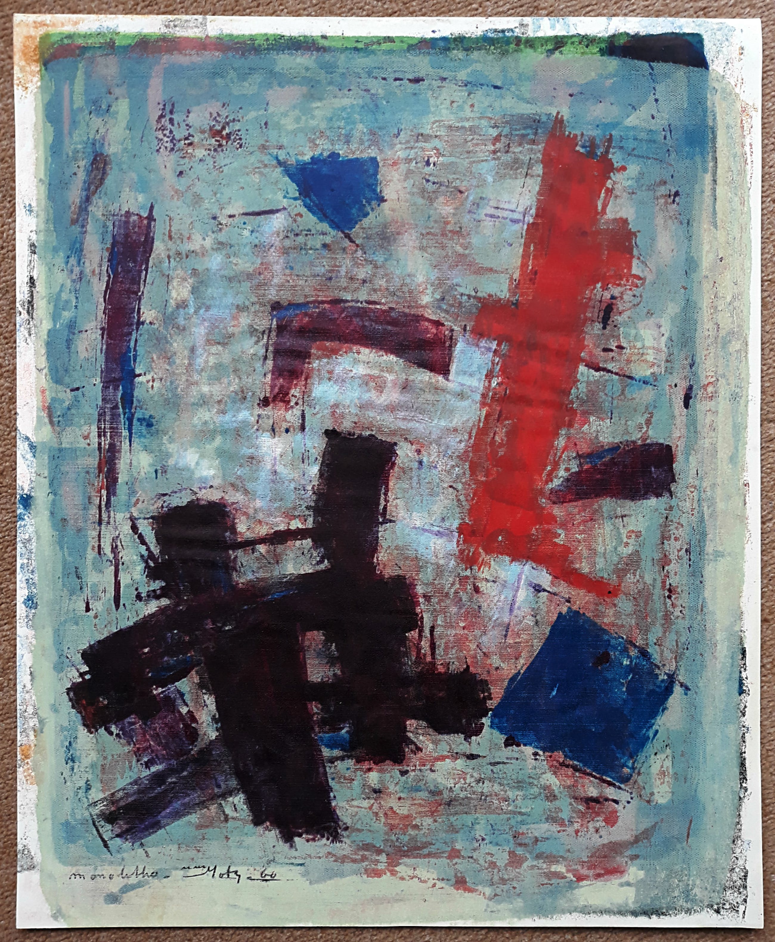 Karakteristiek werk van Wim Motz. Litho op papier, met potlood gesigneerd en gedateerd (’60), achterop het blad nog een proefdruk in zwart van een andere compositie. In goede conditie, blad rimpelt licht door de toegepaste verf en techniek (soort monotype vanaf canvas).