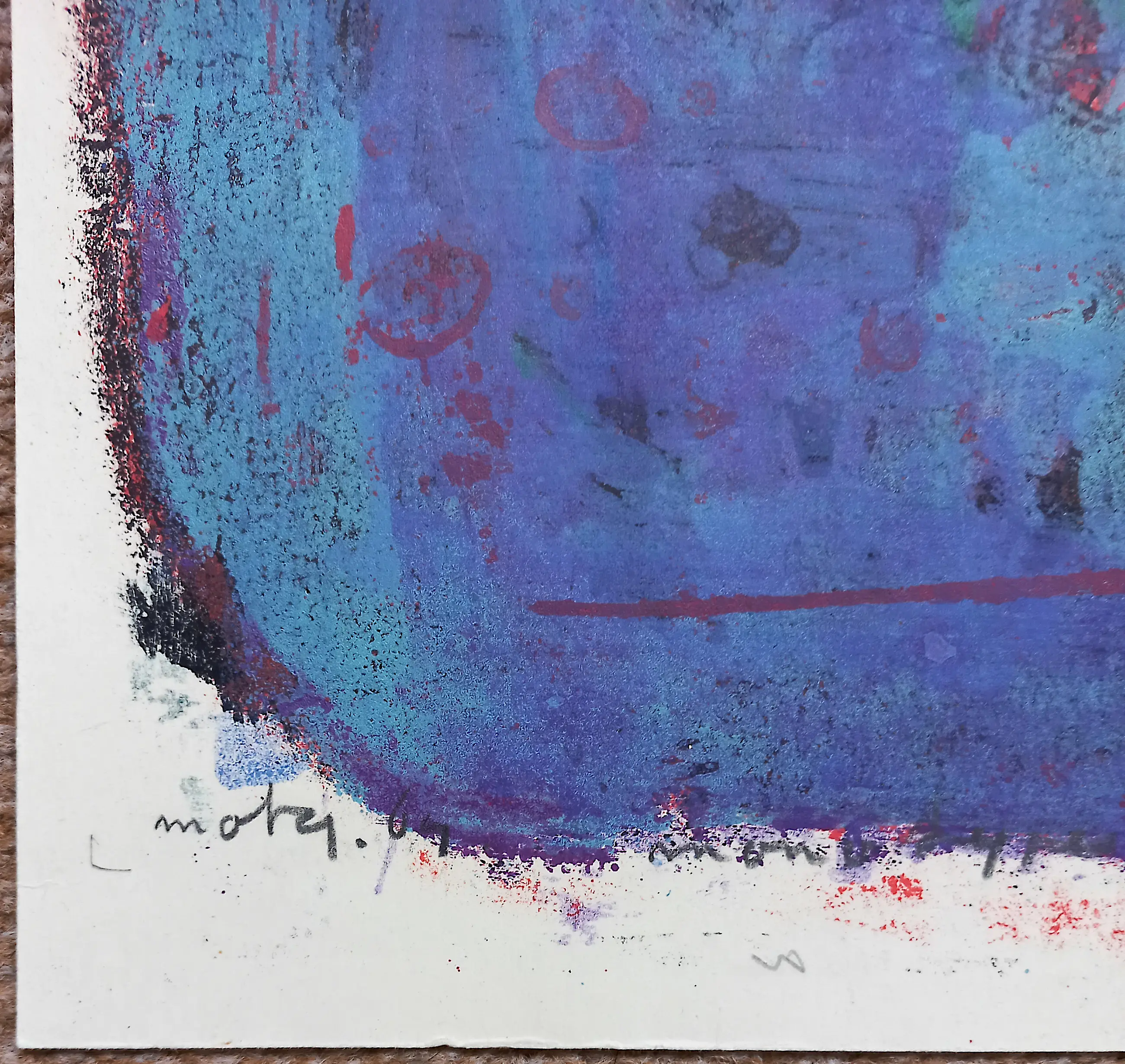 Karakteristiek werk van Wim Motz. Monotype op geschept papier, met potlood gesigneerd, gedateerd (’64) en “monotype”. Op de achterkant nog een zwart-wit proefdruk met zijn atelierstempel. In zeer goede conditie.