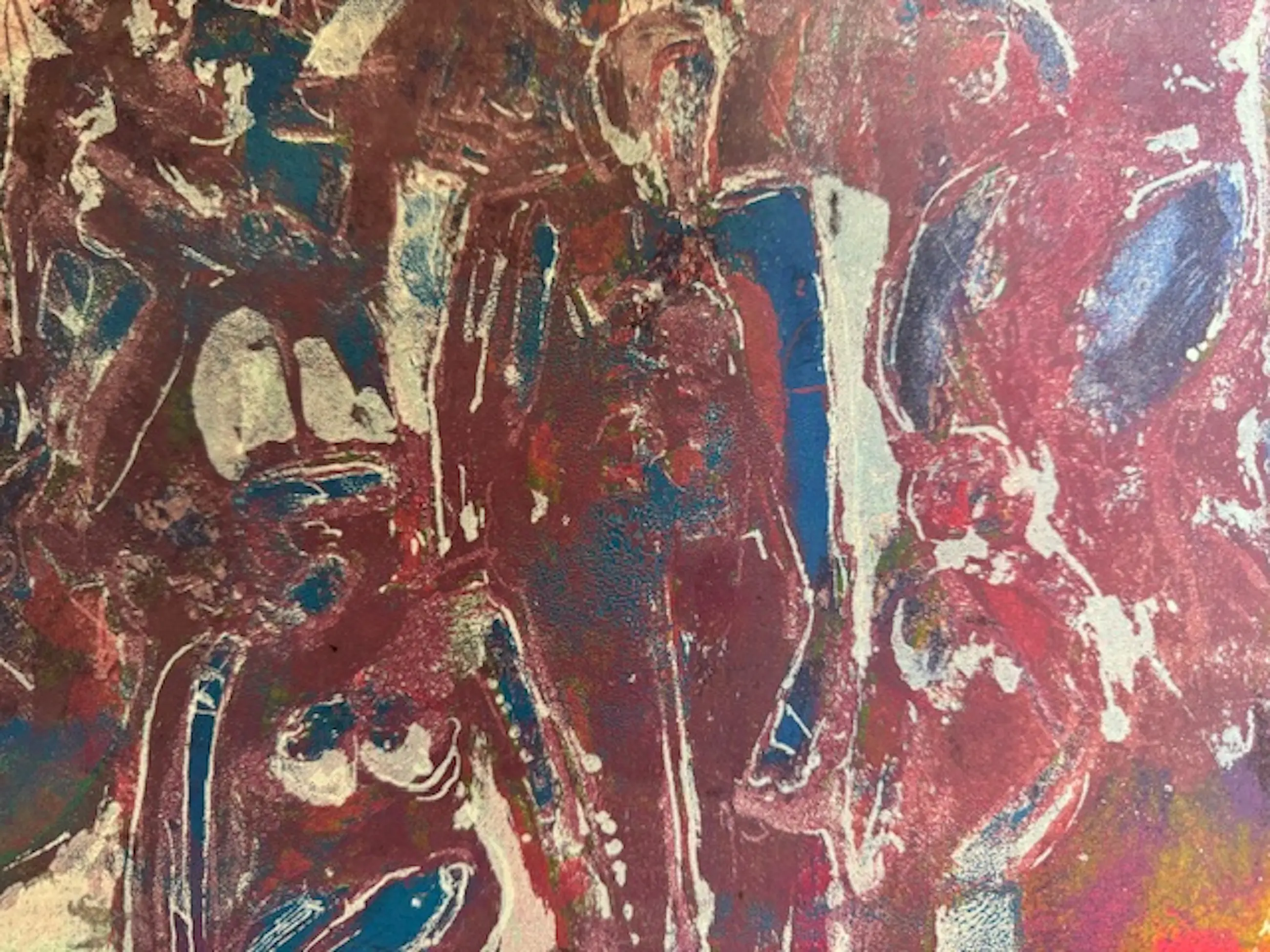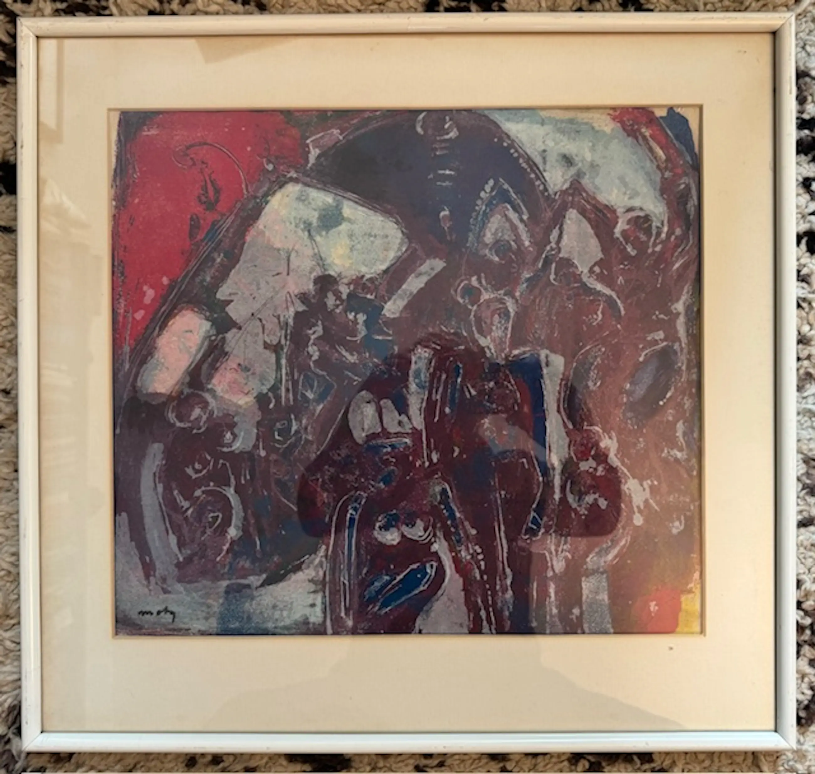 Hierbij een eigen druk litho van Wim Motz met figuren in een ruimte.