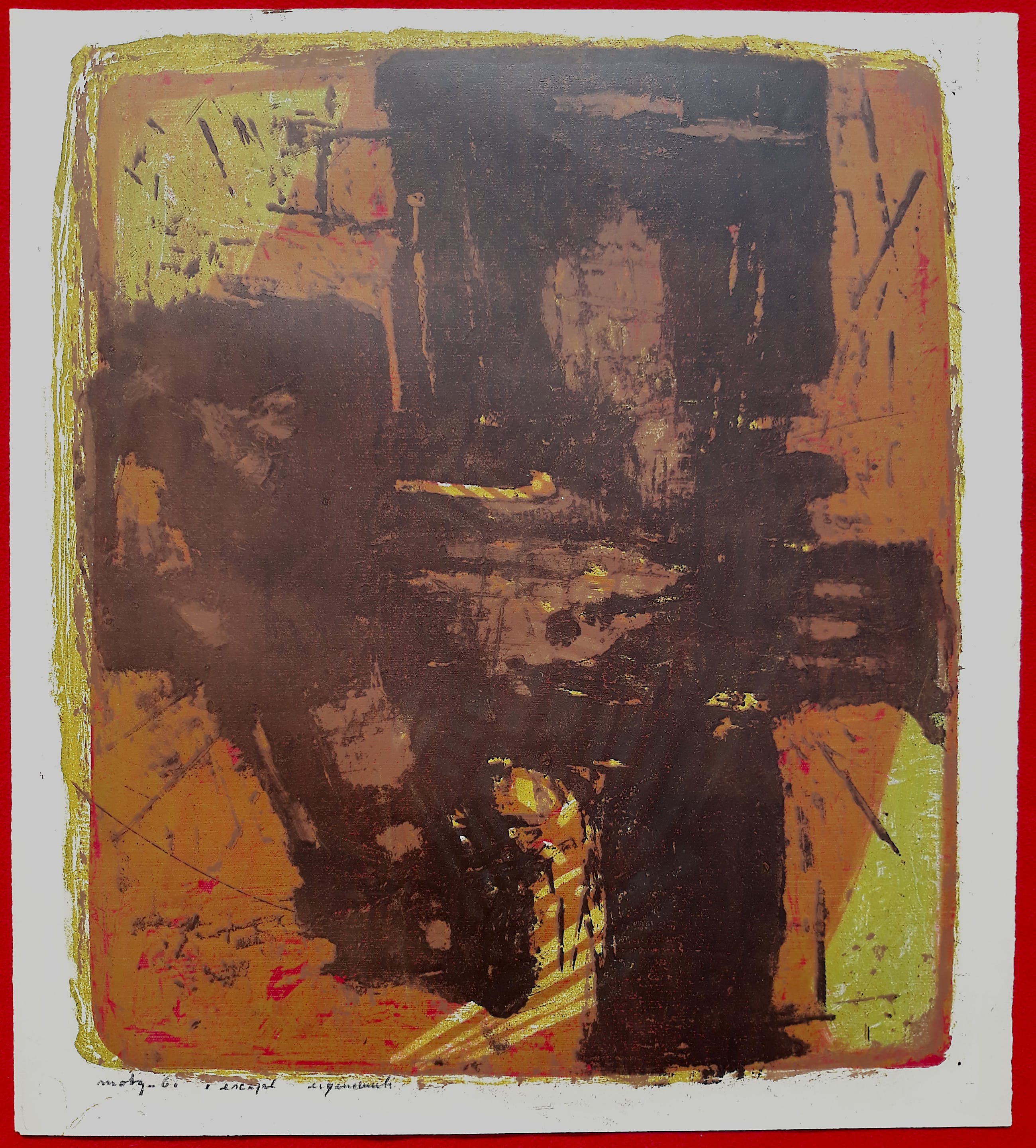 Karakteristiek werk van Wim Motz. Monotype op papier, met potlood gesigneerd, getiteld (?) en gedateerd (‘61). In zeer goede conditie.