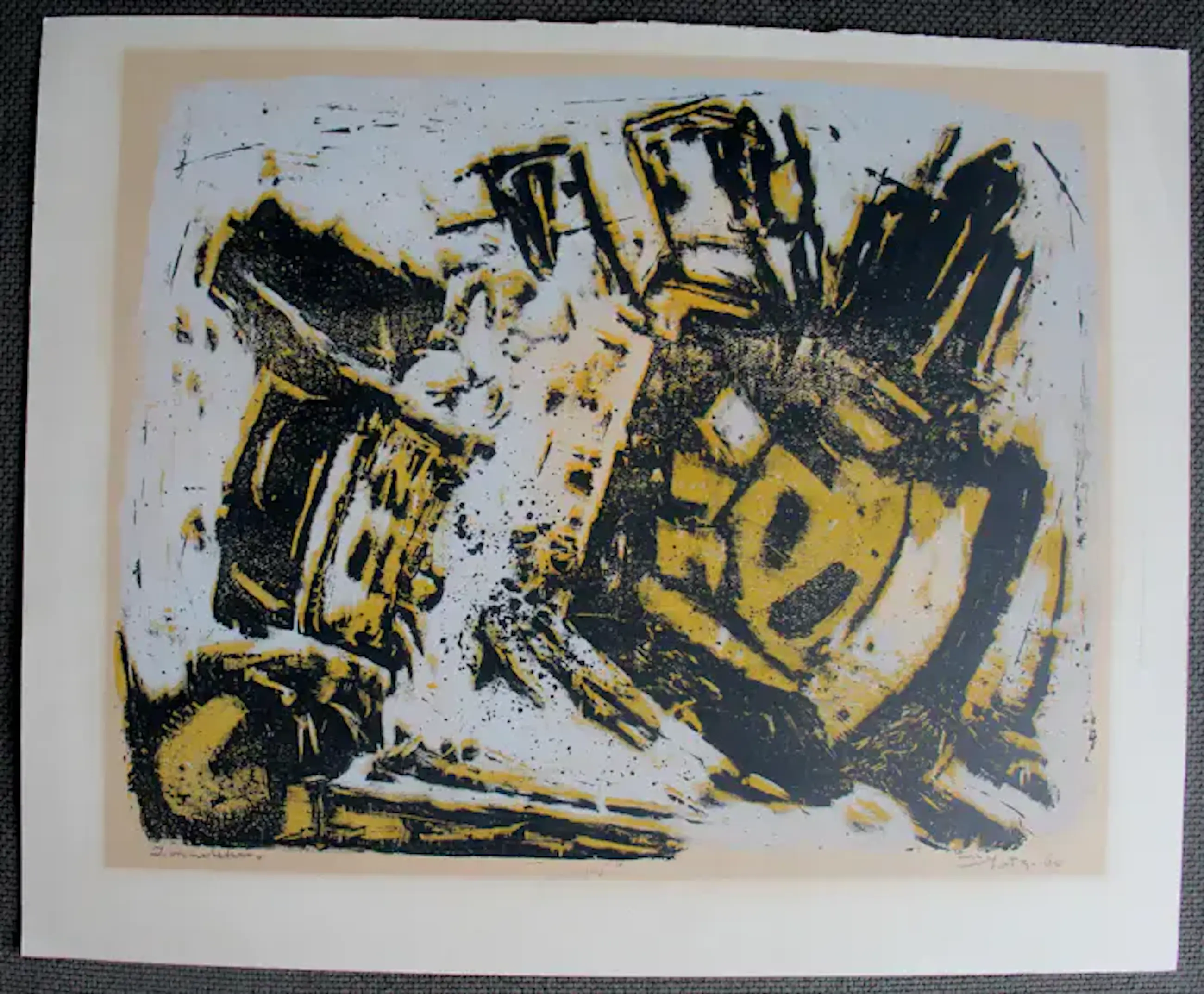 Litho van Wim Motz uit 1960. Titel: Zonneteken. Afmetingen blad: H52 x B64cm. Afmetingen voorstelling: H42 x B54cm. Het werk is rechts onderaan, gesigneerd door de kunstenaar. De authenticiteit van het aangeboden werk wordt volledig gegarandeerd. Een certificaat van echtheid kan, op aanvraag, worden gemaild.