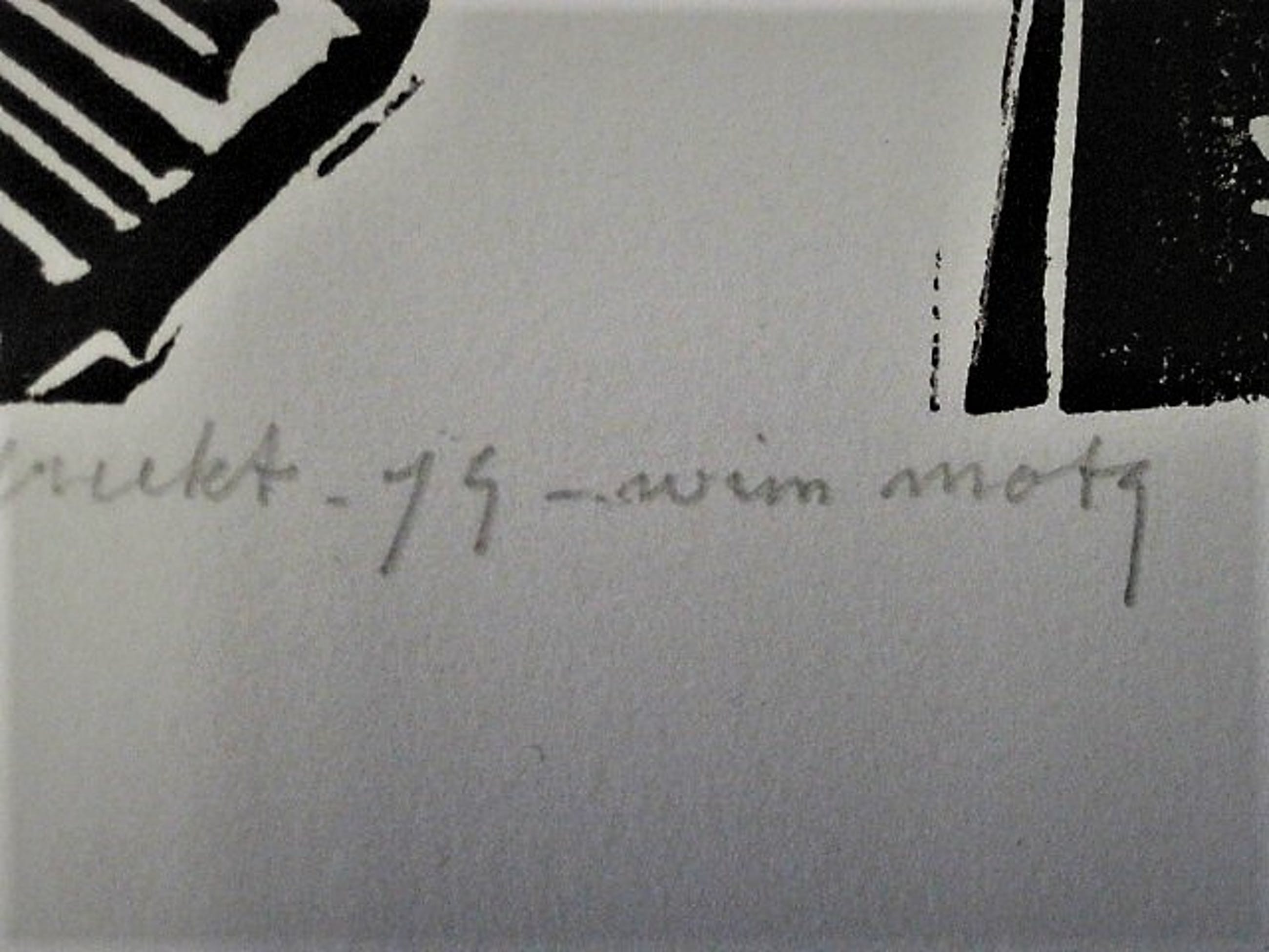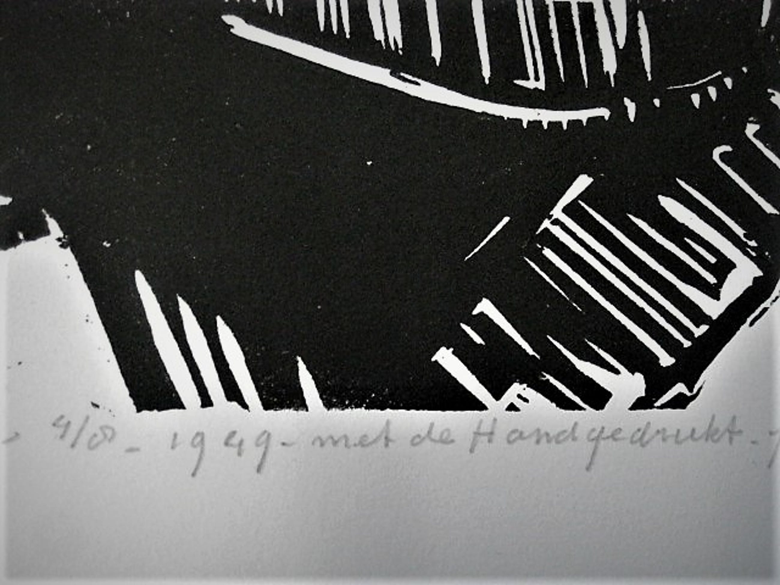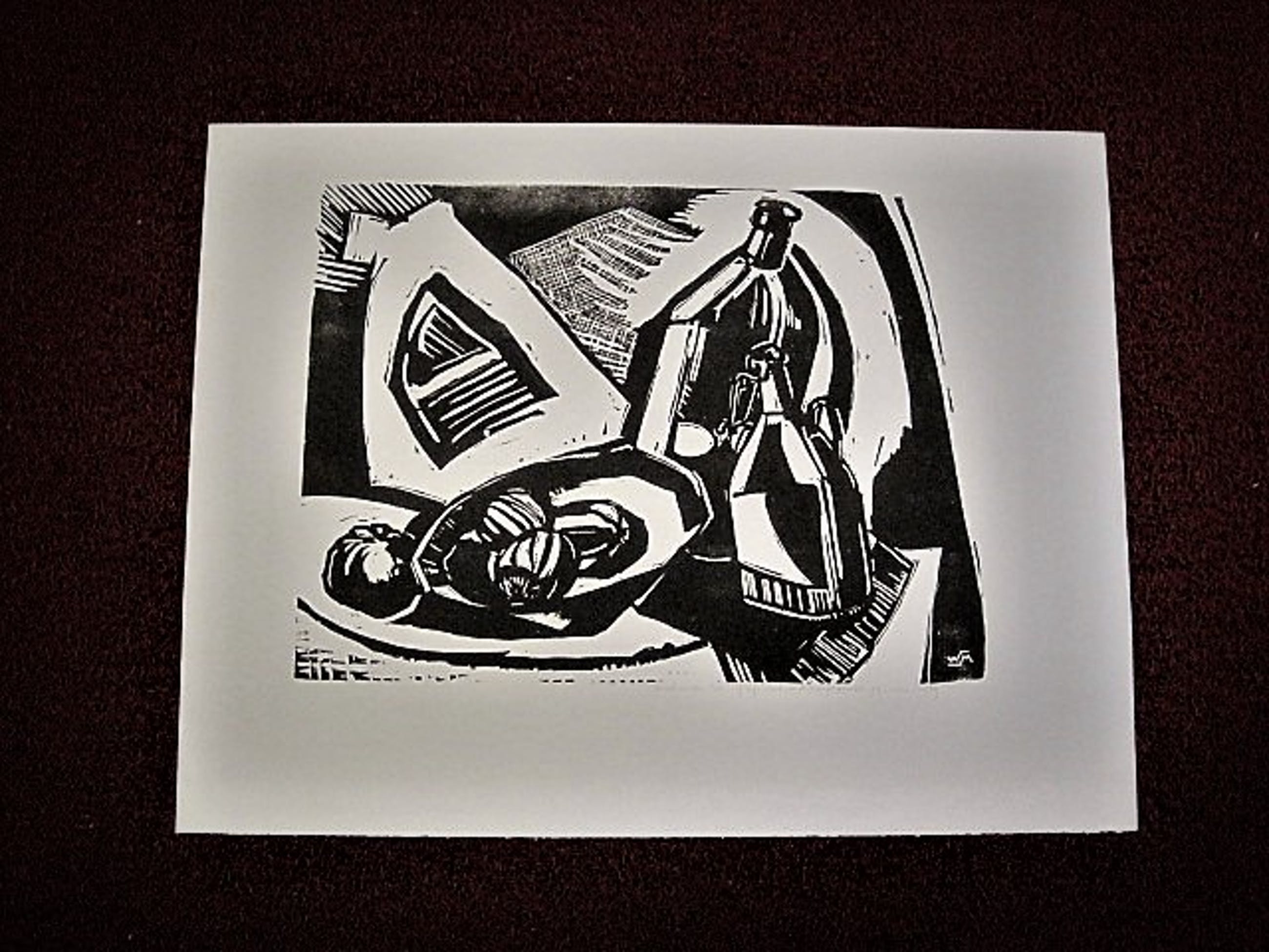 Tweemaal wim Motz! Een handgekleurde Lithografie "Haven met tanker" en een zeer kleine oplage (8 ex) handgedrukte Houtsnede "Stilleven" uit 1949.
