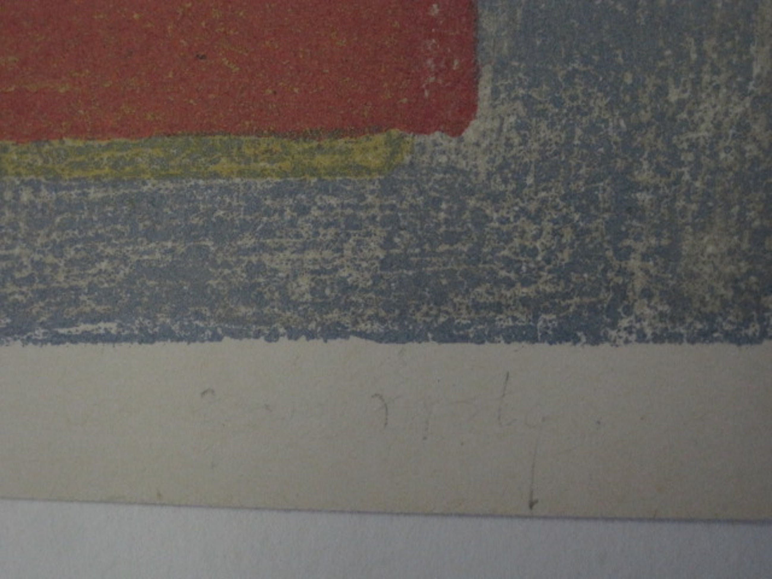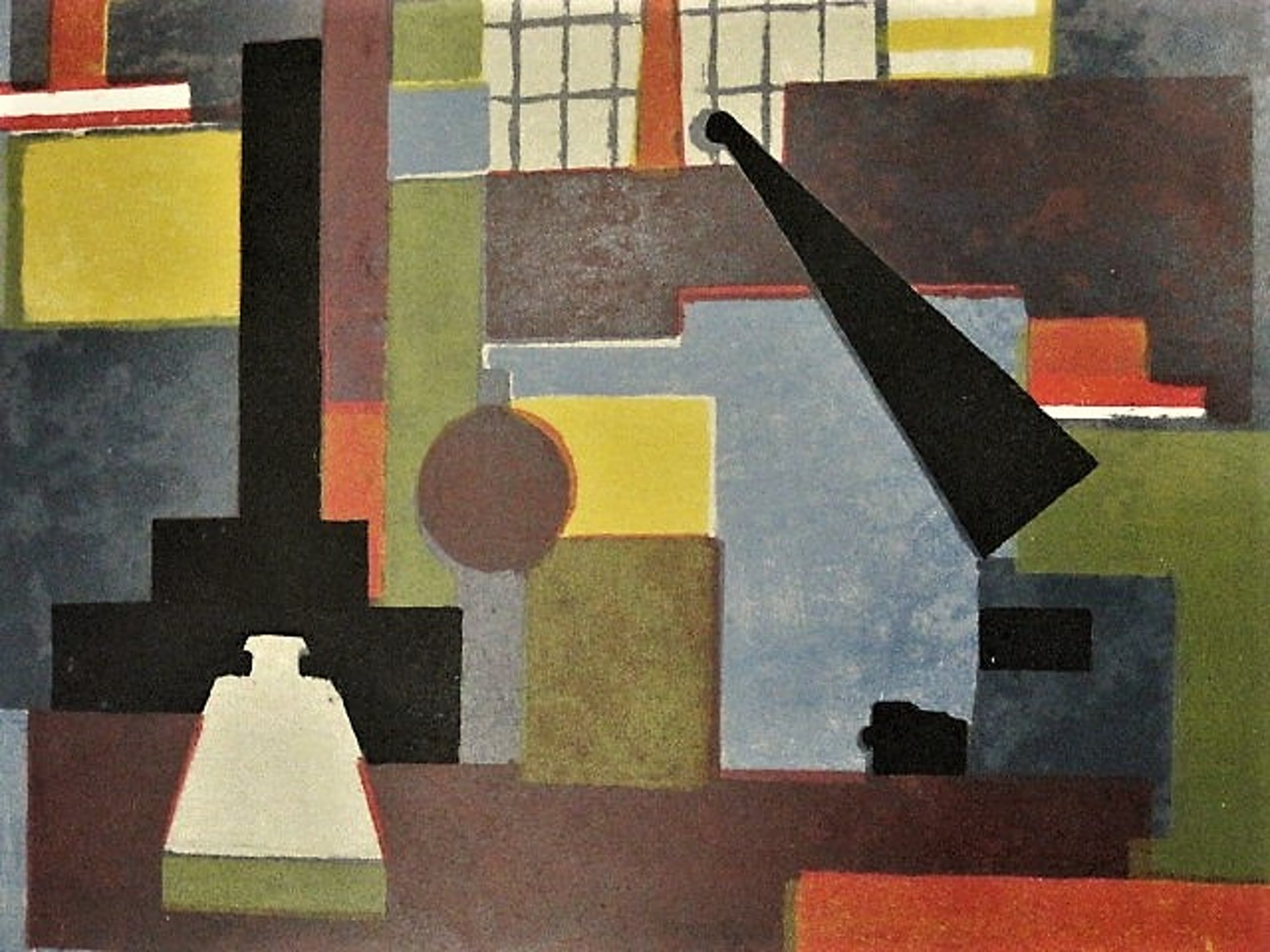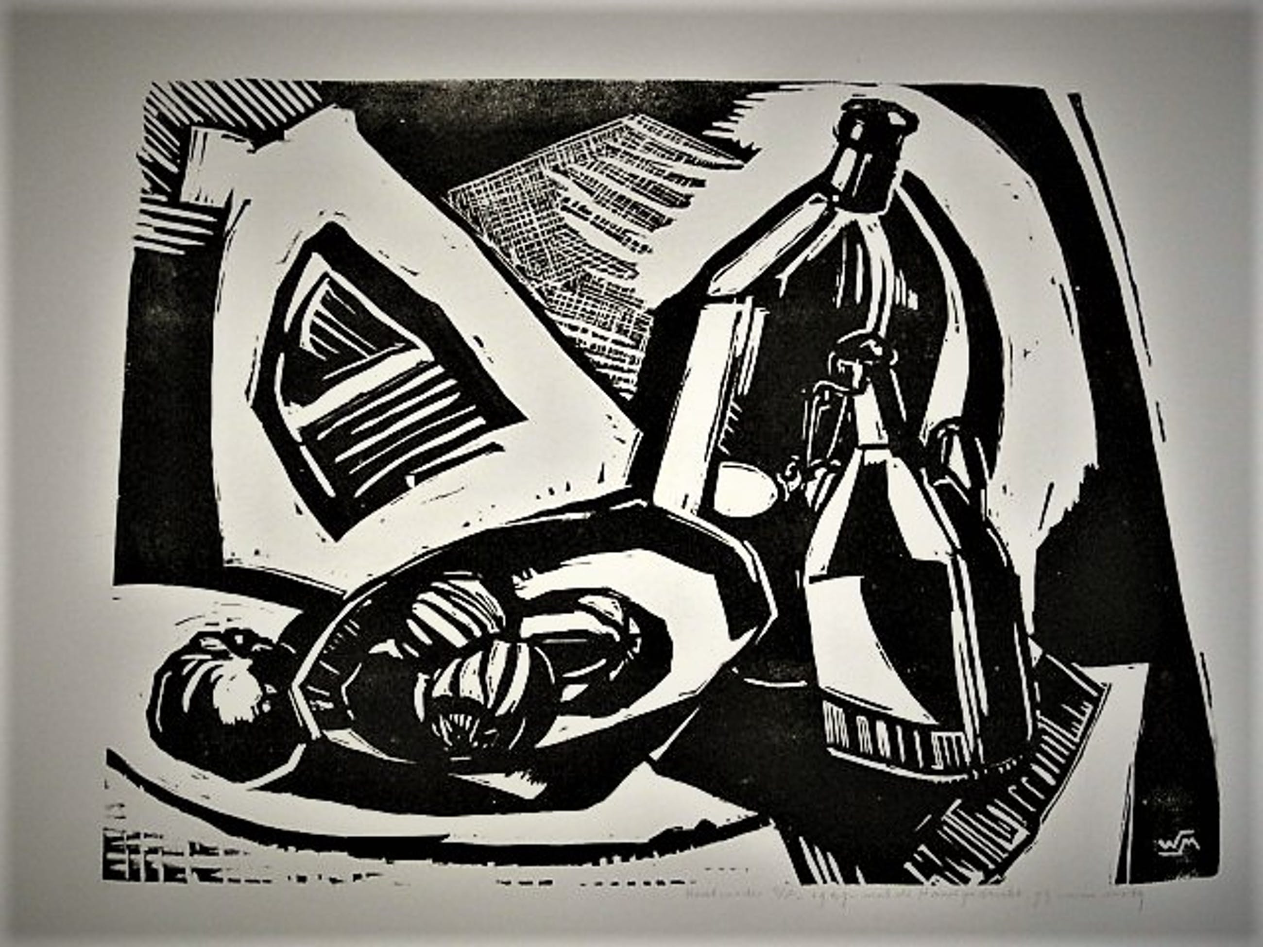 Tweemaal wim Motz! Een handgekleurde Lithografie "Haven met tanker" en een zeer kleine oplage (8 ex) handgedrukte Houtsnede "Stilleven" uit 1949.