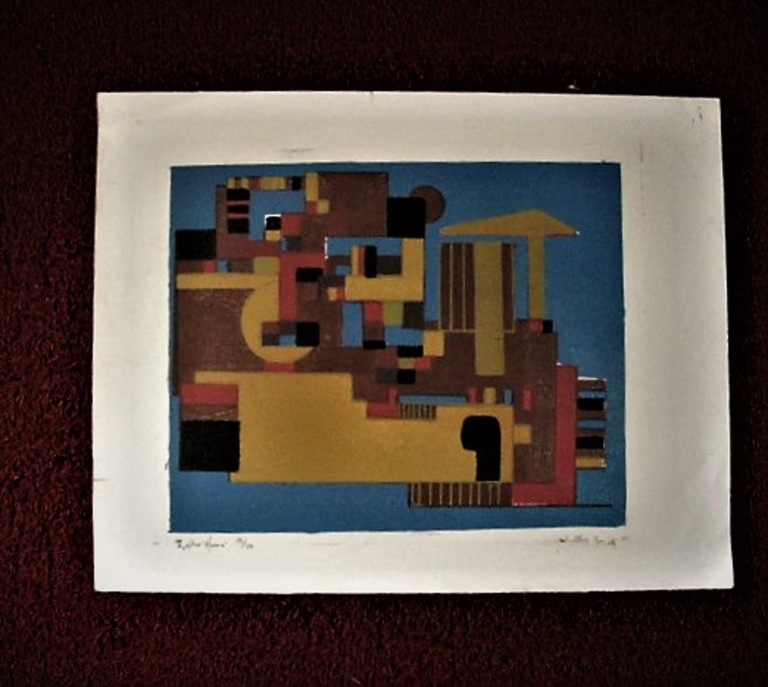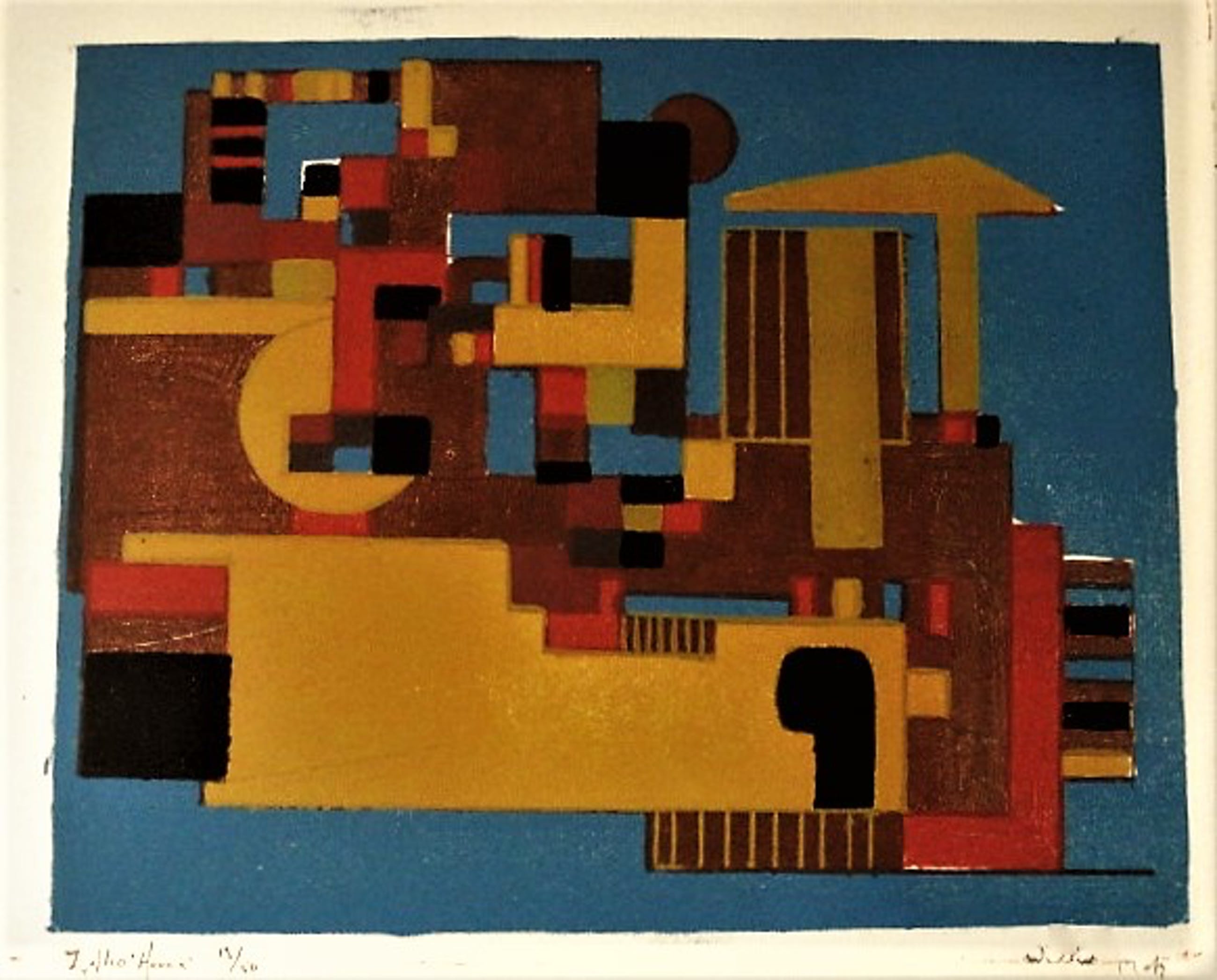 Tweemaal wim Motz! Een handgekleurde Lithografie "Haven met tanker" en een zeer kleine oplage (8 ex) handgedrukte Houtsnede "Stilleven" uit 1949.