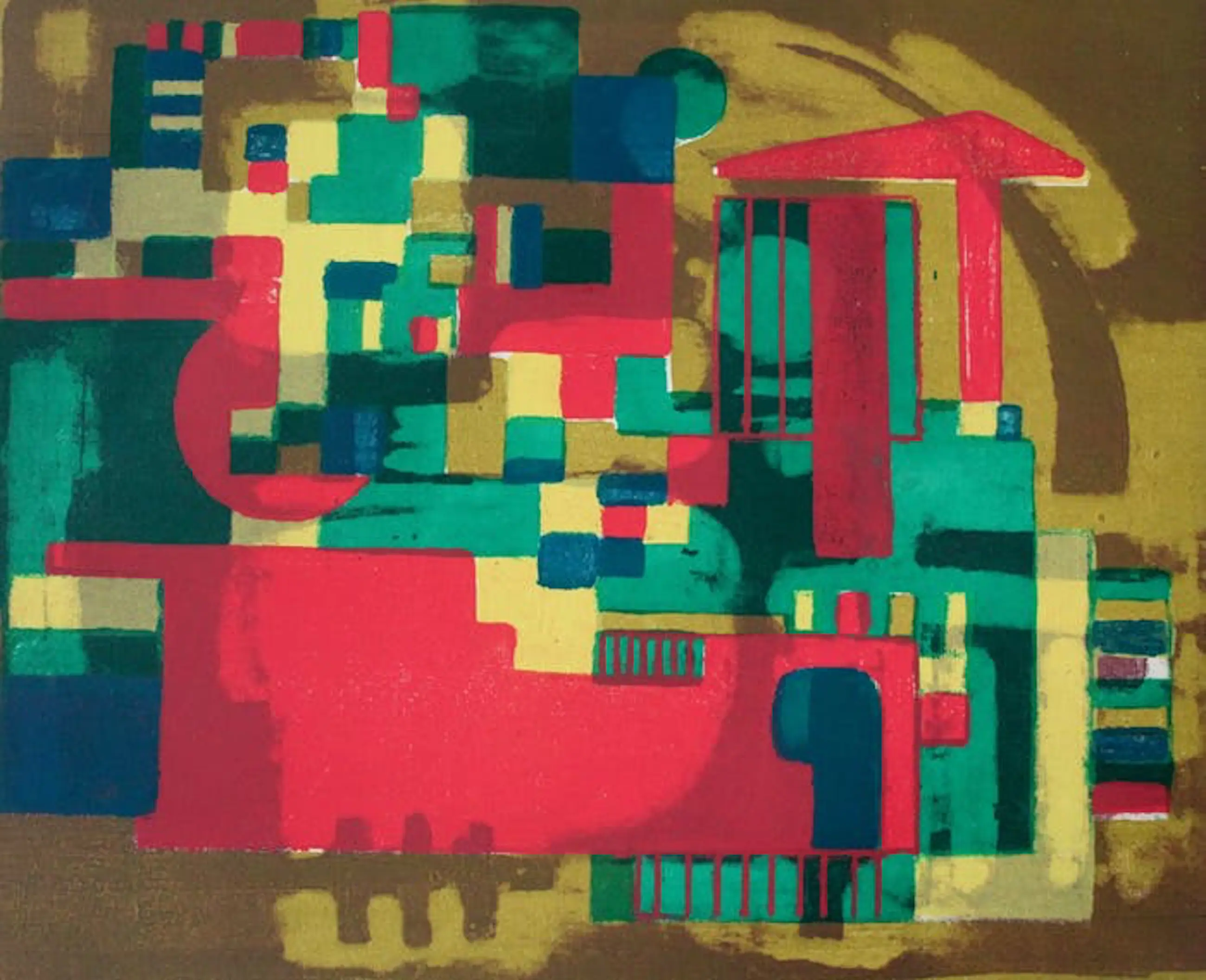 Monotype van Wim Motz, geen titel. (Een monotype is een eenmalige afdruk) het beeld wordt met verf op glas of metaal geschilderd (zie schilderen), als de verf nog nat is wordt er een afdruk gemaakt; het oppervlak van een glas-, metaal- of hardboardplaat wordt met drukinkt ingerold, papier erop, tekenen; alleen waar getekend is neemt het papier de drukinkt over.)