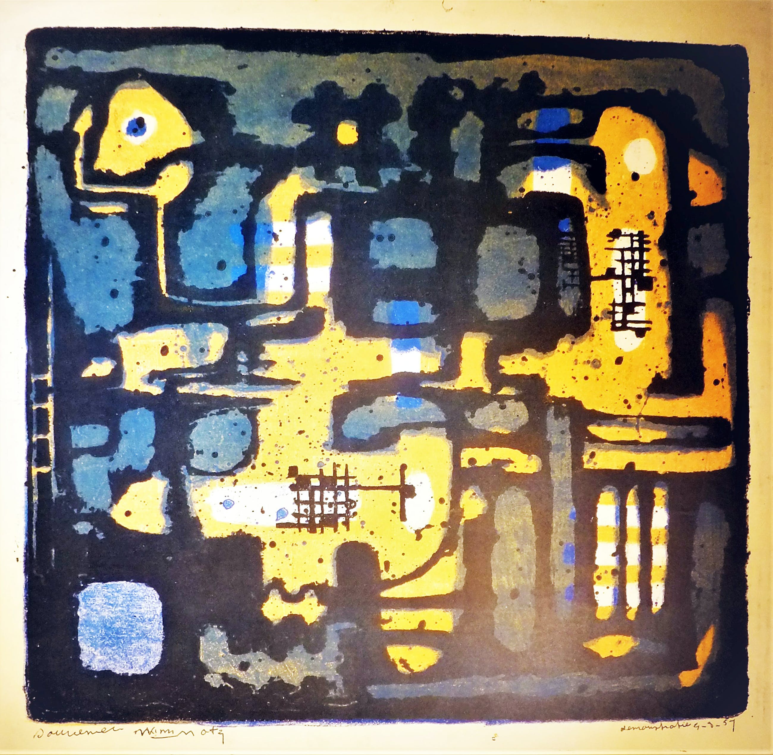 Wim Motz was een bekende na-oorlogse kunstenaar uit Rotterdam-Zuid. Deze prent is niet genummerd - het is waarschijnlijk en demonstratie prent. De prent is wel gesigneerd en zeer precies gedateerd.