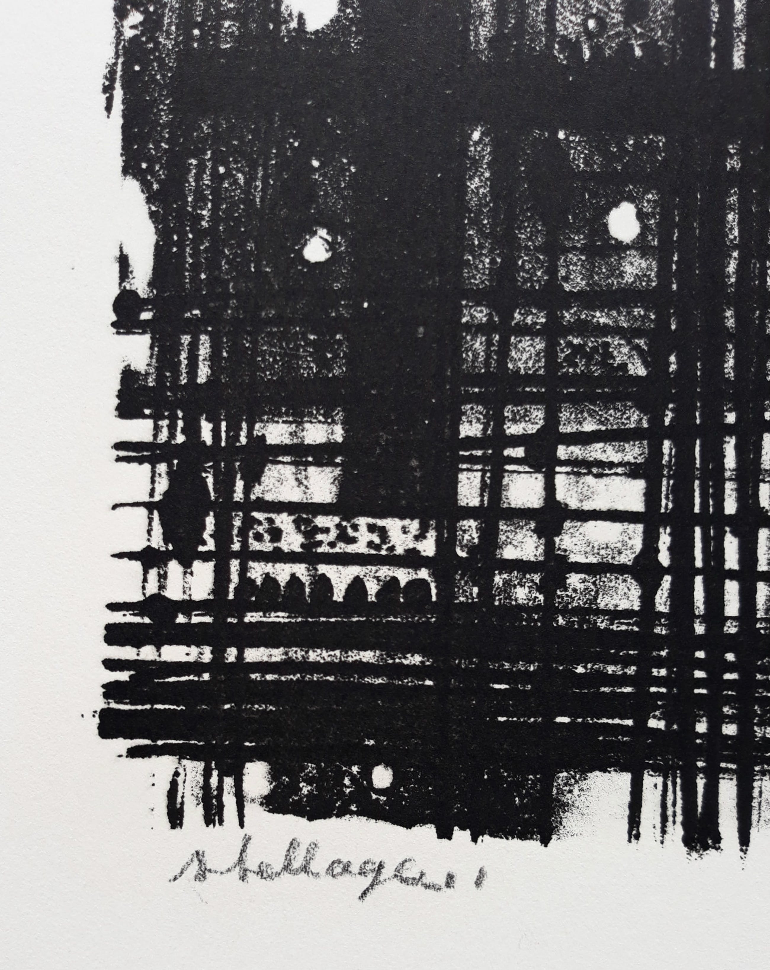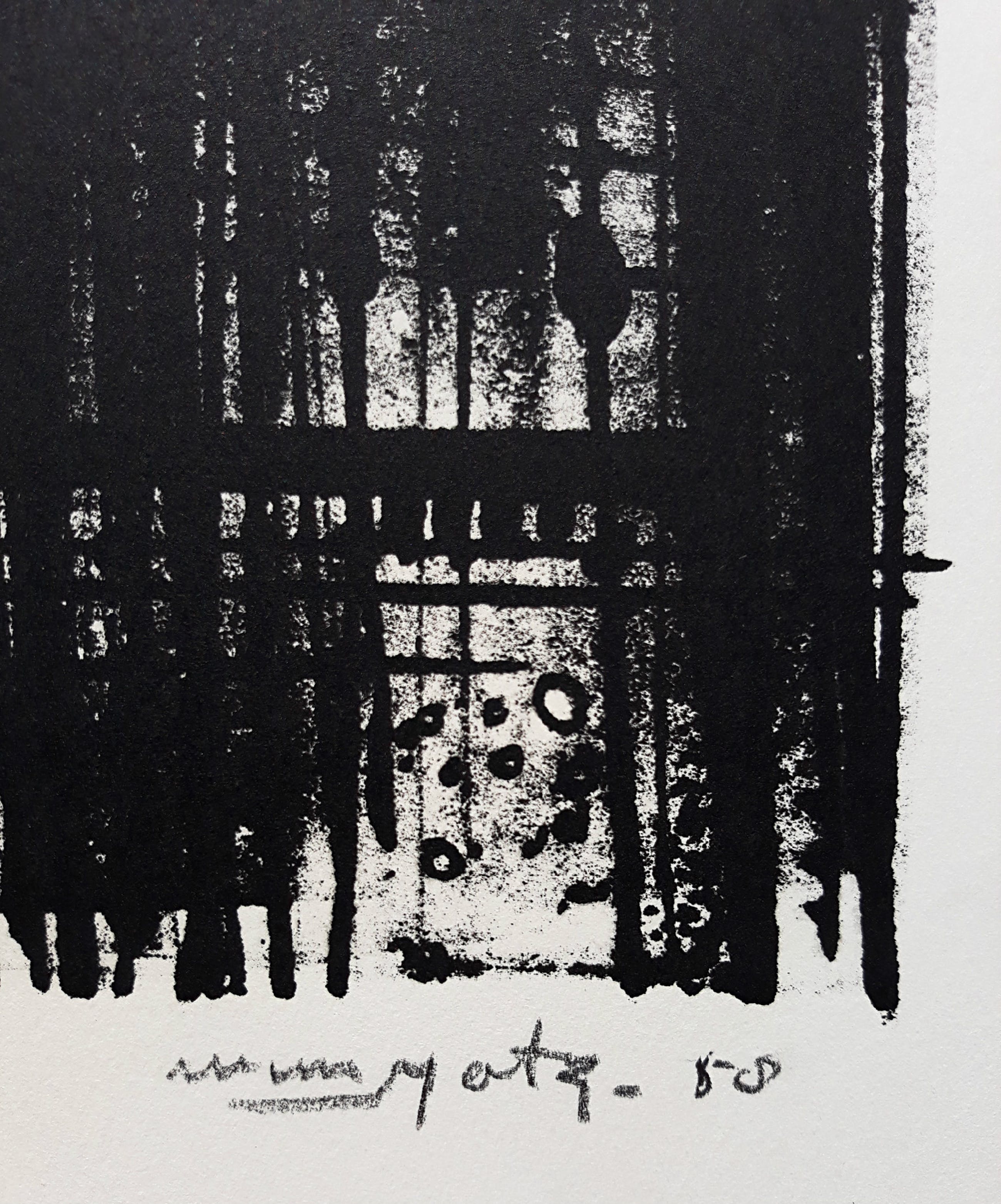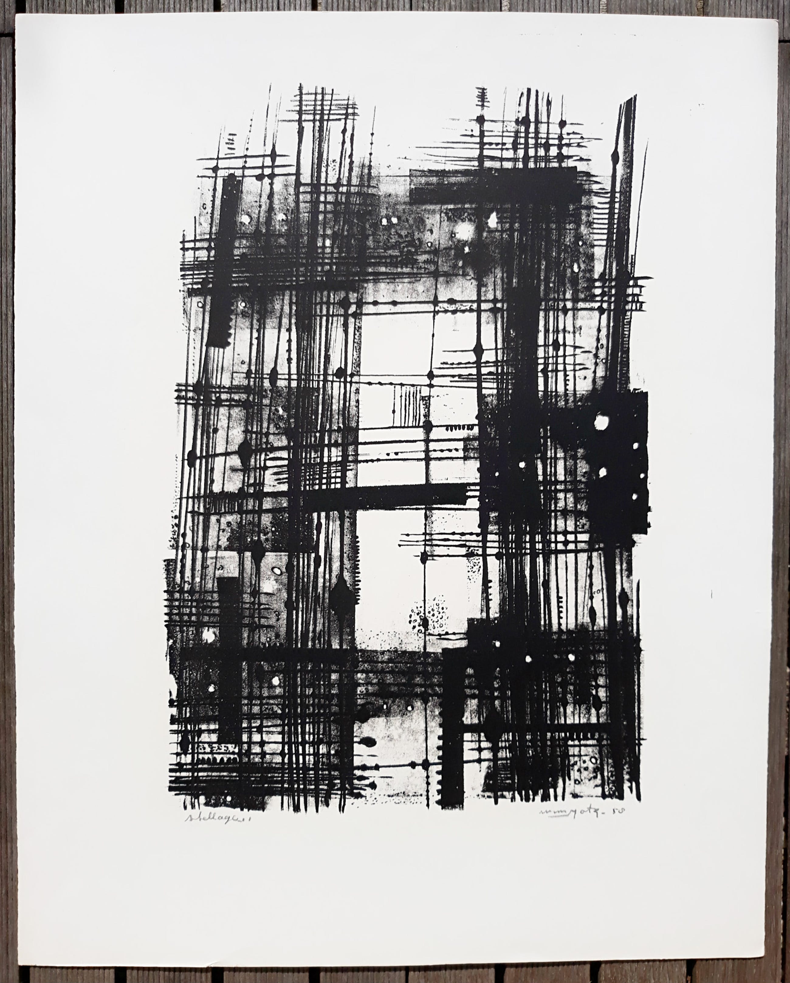 Strak Z/W werk van Wim Motz. Litho op geschept papier, met potlood gesigneerd, gedateerd (‘58) en getiteld (“Stellage”). In zeer goede conditie.