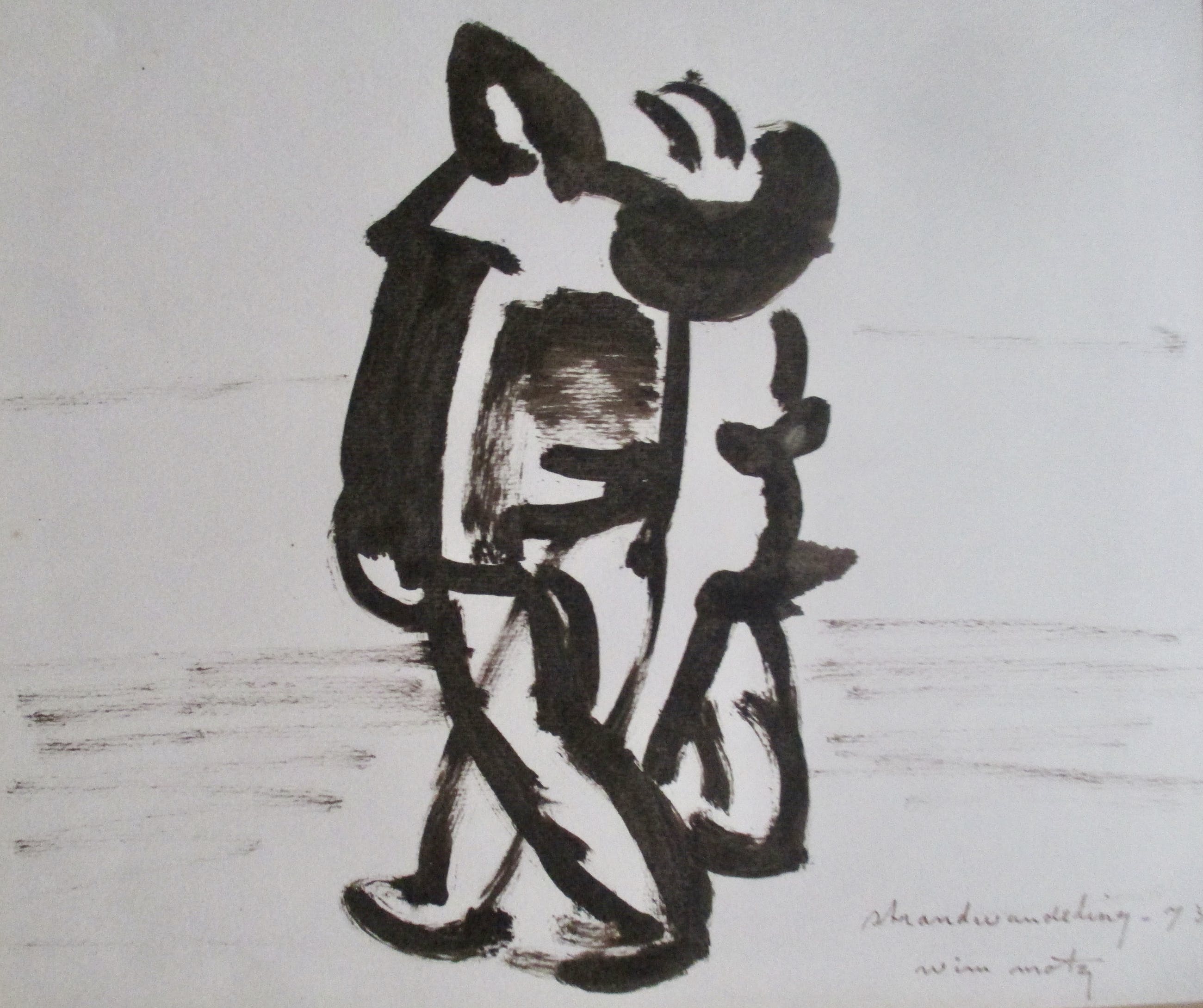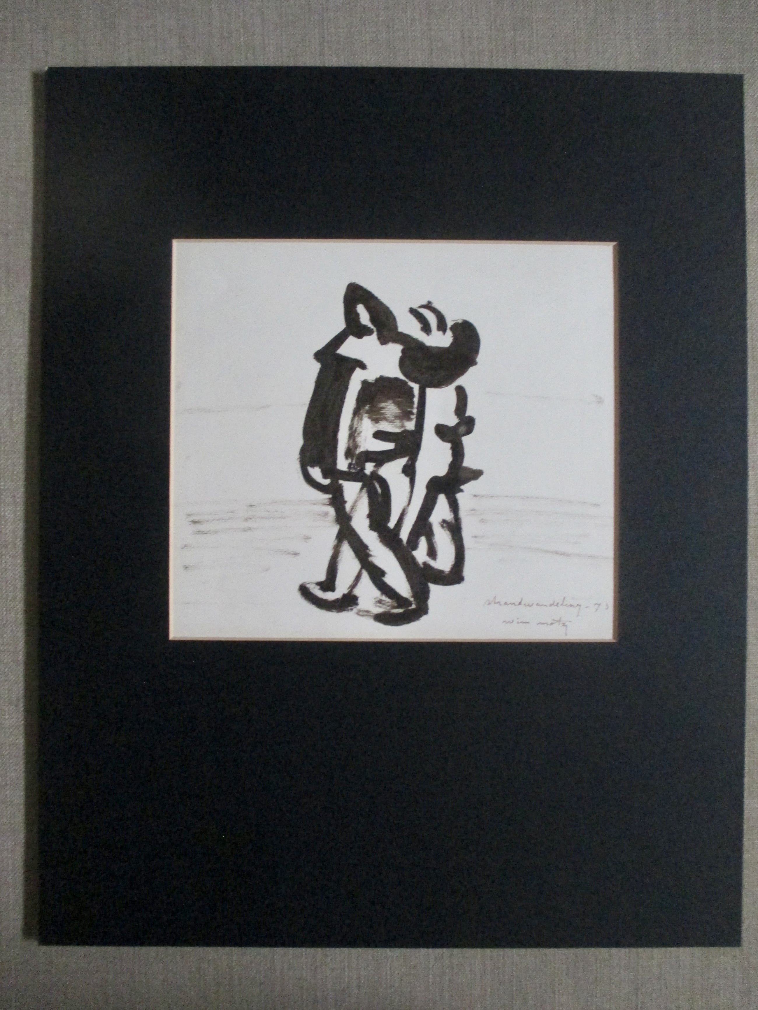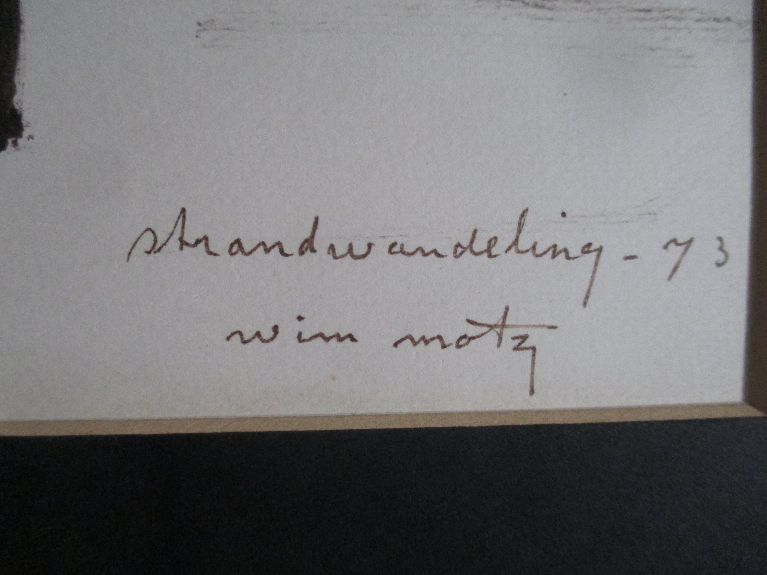 Penseeltekening van Wim Motz, gesigneerd, gedateerd en getiteld in pen. Geplaatst (bovenaan getipt) achter passe-partout.
