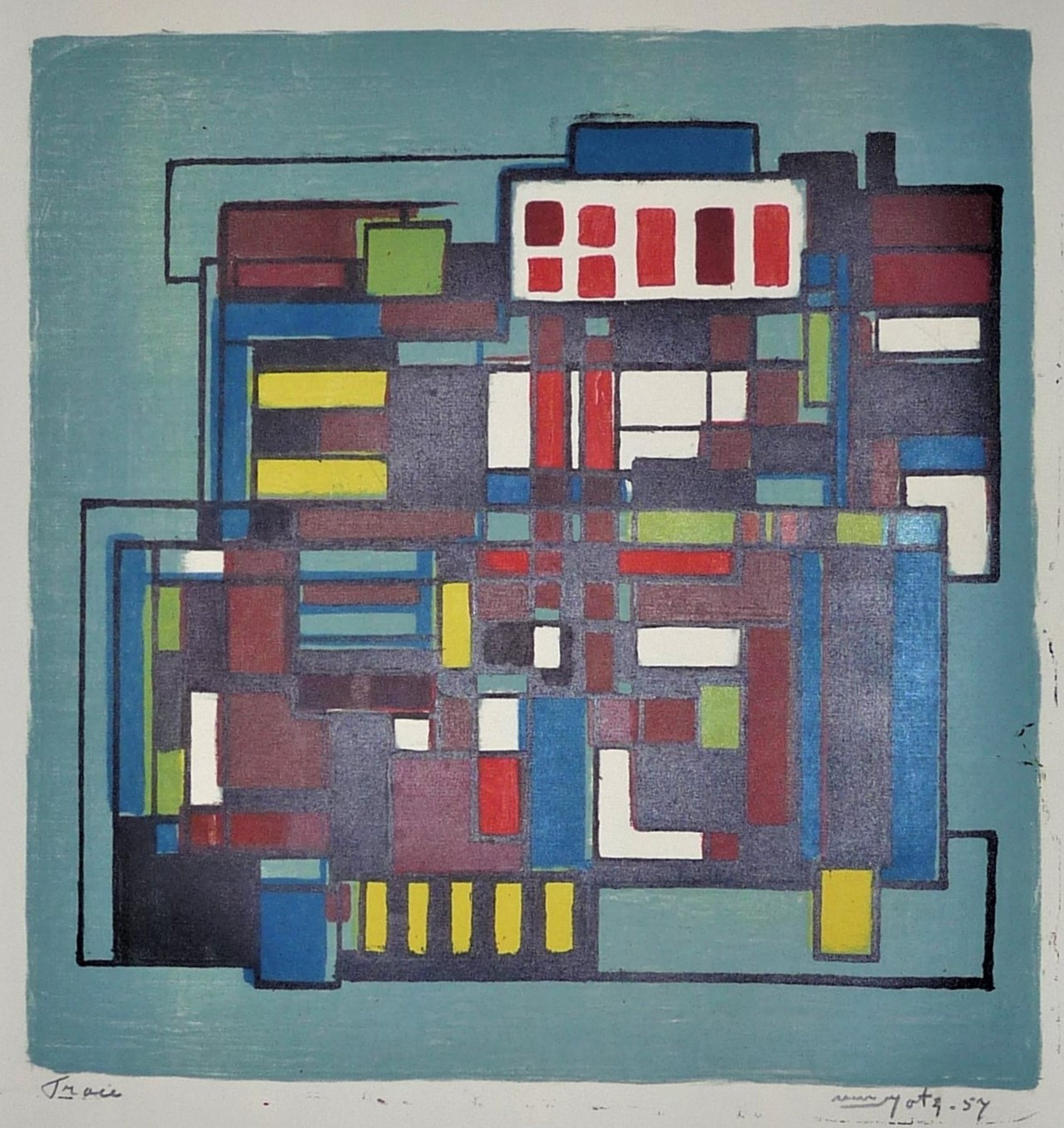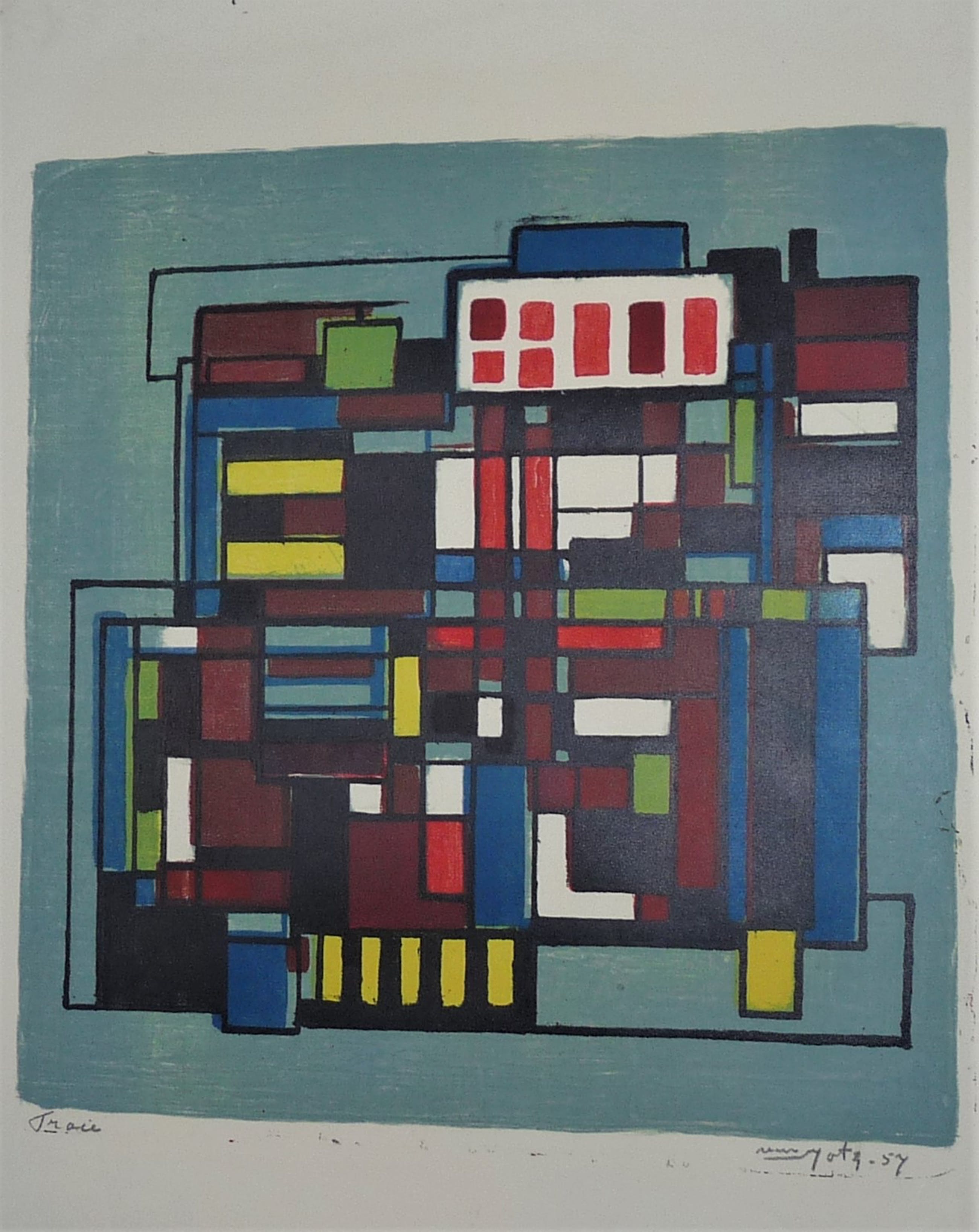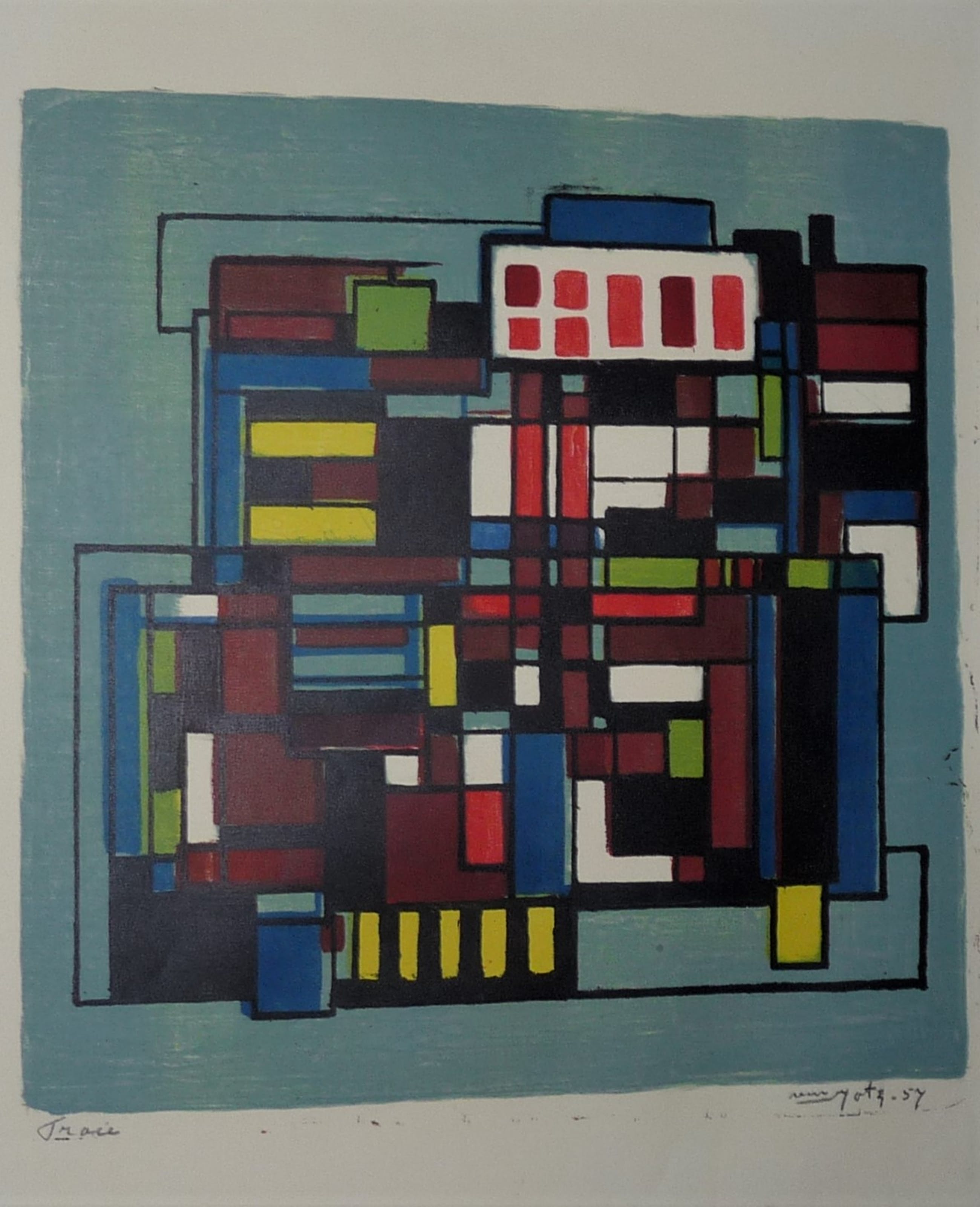 *Kleurig abstract werk van de bekende Rotterdamse kunstenaar Wim Motz. *L.o.in potlood: Troie. R.o. in potlood gesigneerd en gedateerd : Wim Motz - 57 *Deze prent komt uit een reeks werken uit nalatenschap van de kunstenaar. Authenticiteit wordt volledig gegarandeerd.
