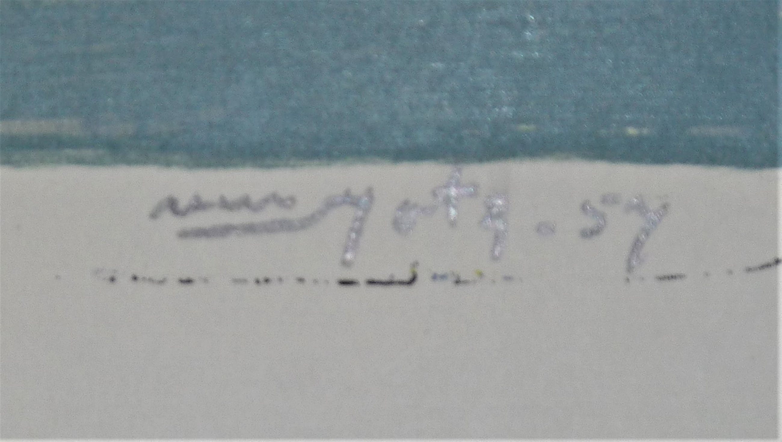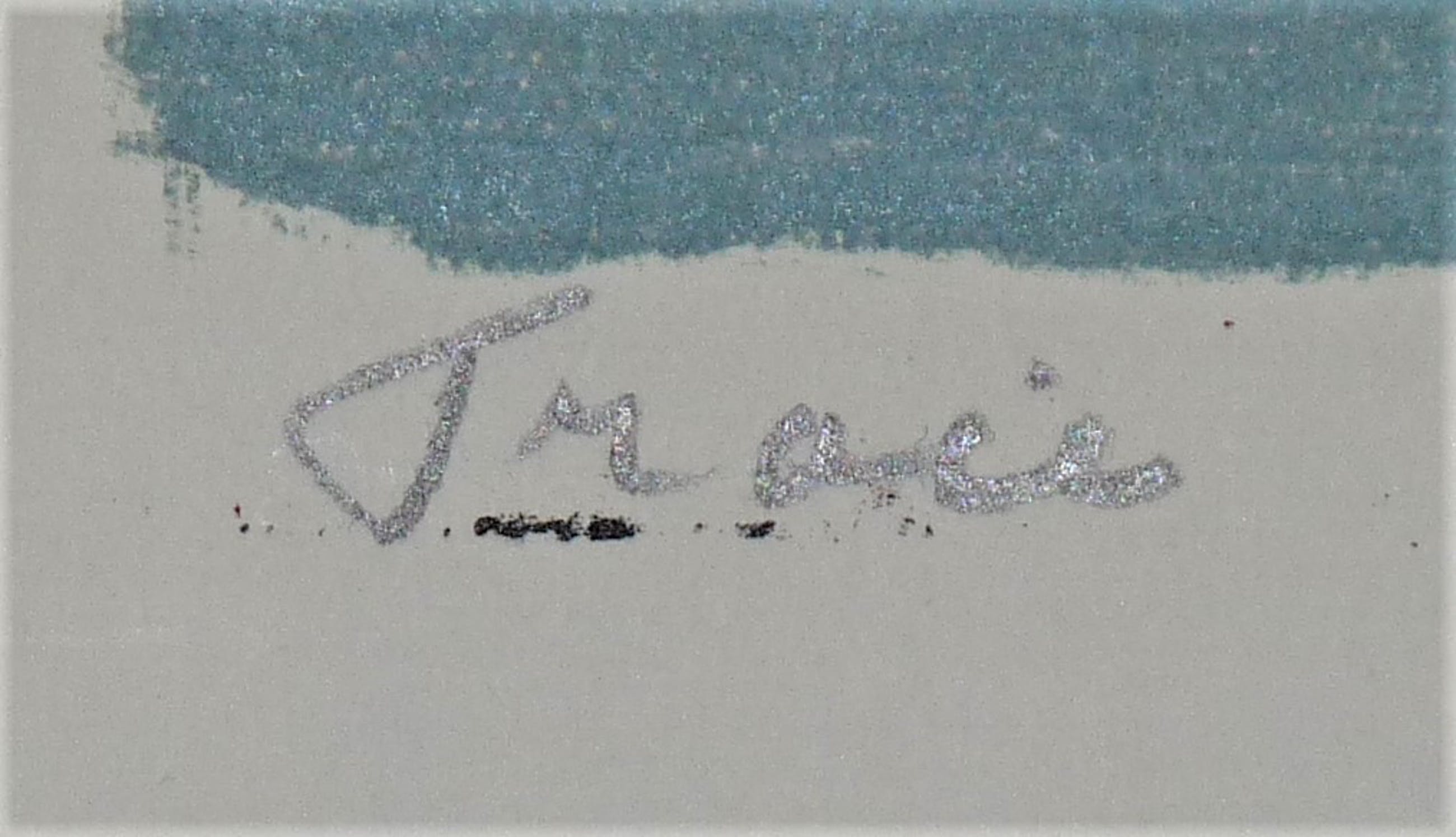 In de witranden buiten het beeld enige verfspoortjes bij het drukken ontstaan van de lithosteen(randen). Goed ingelijst met passe-partout is hier niets meer van te zien.