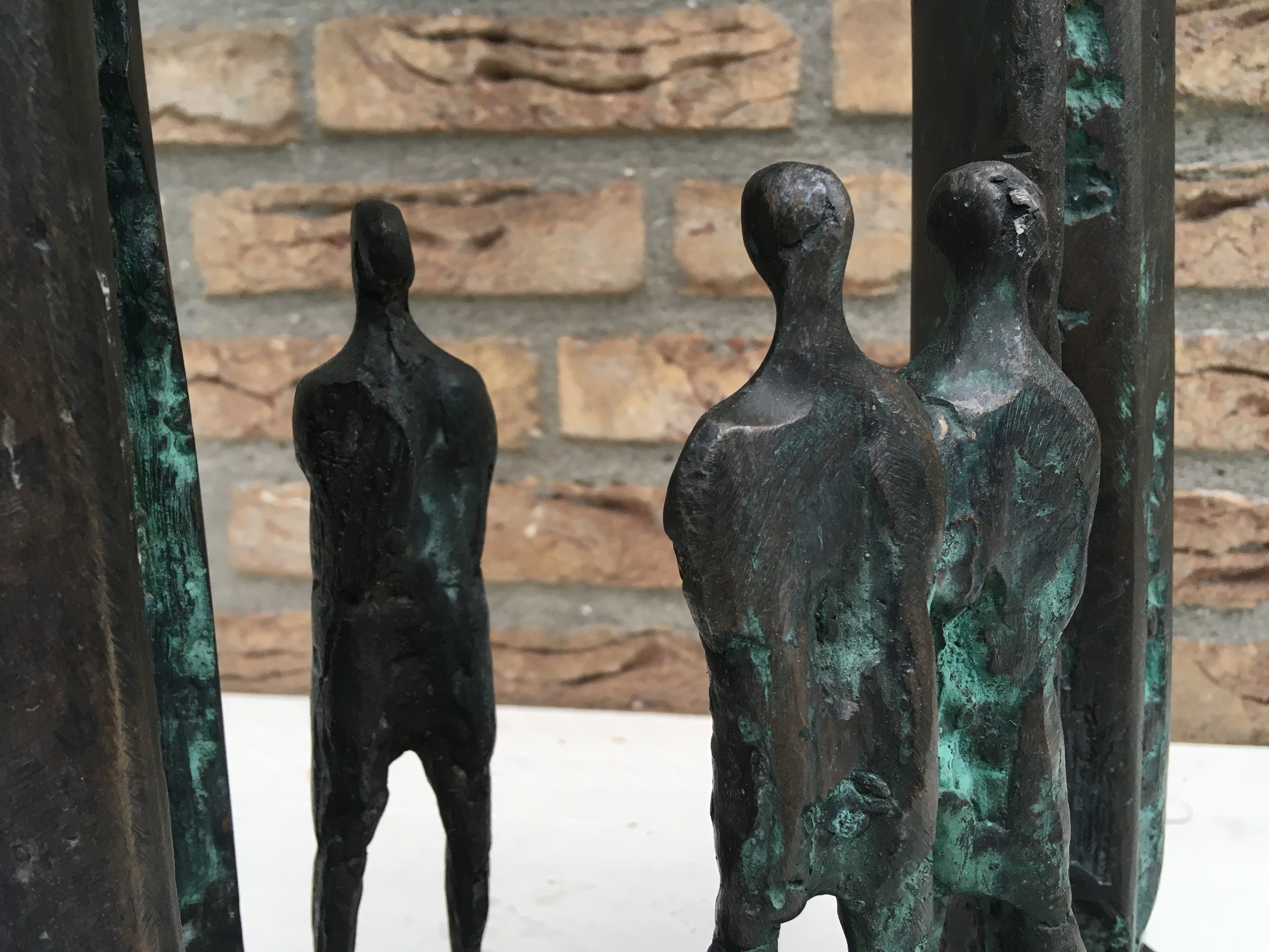 Zeer mooi kunstige uitbeelding van 3 mensen . Ik zie het als de ontmoeting en verder een tijdloos ontwerp. Vooral in de tijd waar we nu in zitten zeer toepasselijk.