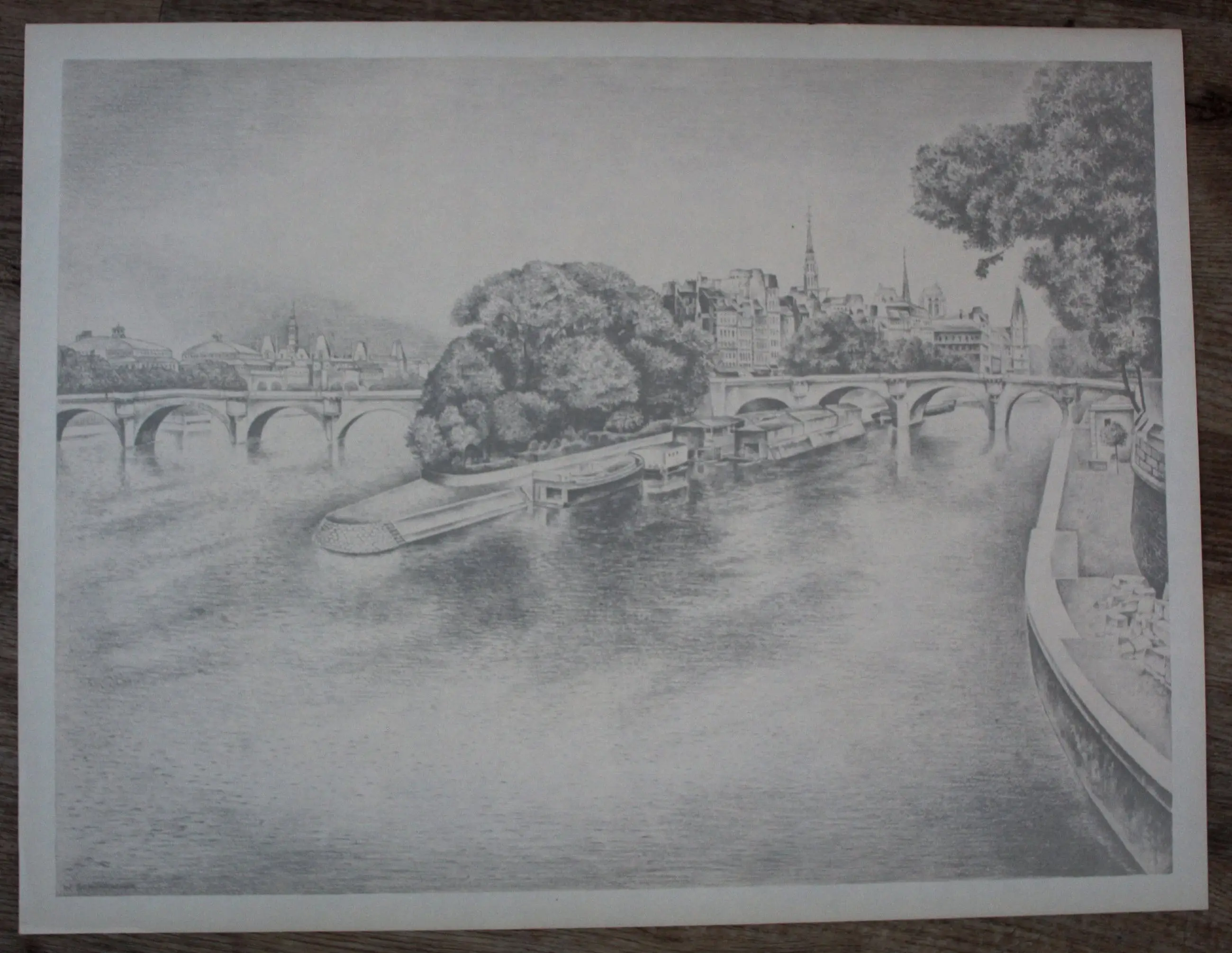 Kleurenlitho van Wim Schuhmacher uit de serie schildersprenten uit 1947. Titel: Ile de la Cite. Afmetingen blad: H48 x b63cm. Afmetingen voorstelling: H44 x b59cm. Het werk is linksonder, in de druk, gesigneerd door de kunstenaar. De authenticiteit van het aangeboden werk wordt volledig gegarandeerd. Een certificaat van echtheid kan, op aanvraag, worden gemaild.