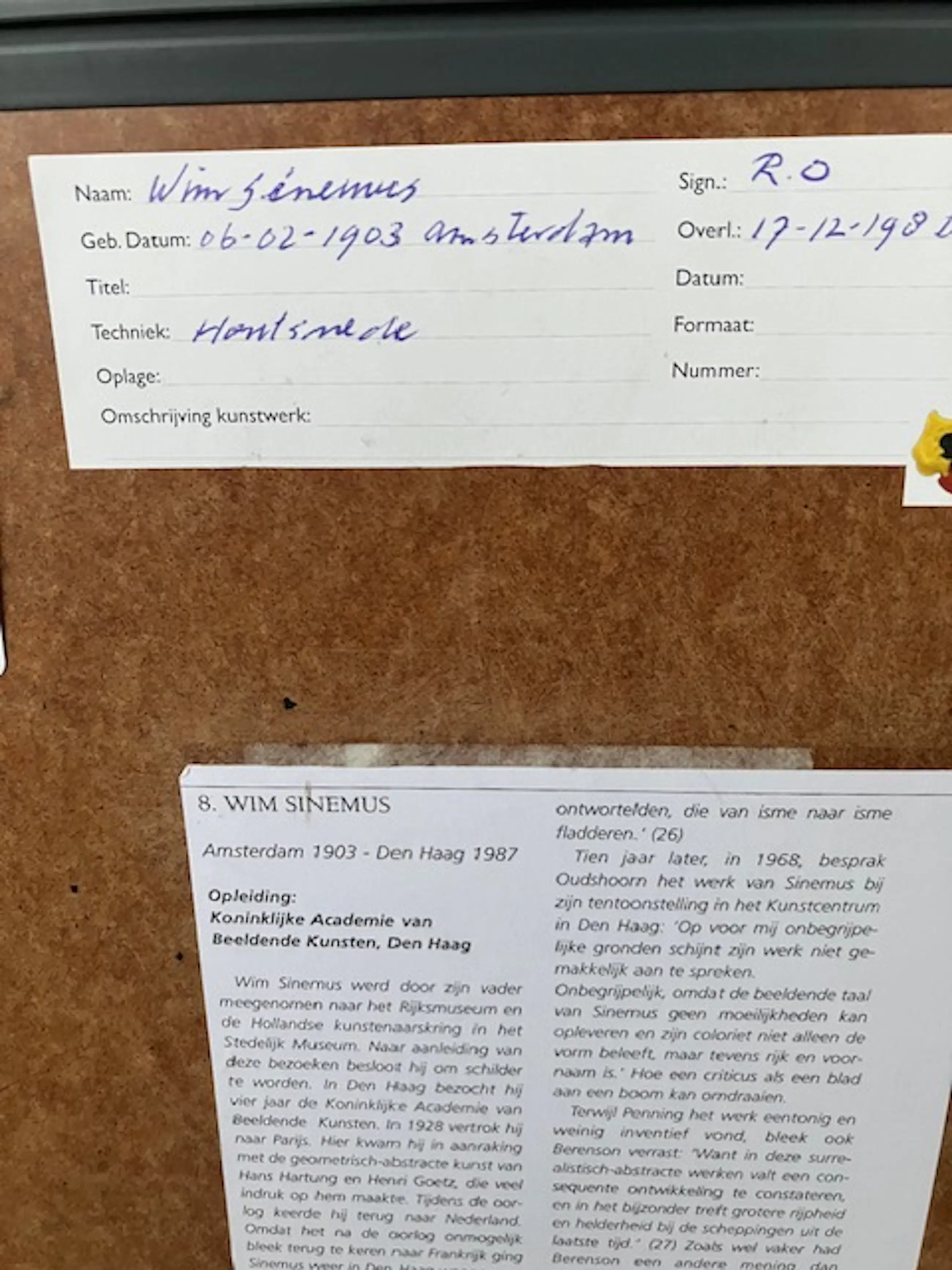 Aangeboden werk is een houtsnede, vermoedelijk uit de vroegere periode van deze bijzondere kunstenaar. Het werk van Sinemus wordt verzameld, ook internationaal. Werk komt in een fraaie lijst en kan direct worden opgehangen.