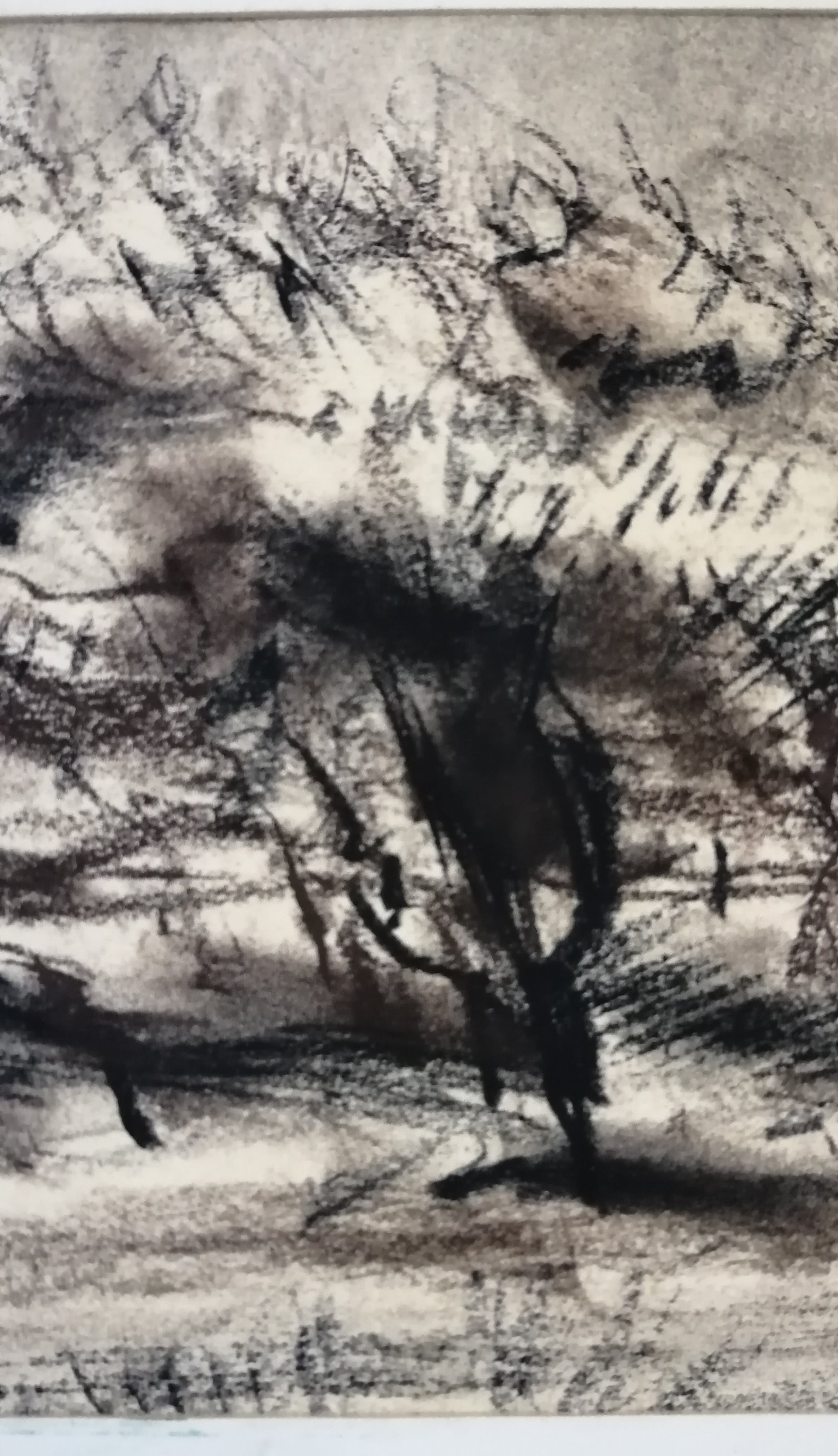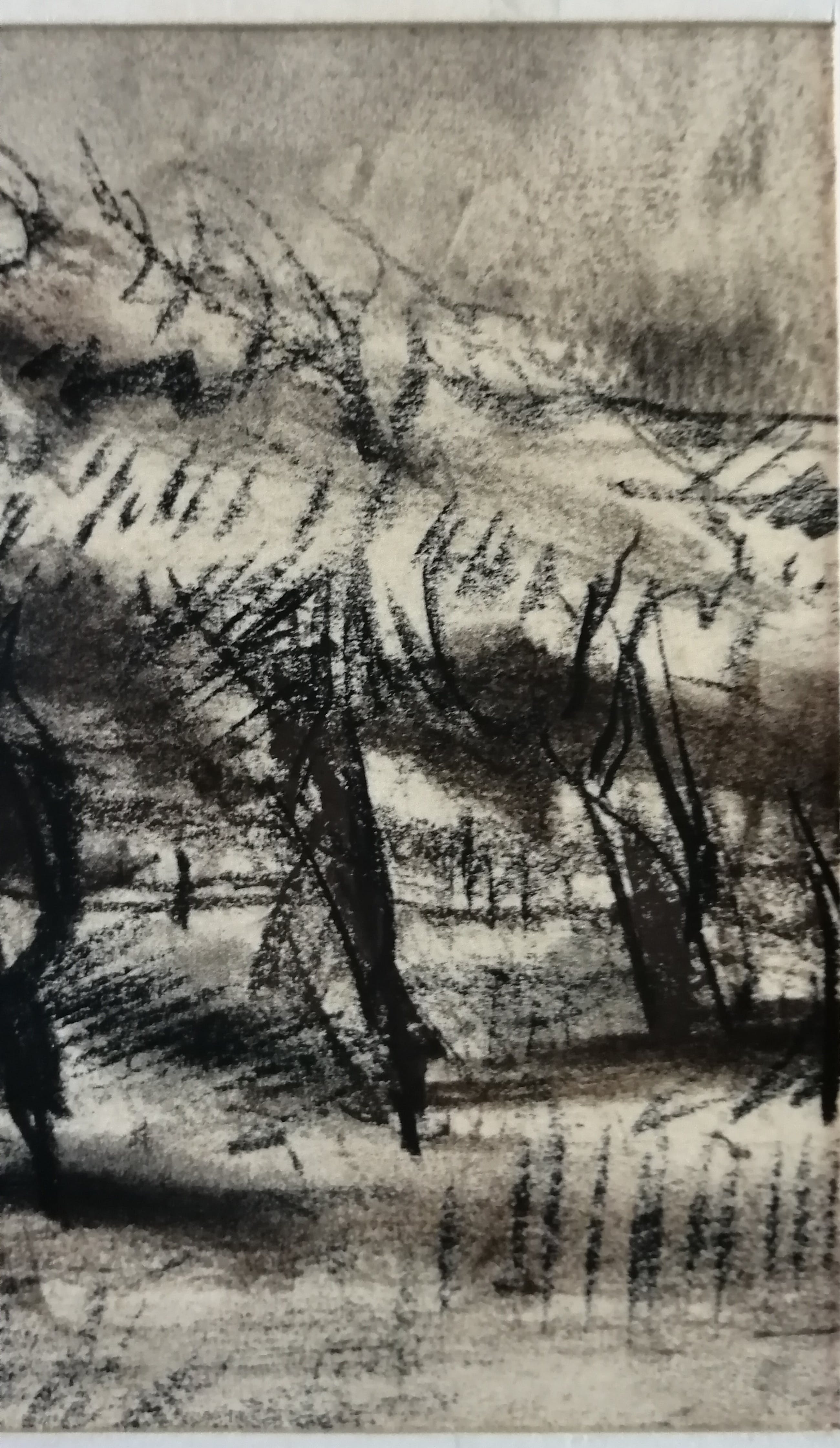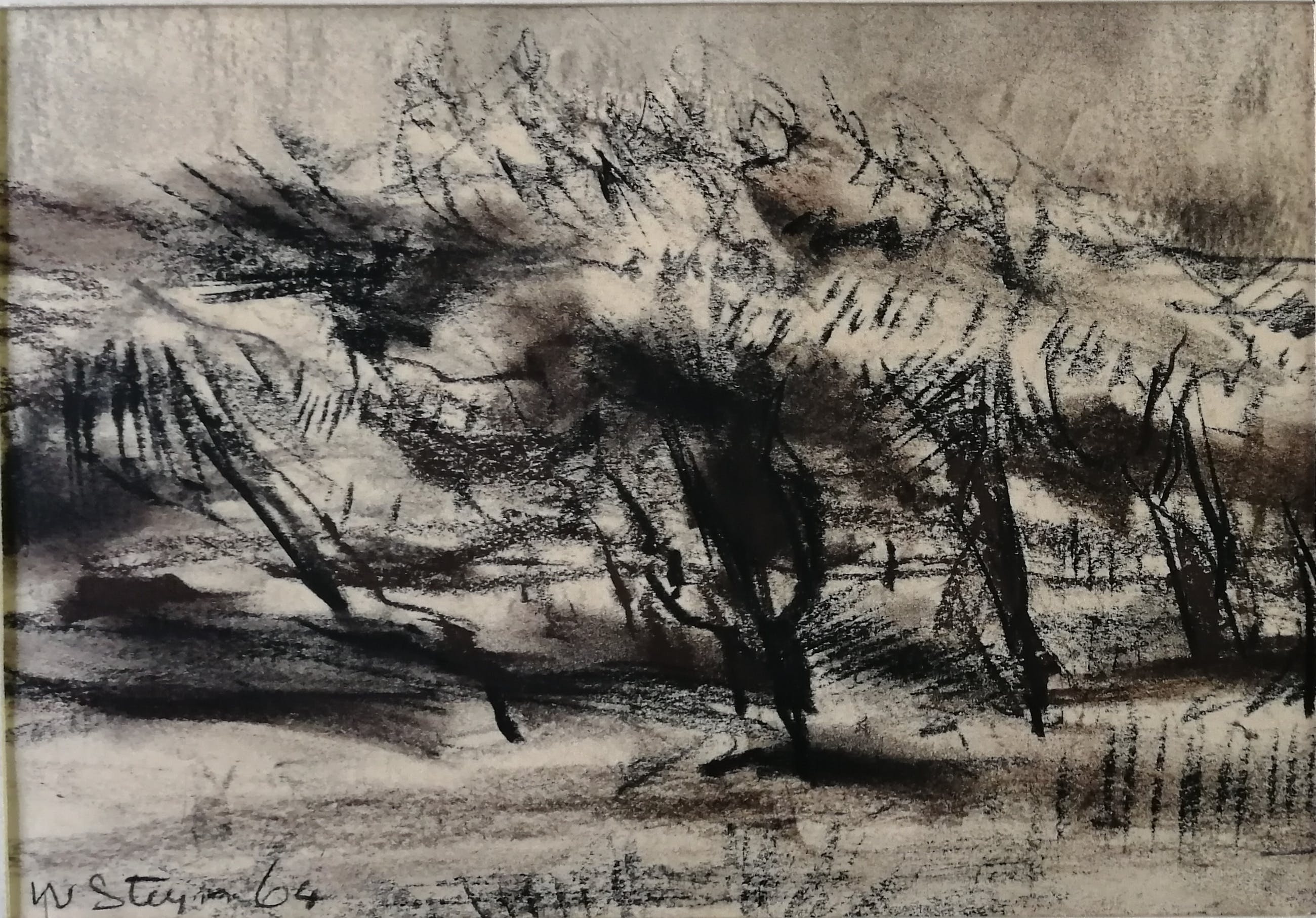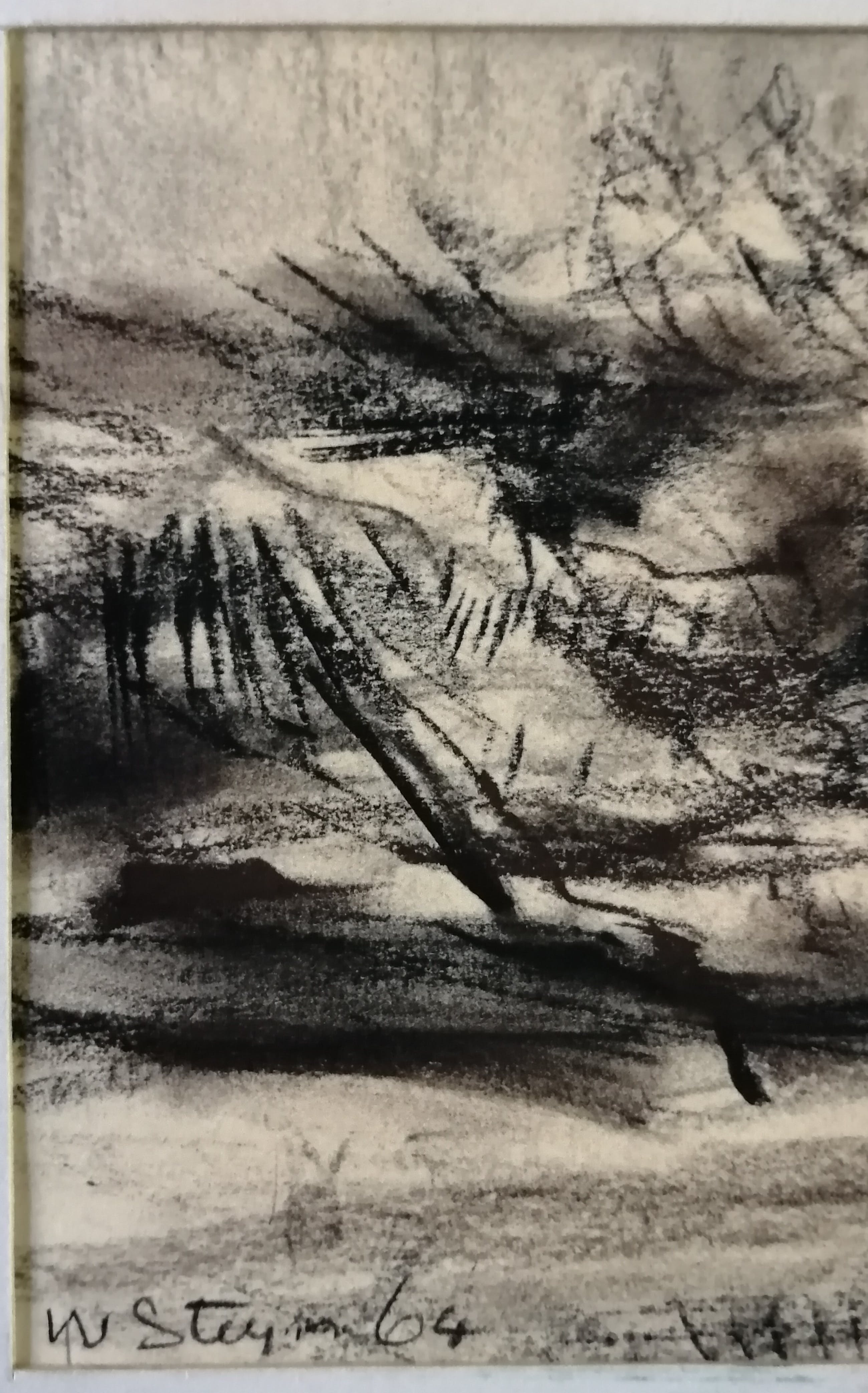 Zwart krijttekening uit 1964. Gesigneerd en gedateerd linksonder. Onder passe-partout. Beeld/Bladmaat 15x21,5 cm.