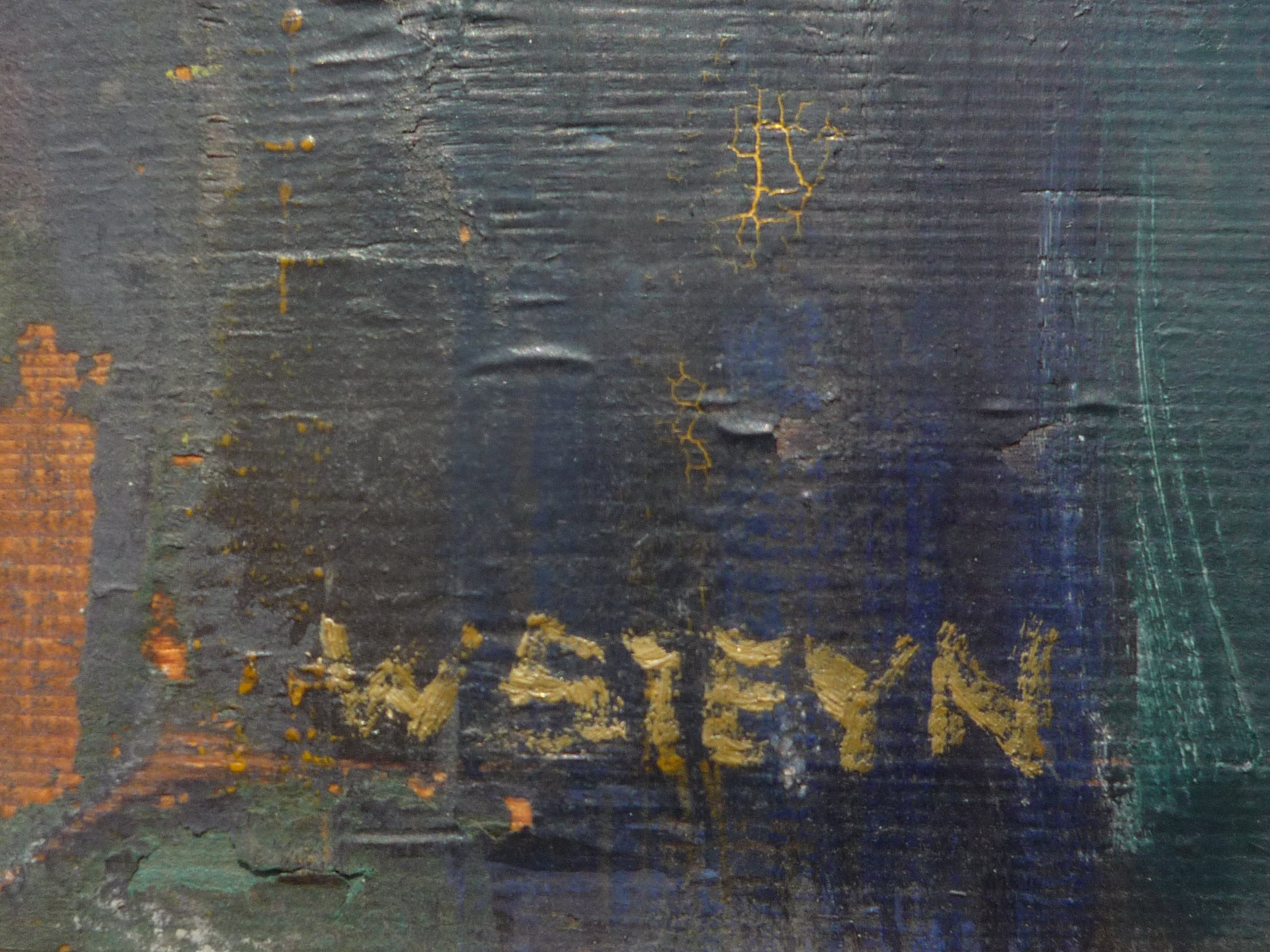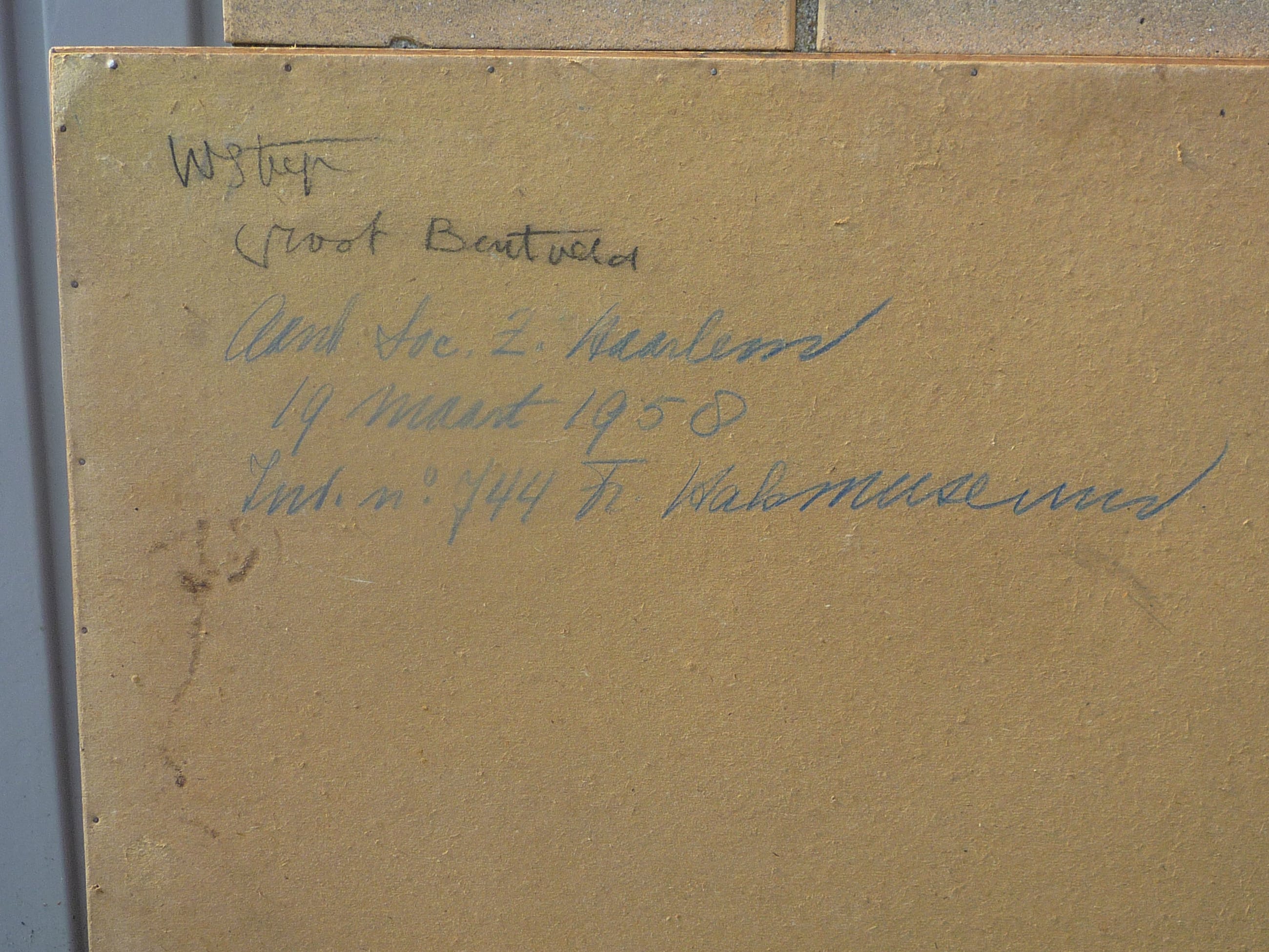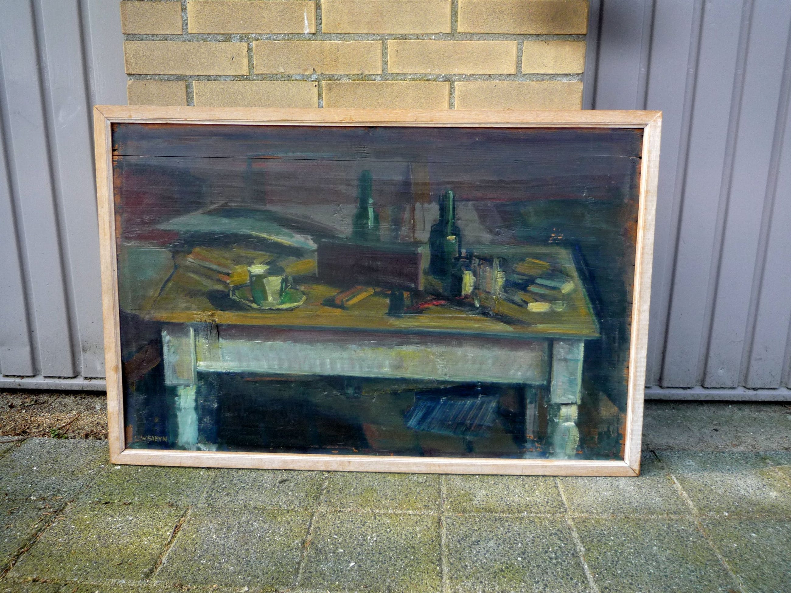 | Het werk is gemaakt op een verweerde plank, er zit ook nog een grote kwast in de plank (rechts van de linker tafelpoot, ter hoogte van het blad, hier en daar een spleetje) De conditie van dit werk is goed, de kunstenaar heeft waarschijnlijk vanwege geldgebrek gekozen voor een slechte plank die voor handen was. De conditie van de lijst is goed, doet zijn werk maar is niet echt van toepassing omdat het een eenvoudige atelierlijst betreft. | |||||||
