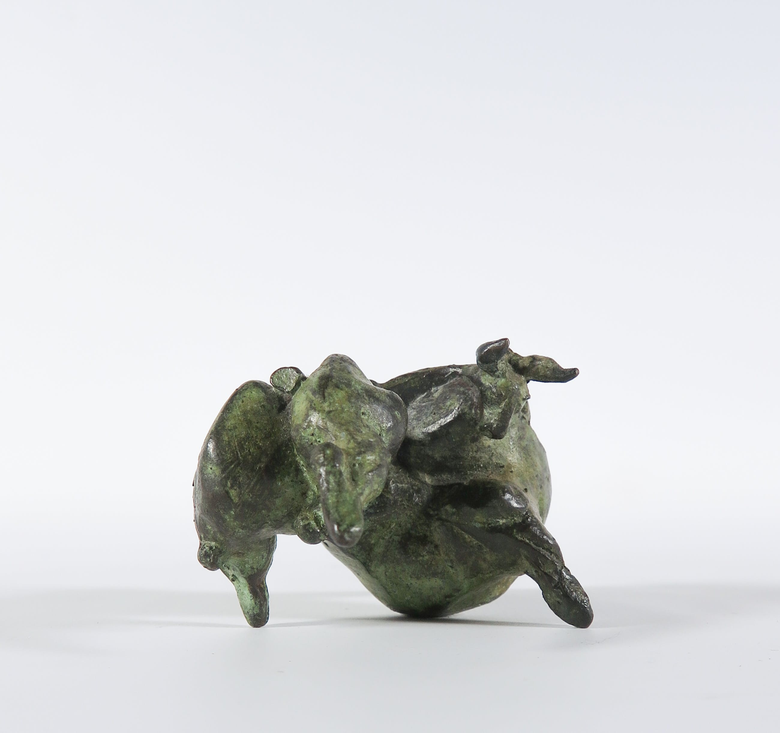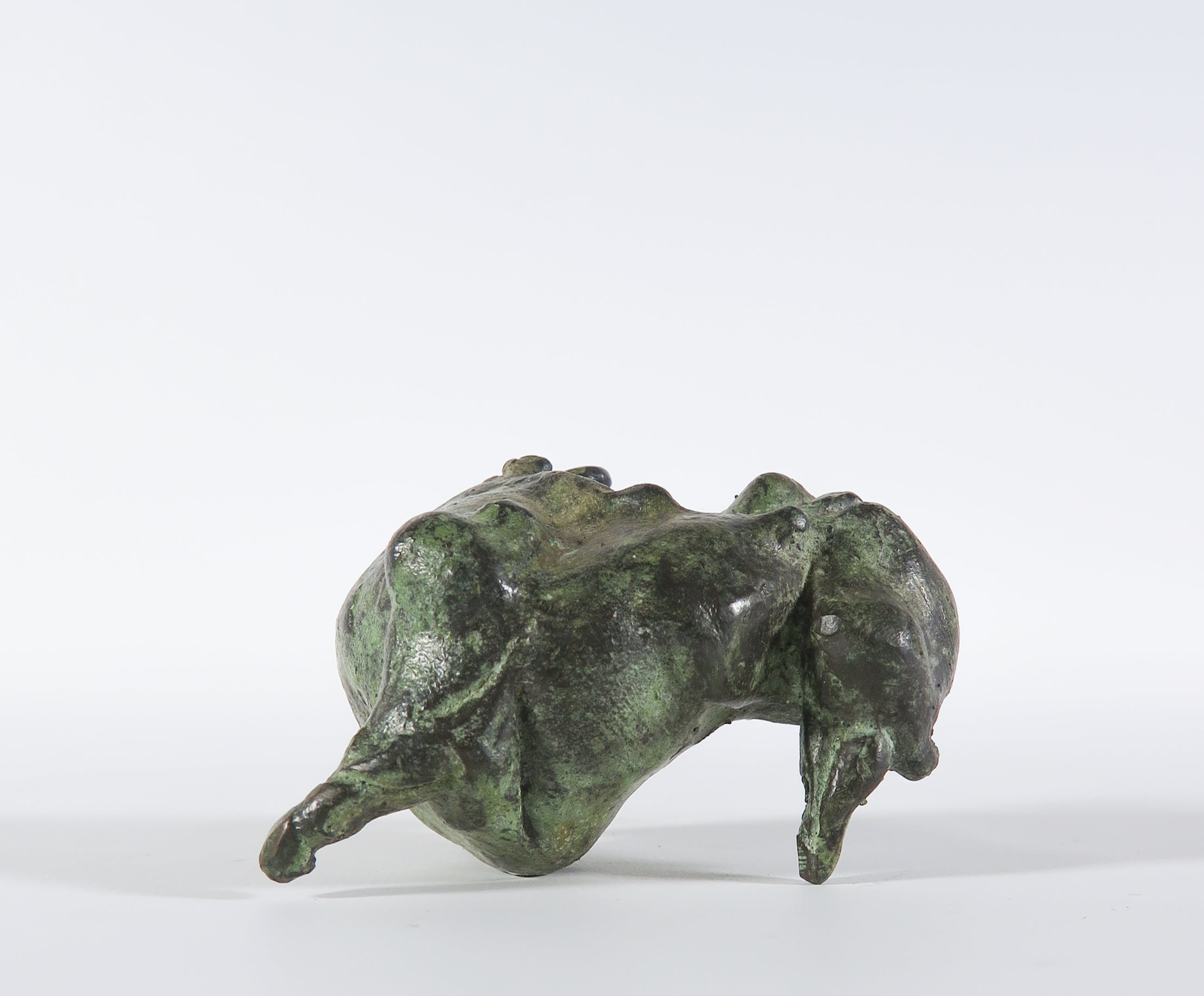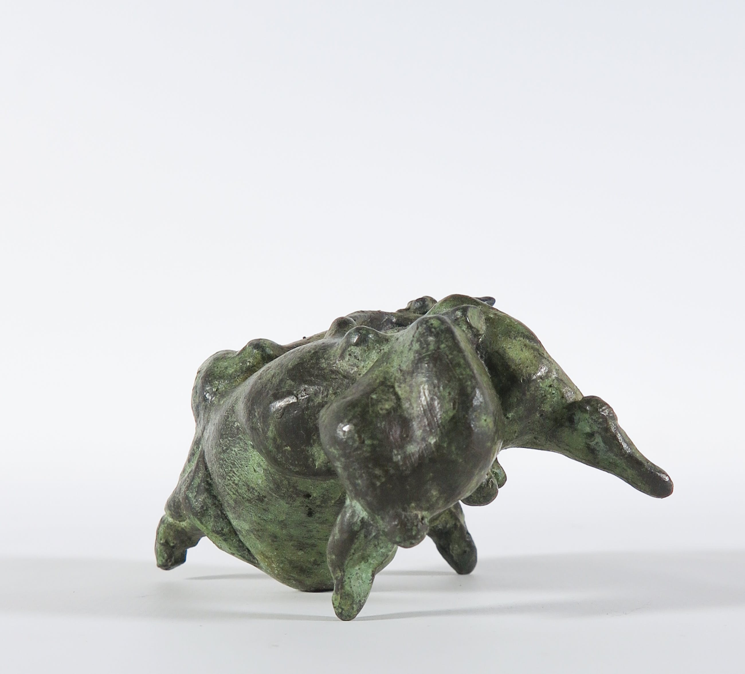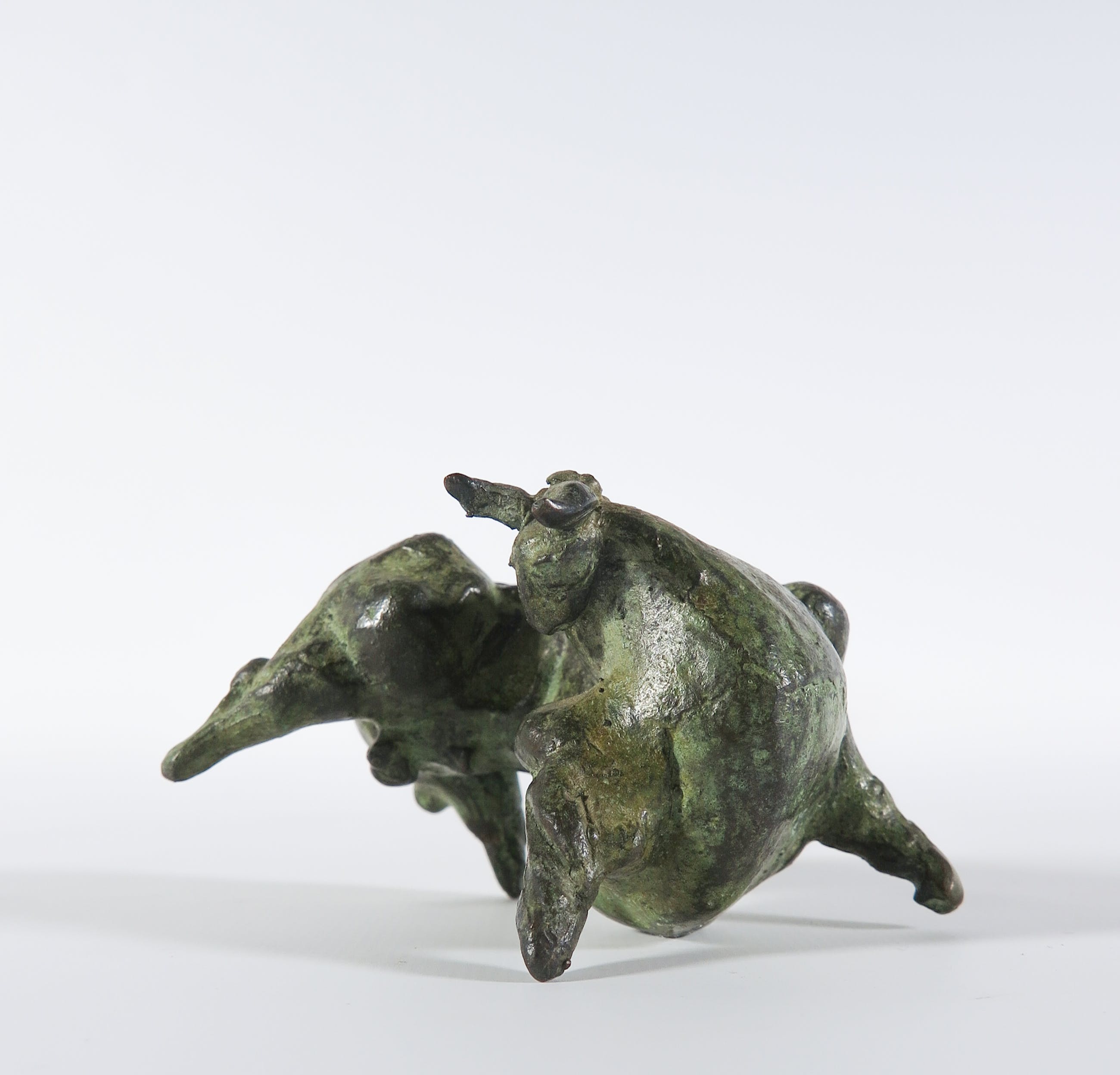 Krachtig vormgegeven stier met groen patina. Een bijzonder kleinood.