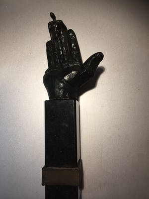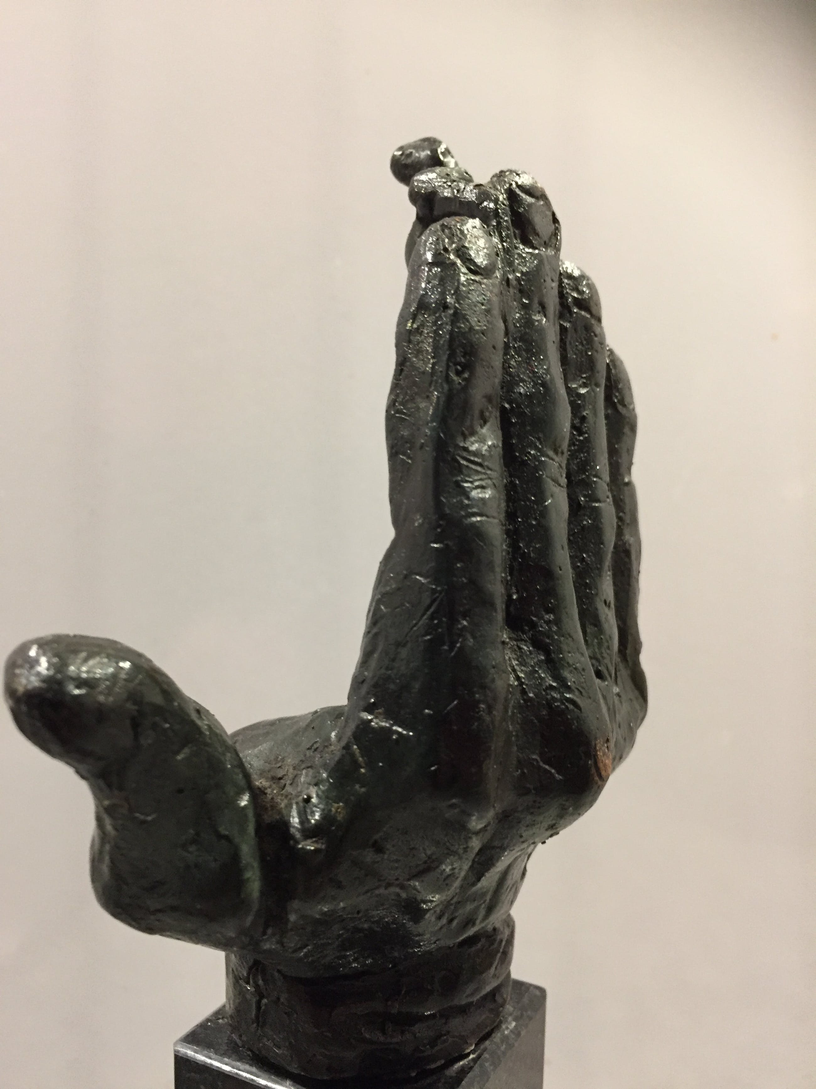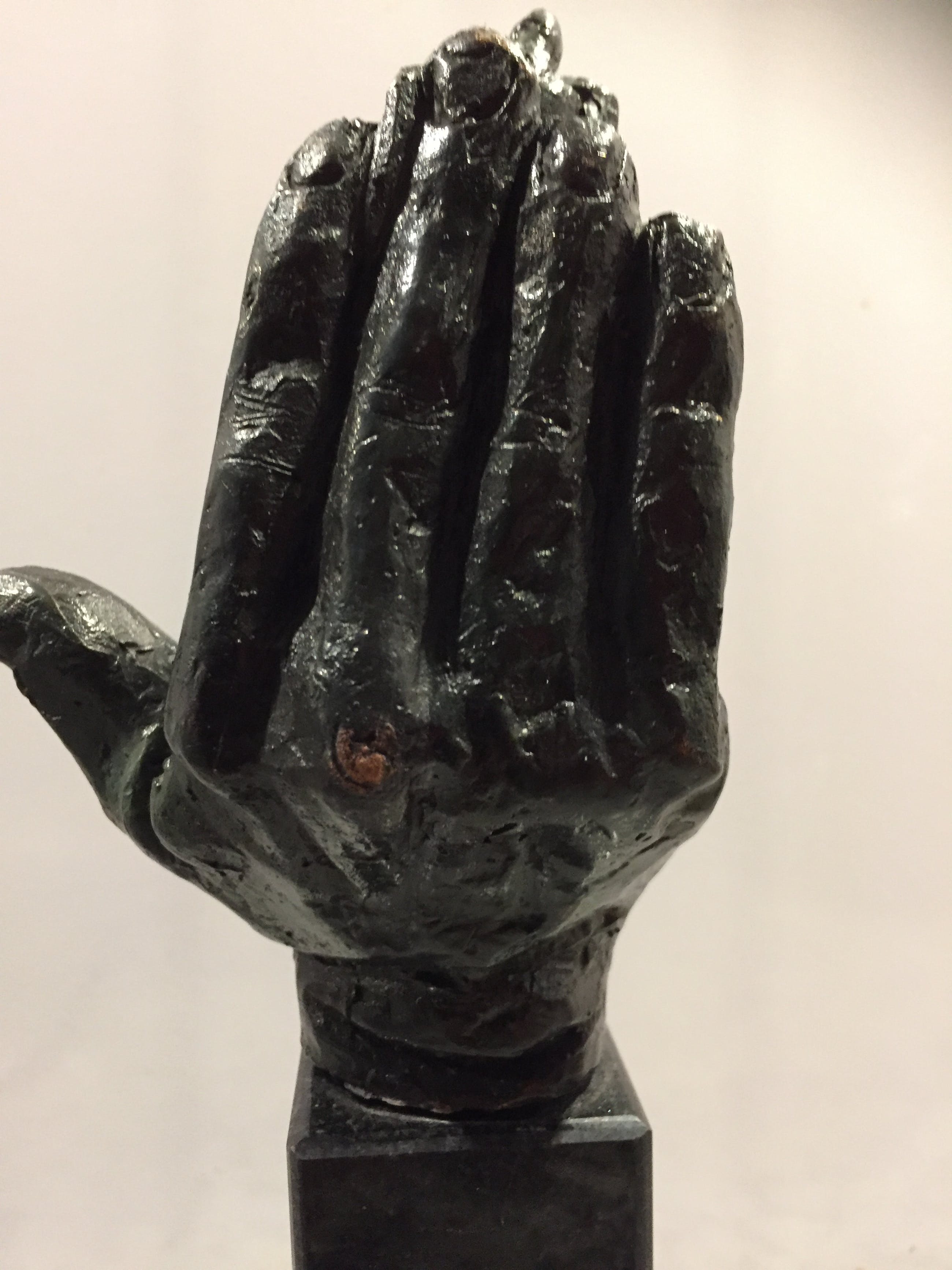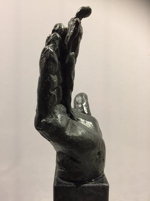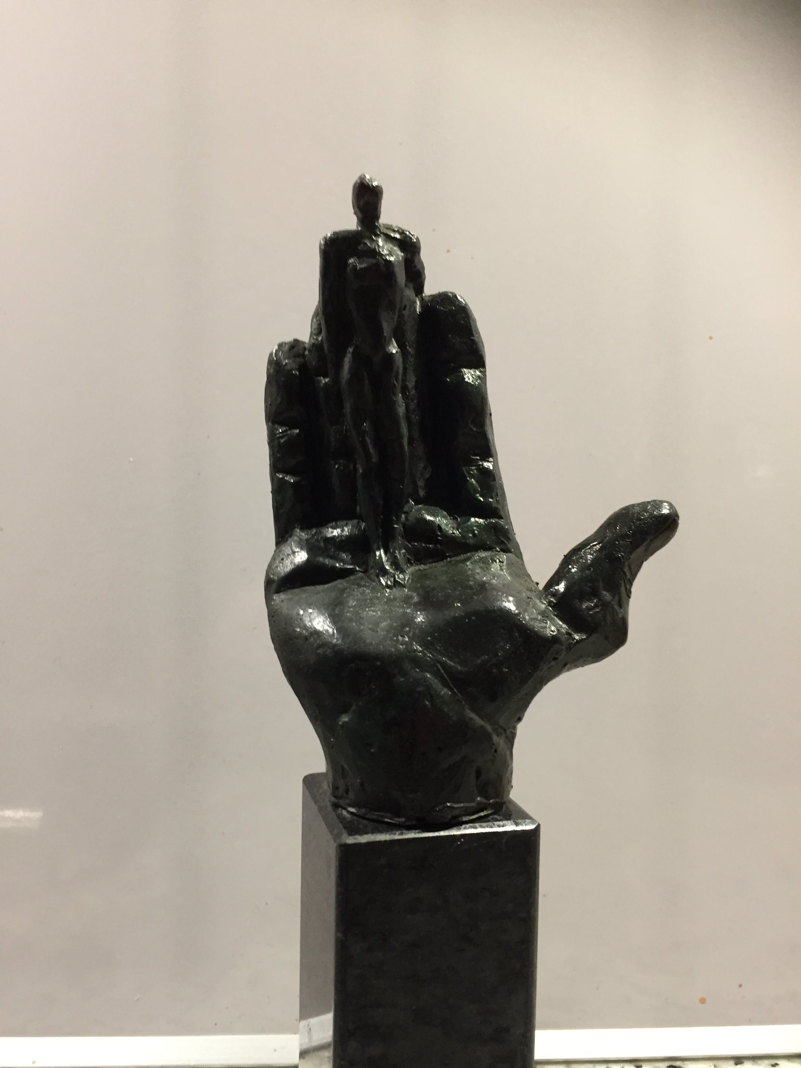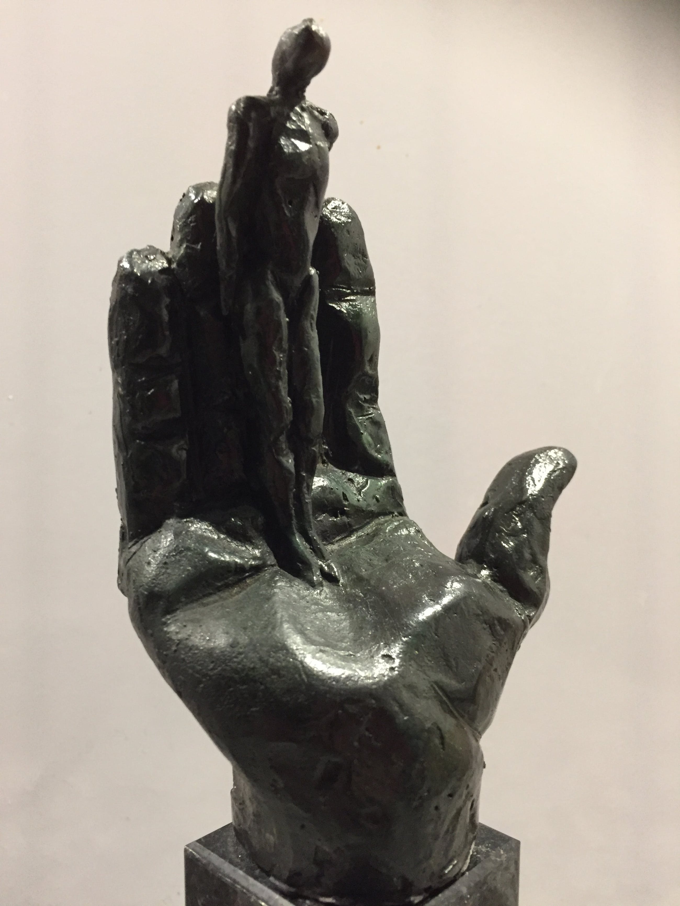 Staand in de palm van een open hand geeft voor deze figuur de mogelijkheid om vanuit een ander perspectief de toestand te bezien. De hand staat op een zwarte natuurstenen sokkel.