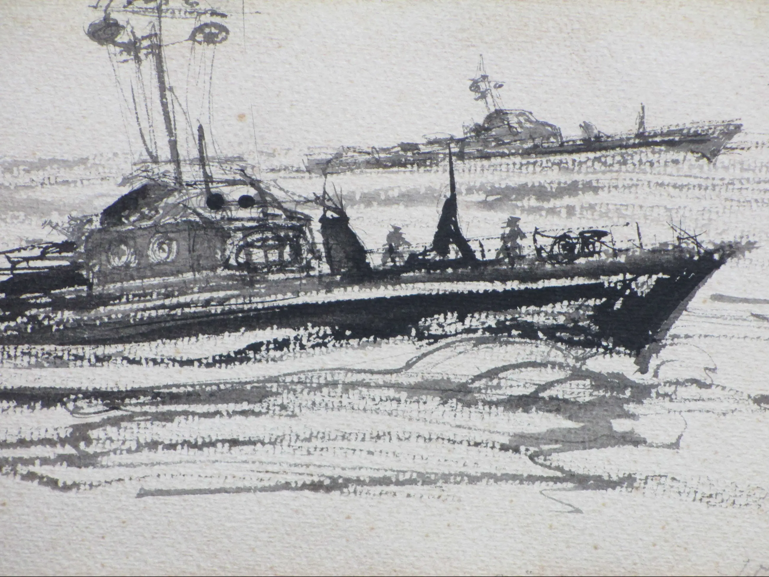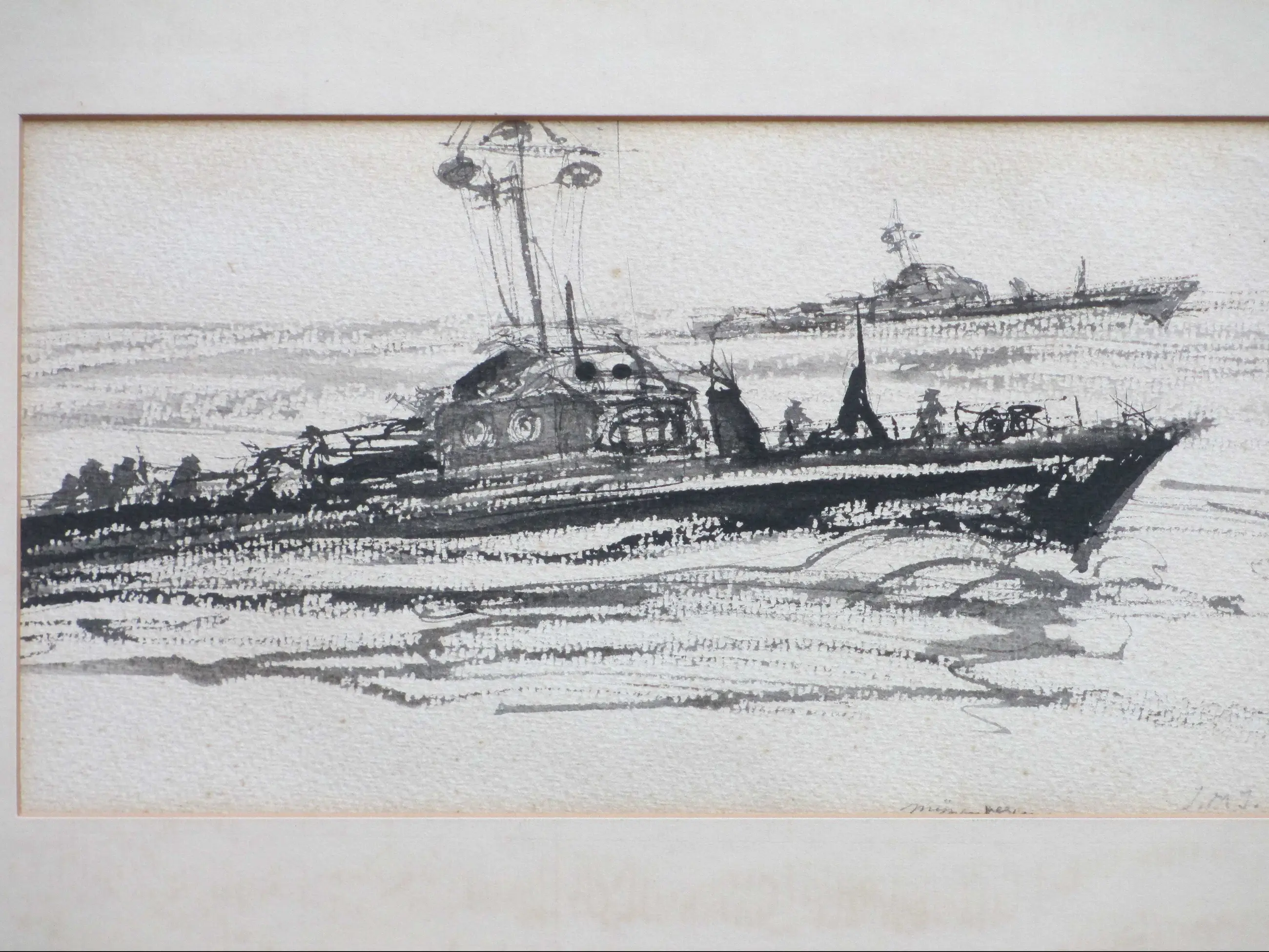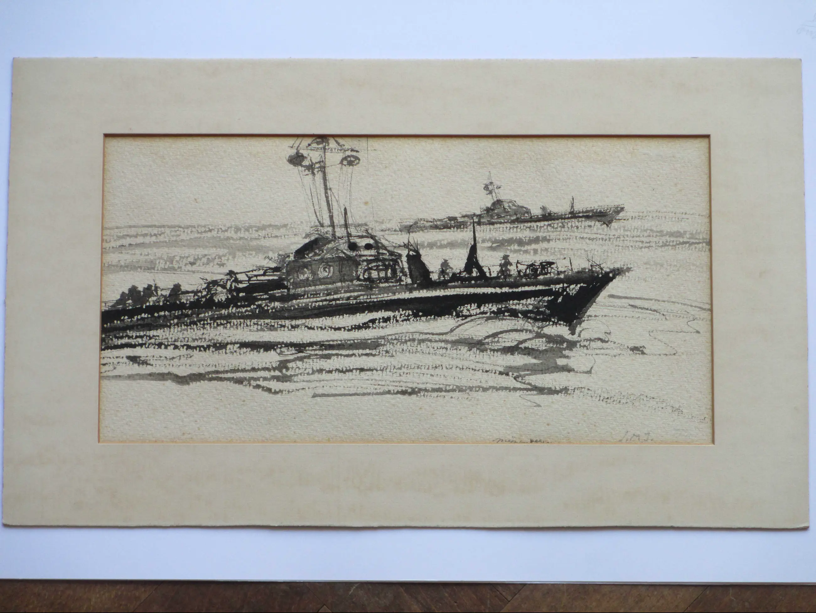 Penseeltekening door Wim Vaarzon Morel jr Maritieme voorstelling van een mijnenveger Werk onder passepartout, beeldmaat 17x33, p.p.maat 26x44 Gemonogrammeerd in potlood r.o.: 'J.V.M.J.' Op achterzijde tekening van een hooiende boer Authenticiteit volledig gegarandeerd