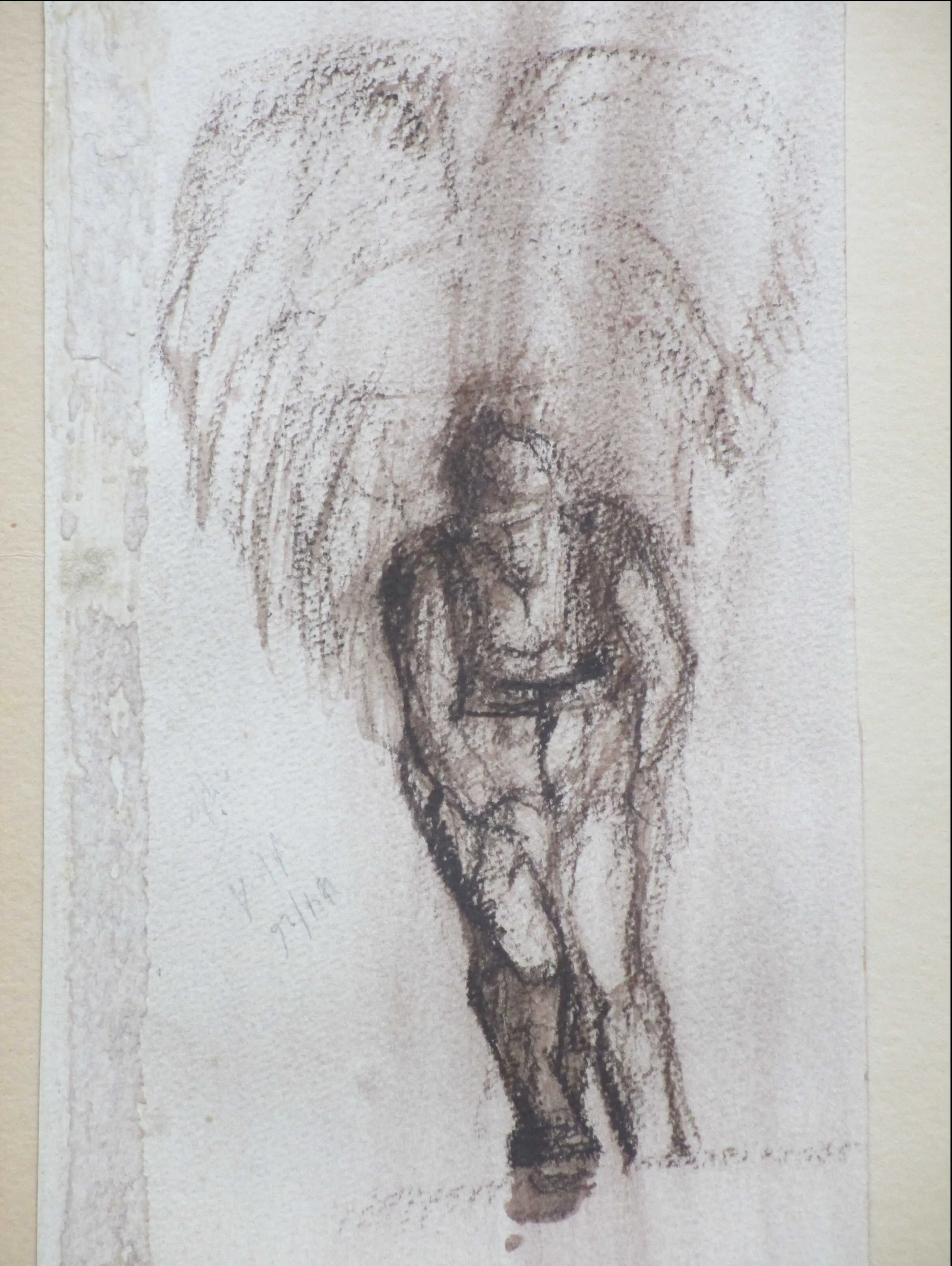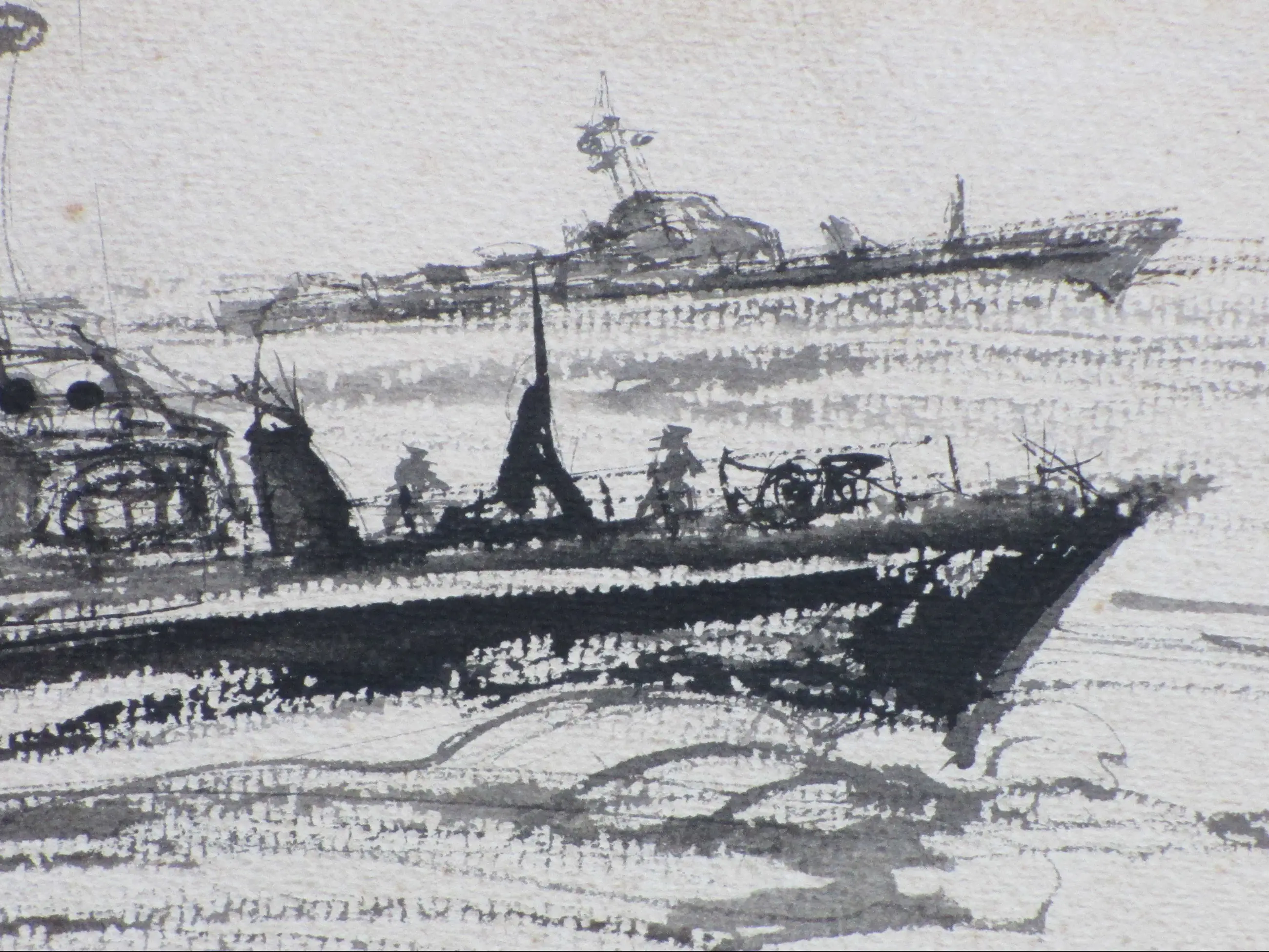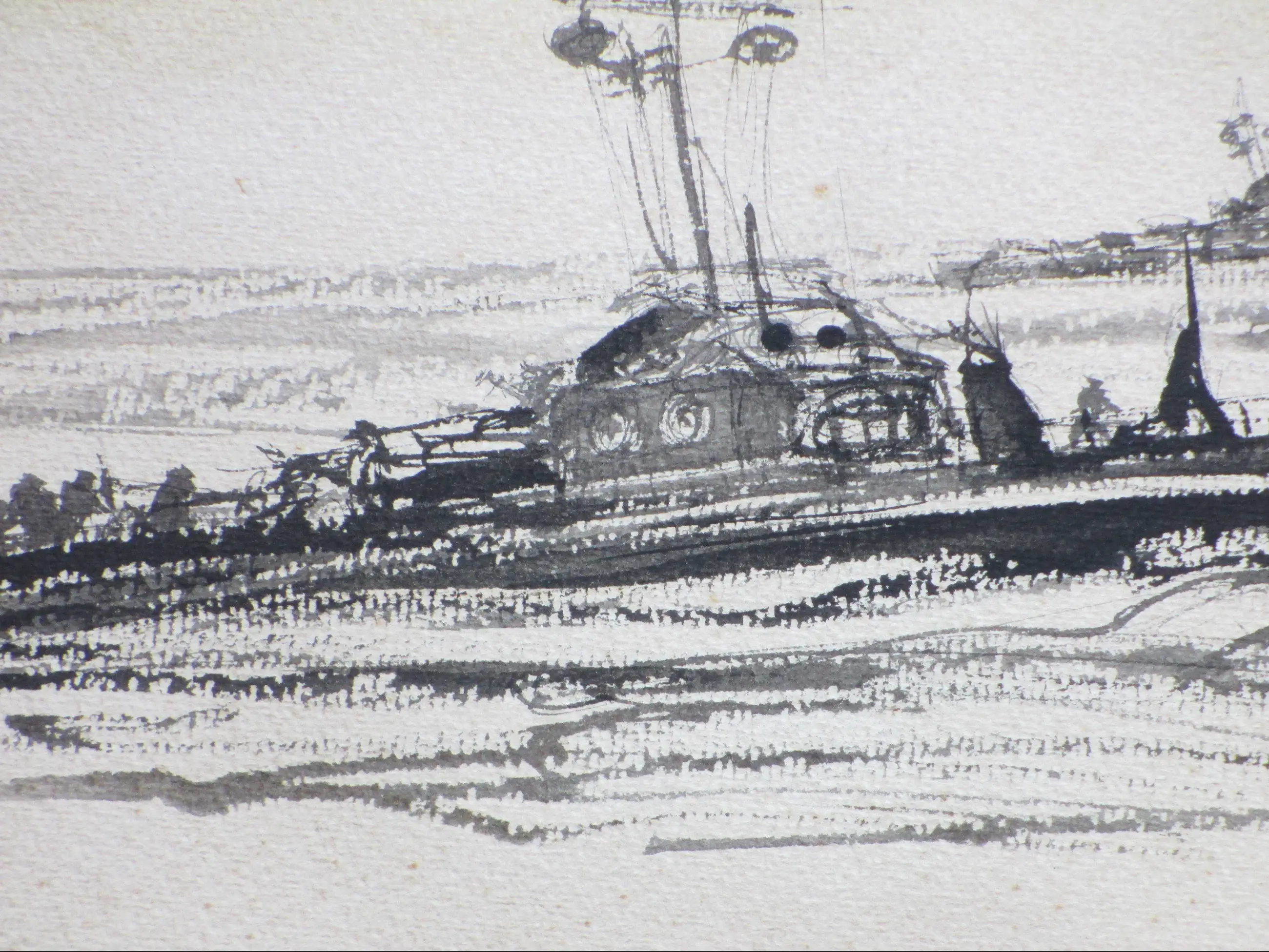 Penseeltekening door Wim Vaarzon Morel jr Maritieme voorstelling van een mijnenveger Werk onder passepartout, beeldmaat 17x33, p.p.maat 26x44 Gemonogrammeerd in potlood r.o.: 'J.V.M.J.' Op achterzijde tekening van een hooiende boer Authenticiteit volledig gegarandeerd