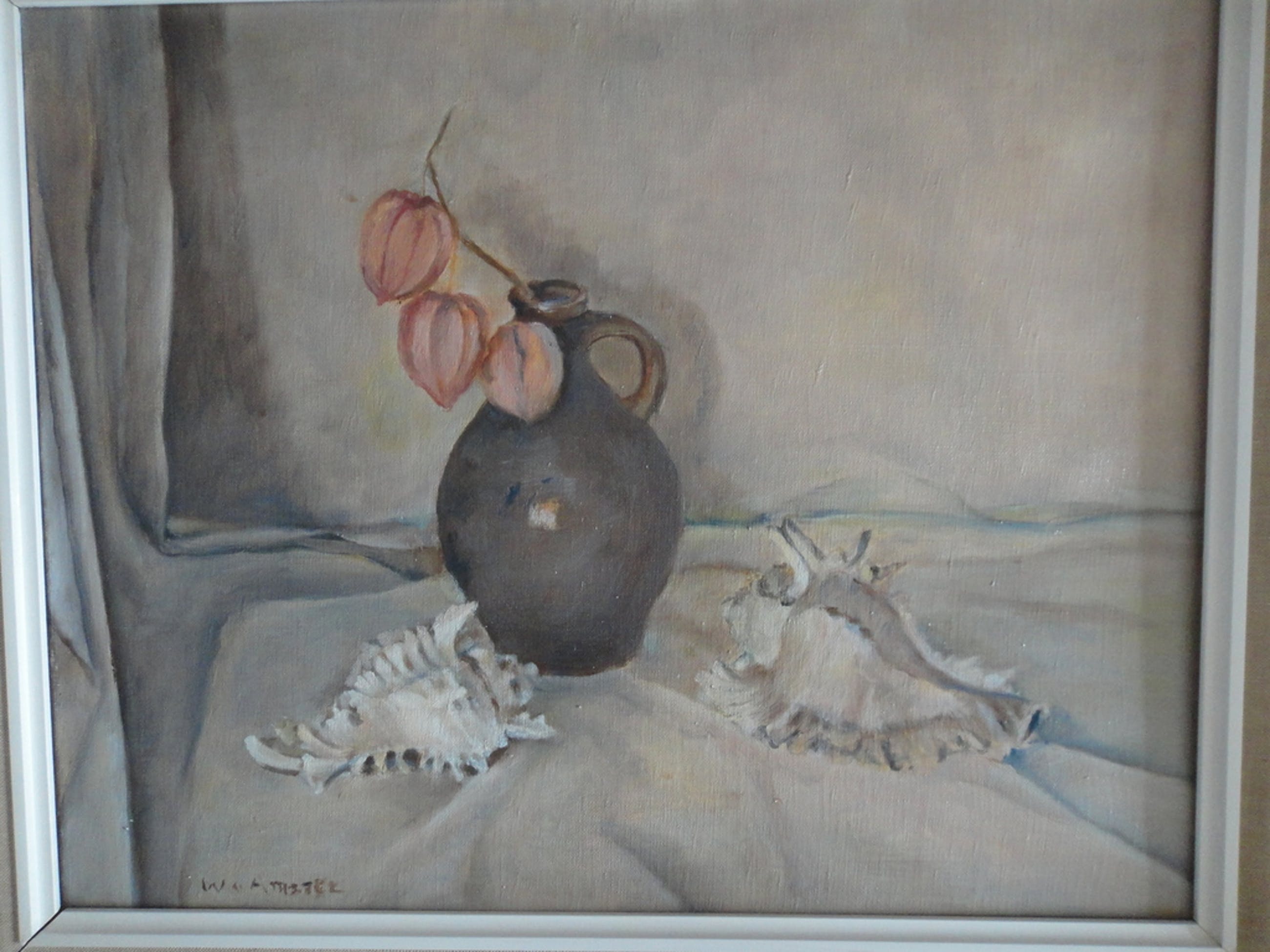 Dit fraaie stilleven meet 40 (hoog) bij 50 (breed) cm en is gevat in een fraai bijpassende "jaren-50-lijst".