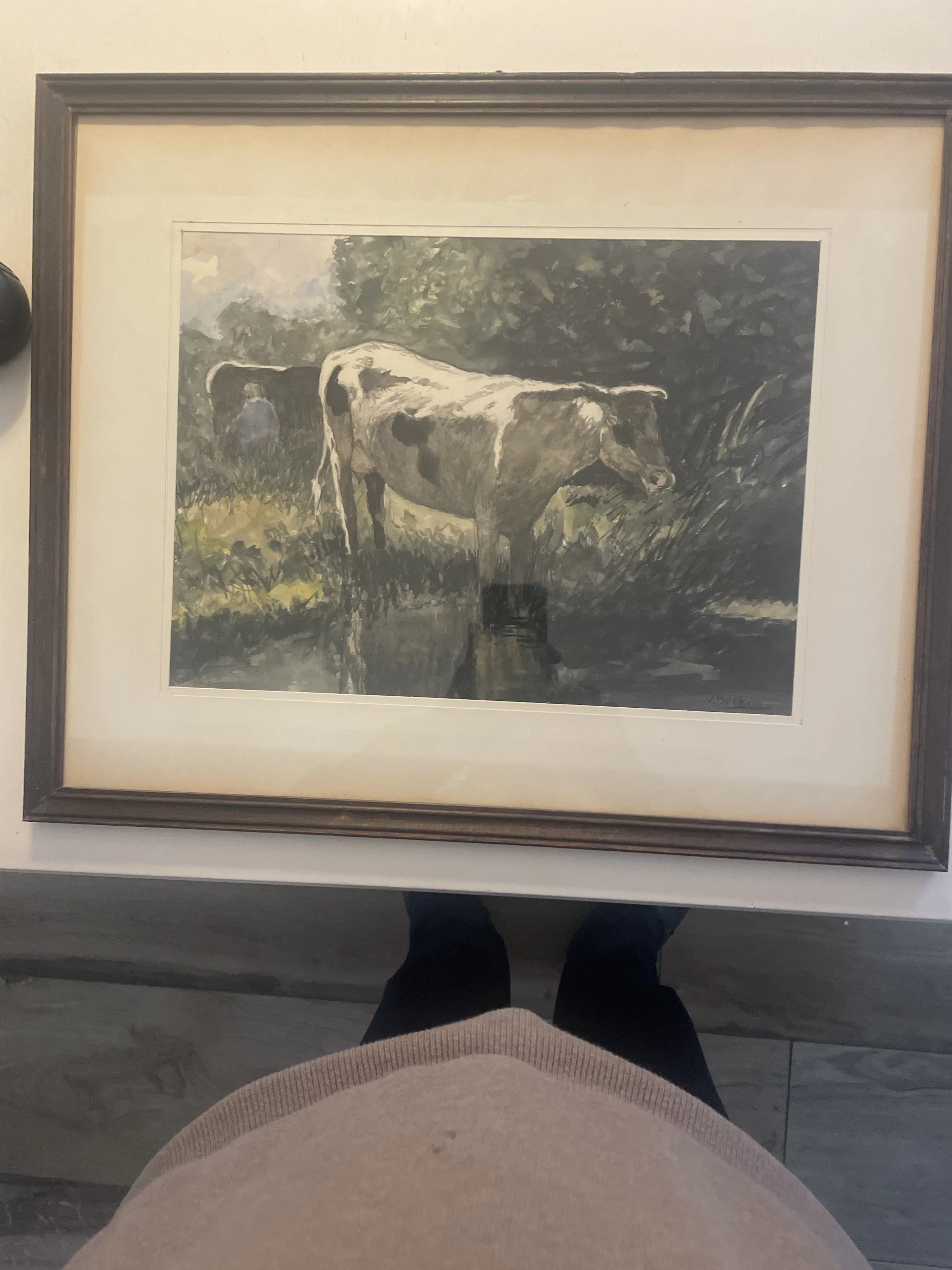 Aquarel van een koe die met zijn voorpoten In het water staat