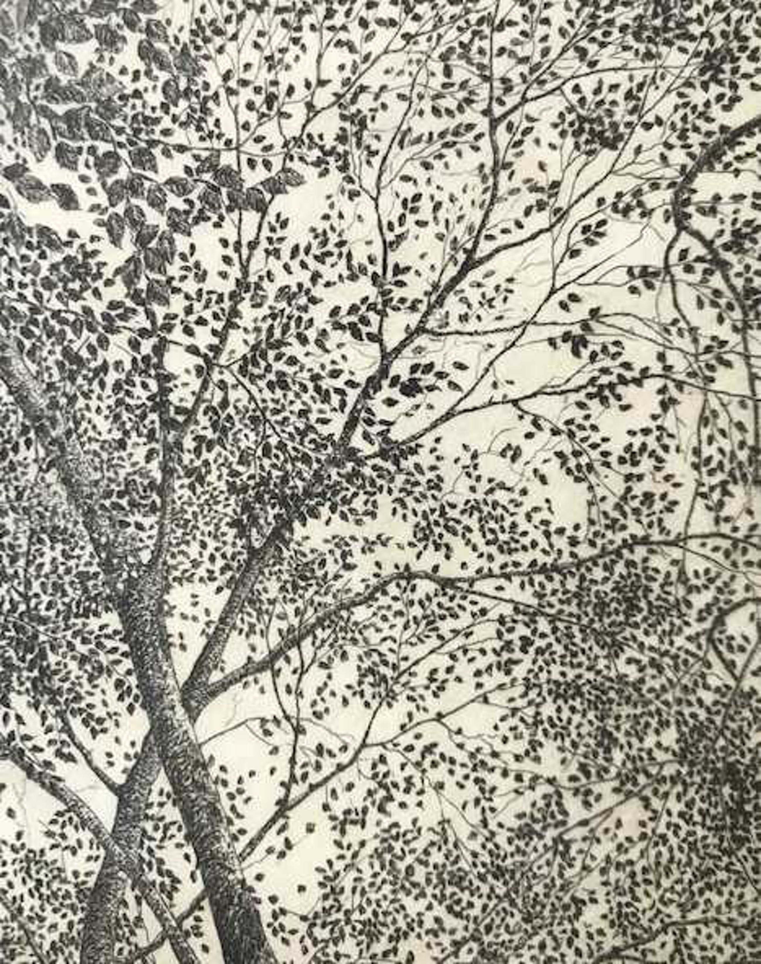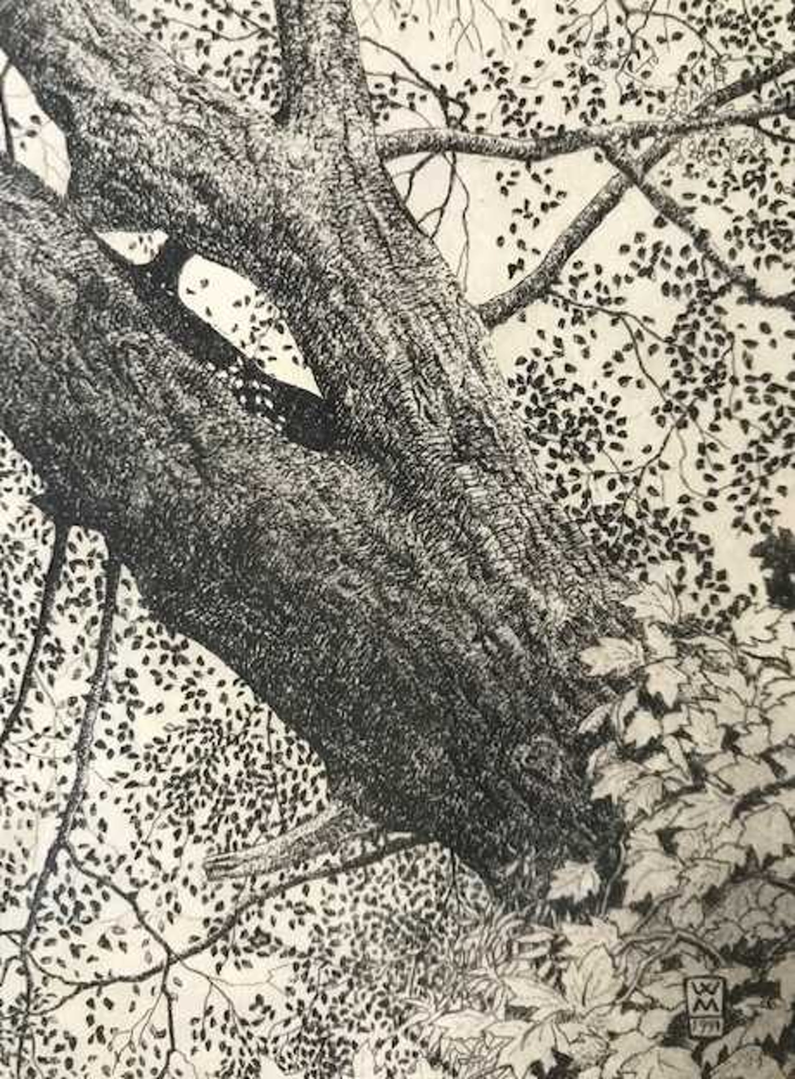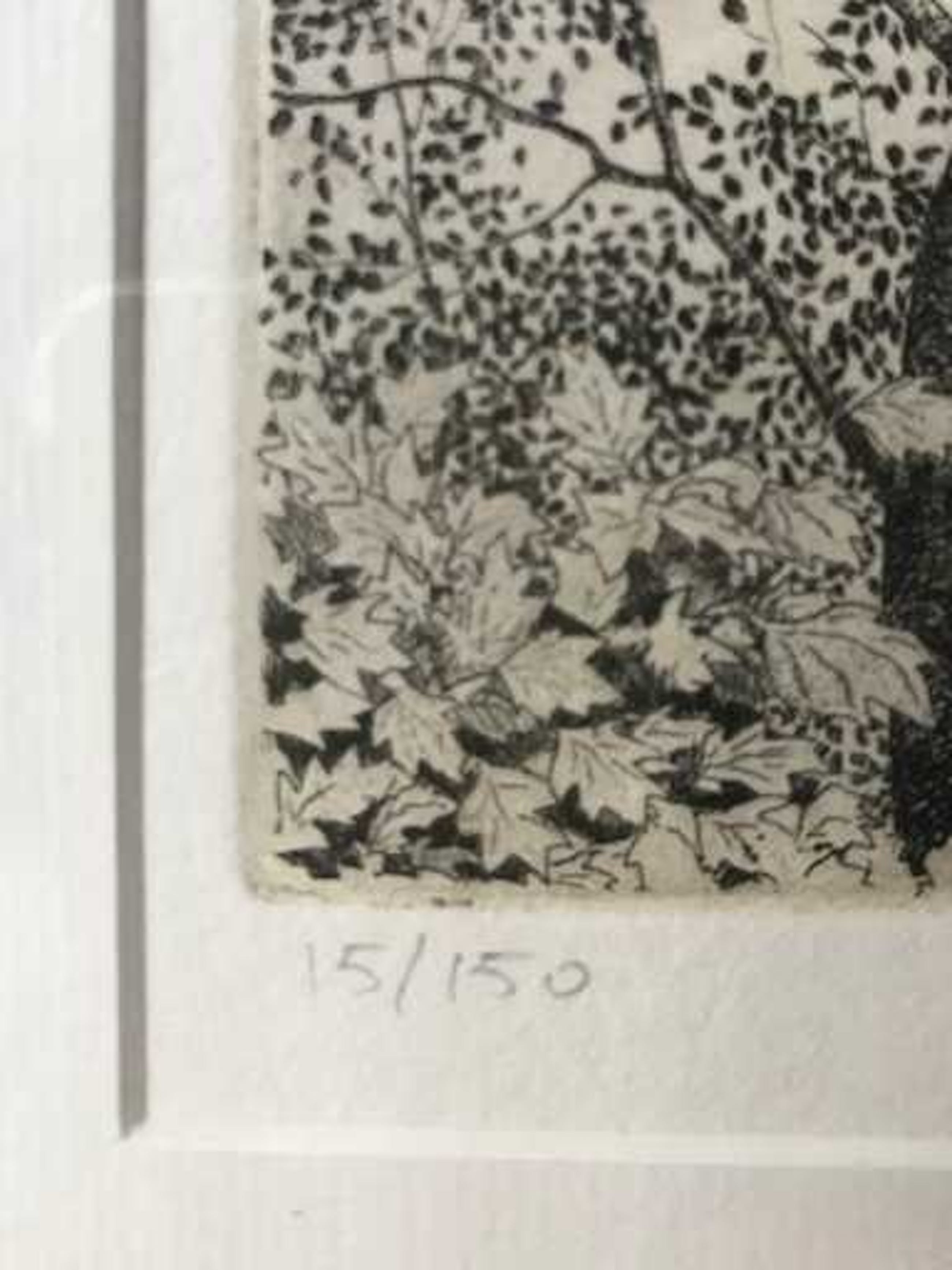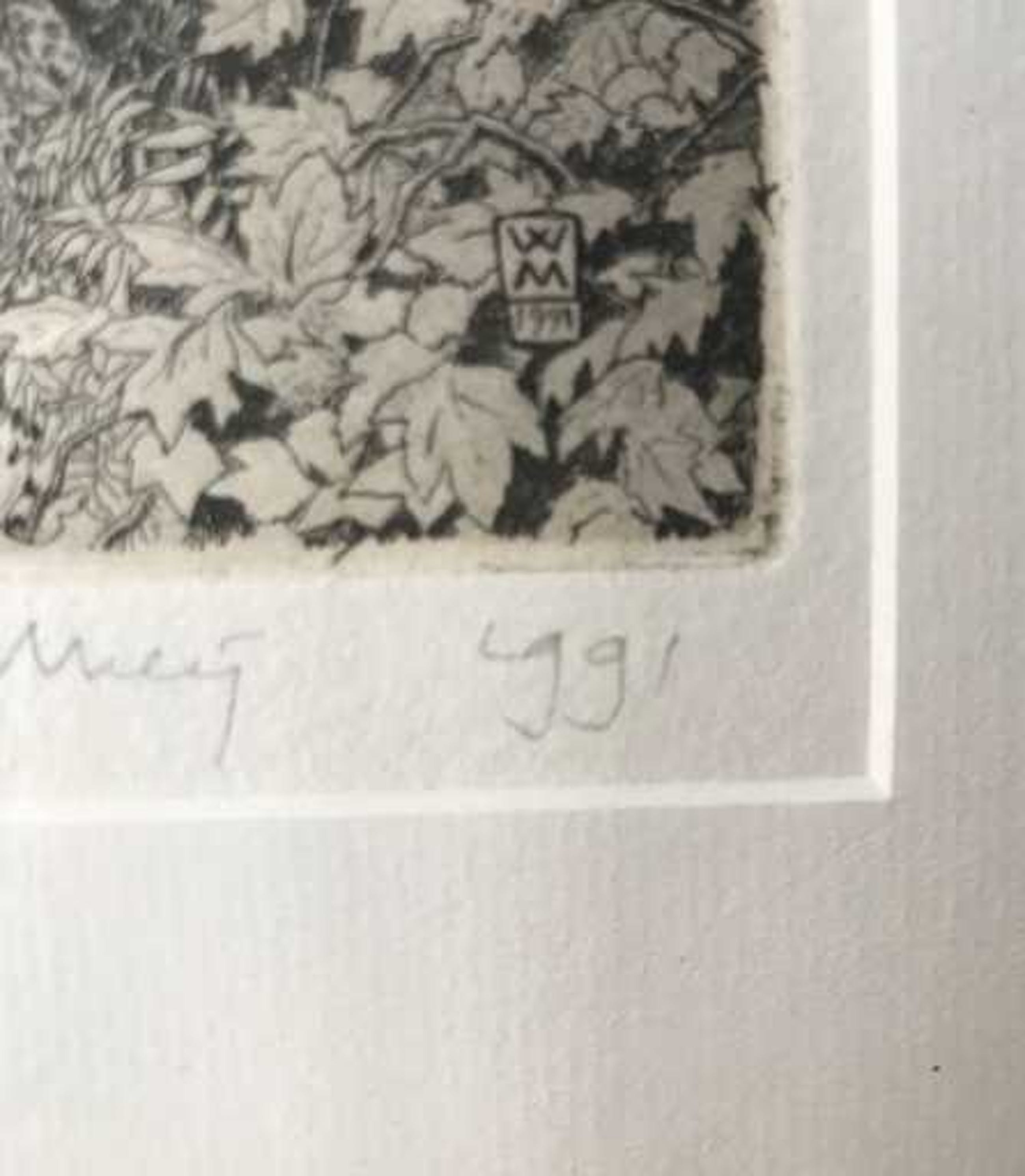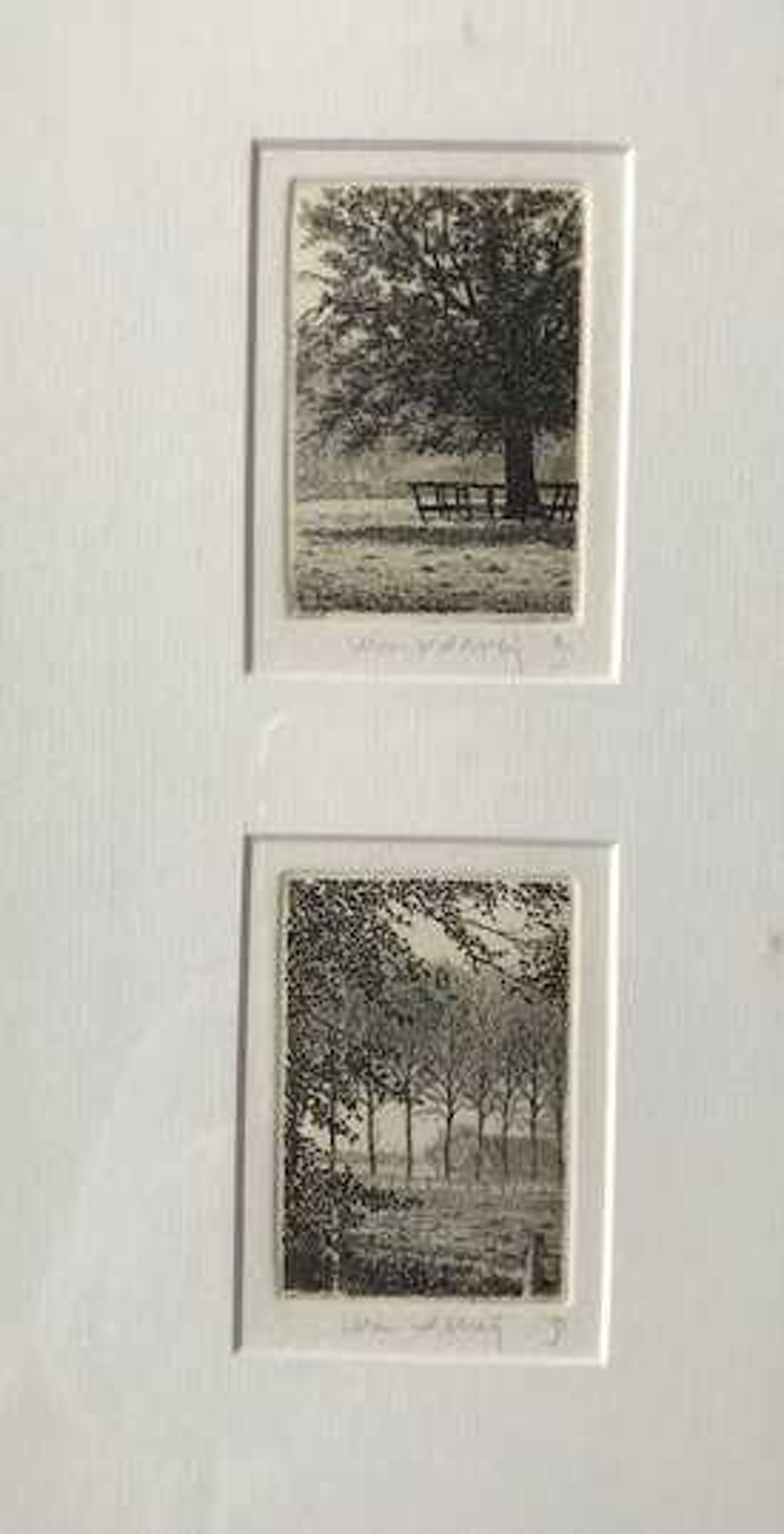 Gedetailleerde grote ets en twee kleinere etsen van Wim van der Meij. De grote ets meet 19x30 cm (hxb) en de twee kleinere etsen zijn 6x4 cm (hxb). Op een aantal foto's is een witte brede streep te zien; dit komt door de reflectie van het glas. Tekenen was zijn grote hobby, maar na zijn eerste etslessen in 1977 werd dat zijn passie. Hij volgde avondcursussen aan de Koninklijke Academie in Den Haag. In januari 1986 stopte hij met zijn baan en begon zijn carrière als fulltime kunstenaar en verhuisde naar Zutphen. Hij nam deel aan tentoonstellingen in vele plaatsen in Nederland en deed opdrachten voor bedrijven en instellingen. Hij vindt de onderwerpen voor zijn etsen in het Nederlandse landschap langs de rivieren en kanalen en in de oude steden.