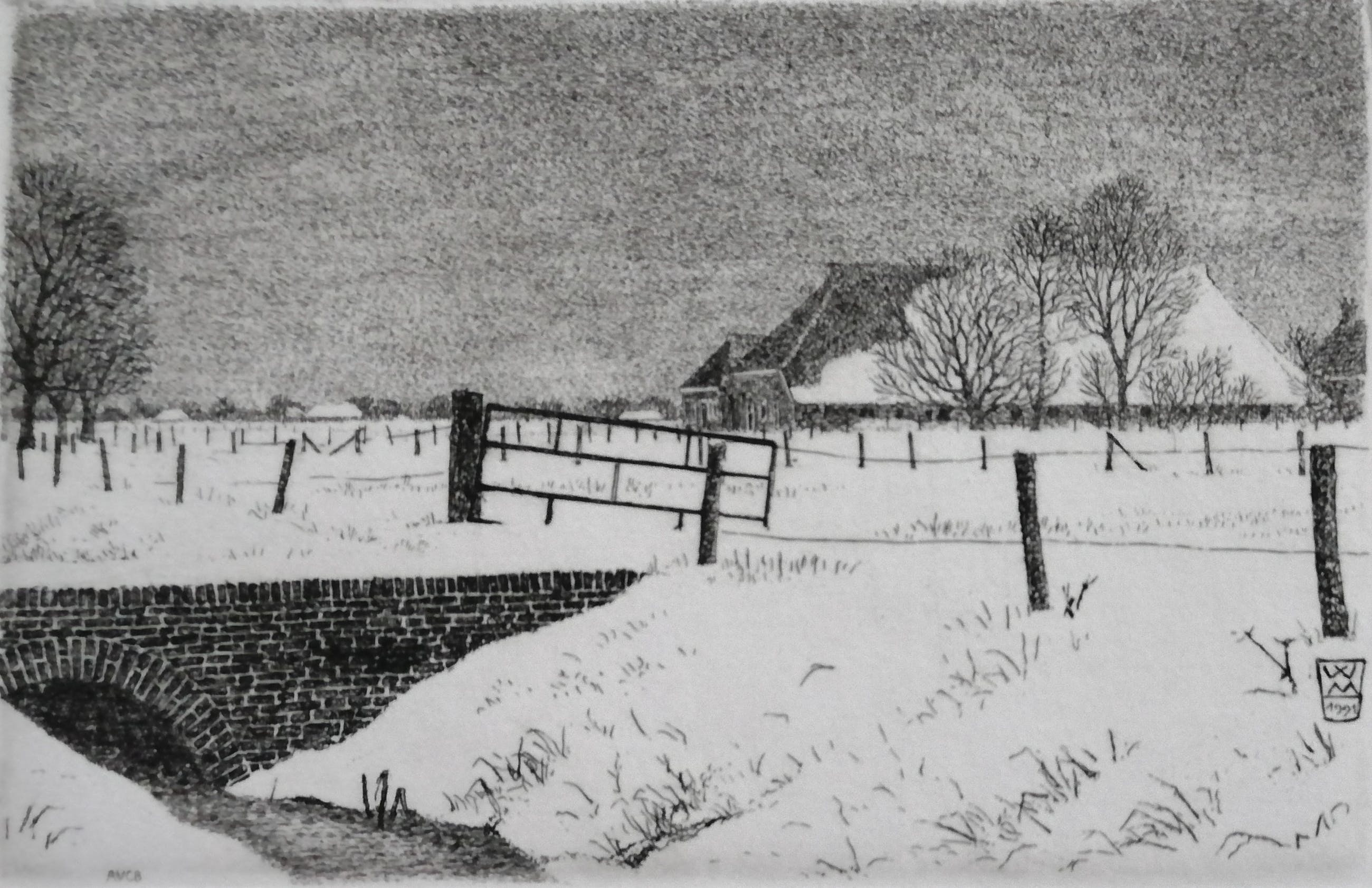 5. Boerderij in de winter Beeldmaat 7,5x11,5 cm. Bladmaat 14x19,5 cm. 1991