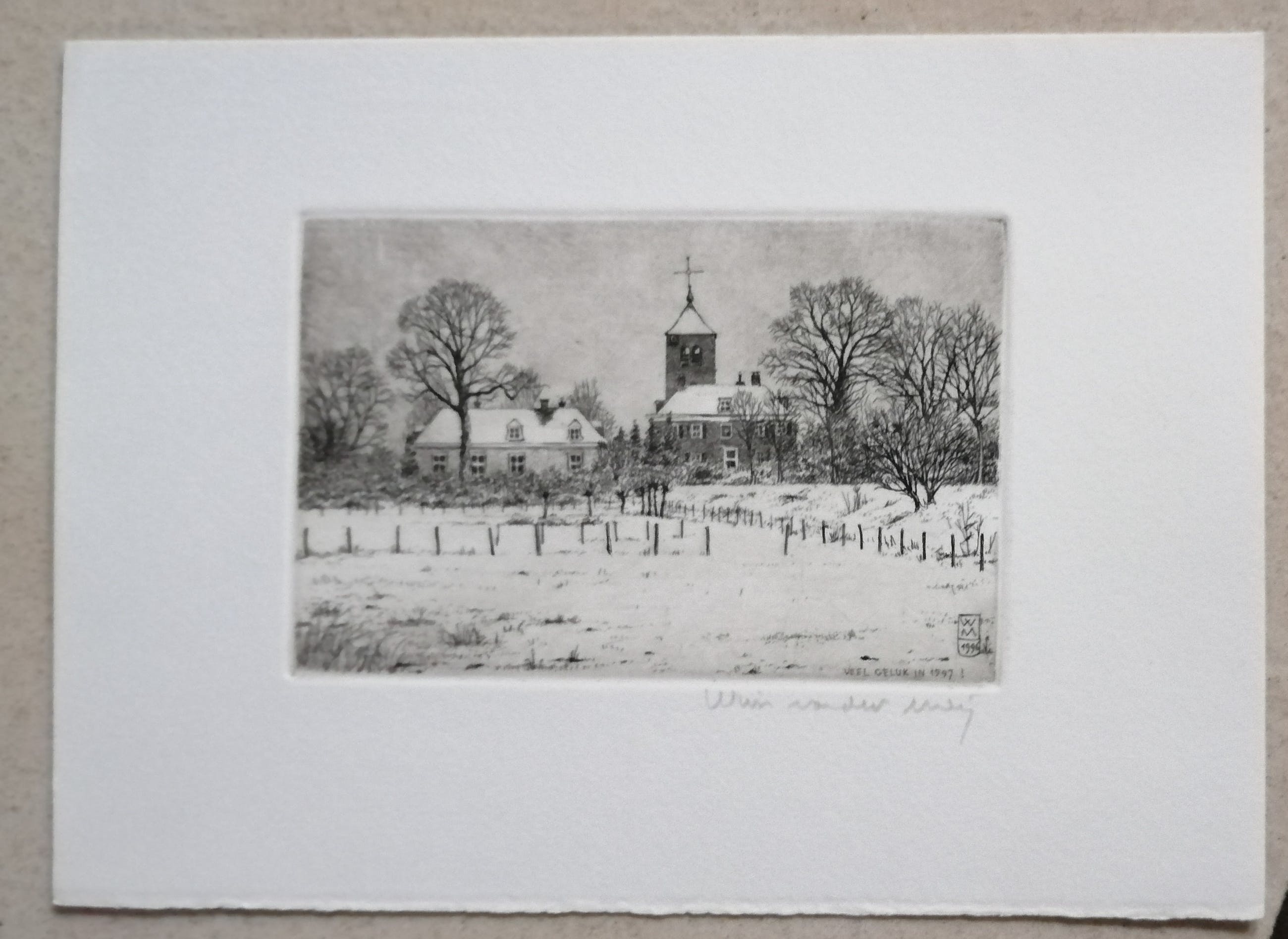 1. Kerk in de sneeuw Beeldmaat 7,5x11,5 cm. Bladmaat 14,5x20 cm. 1996