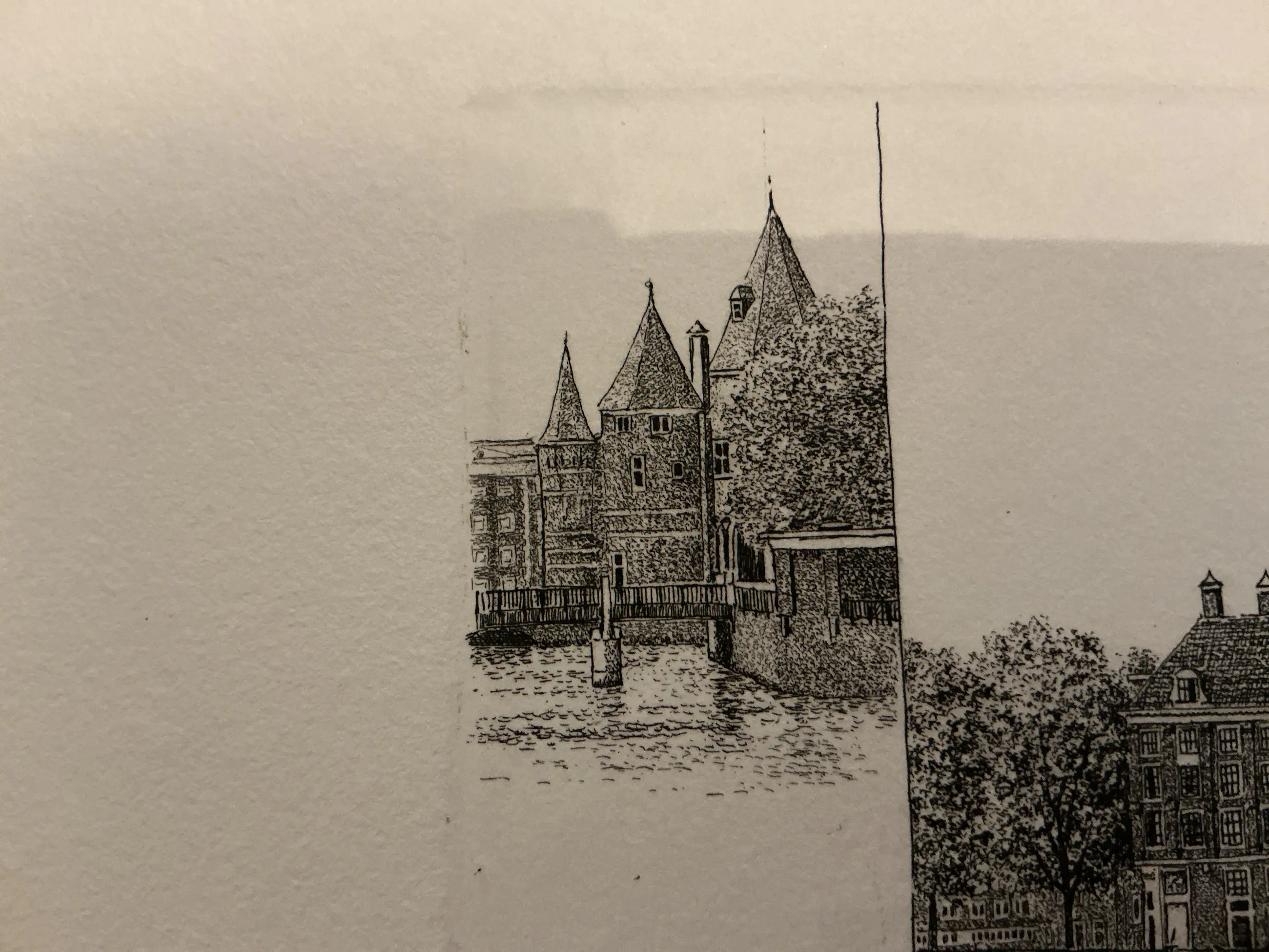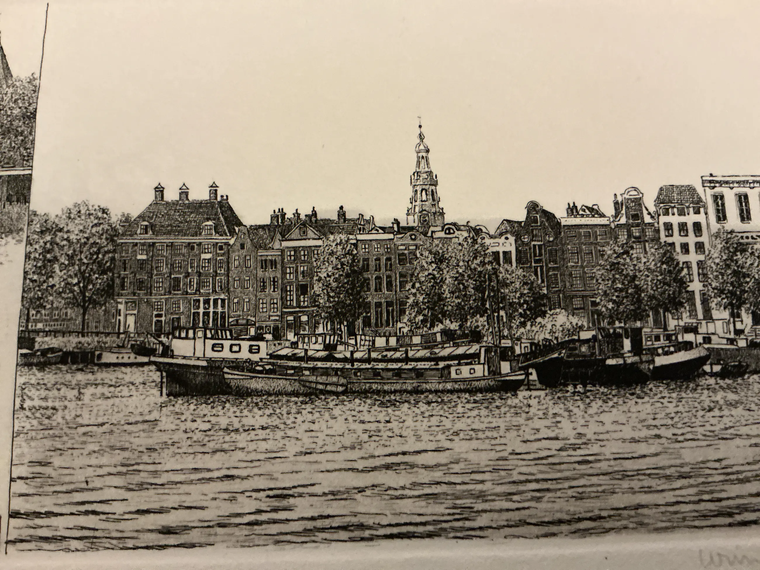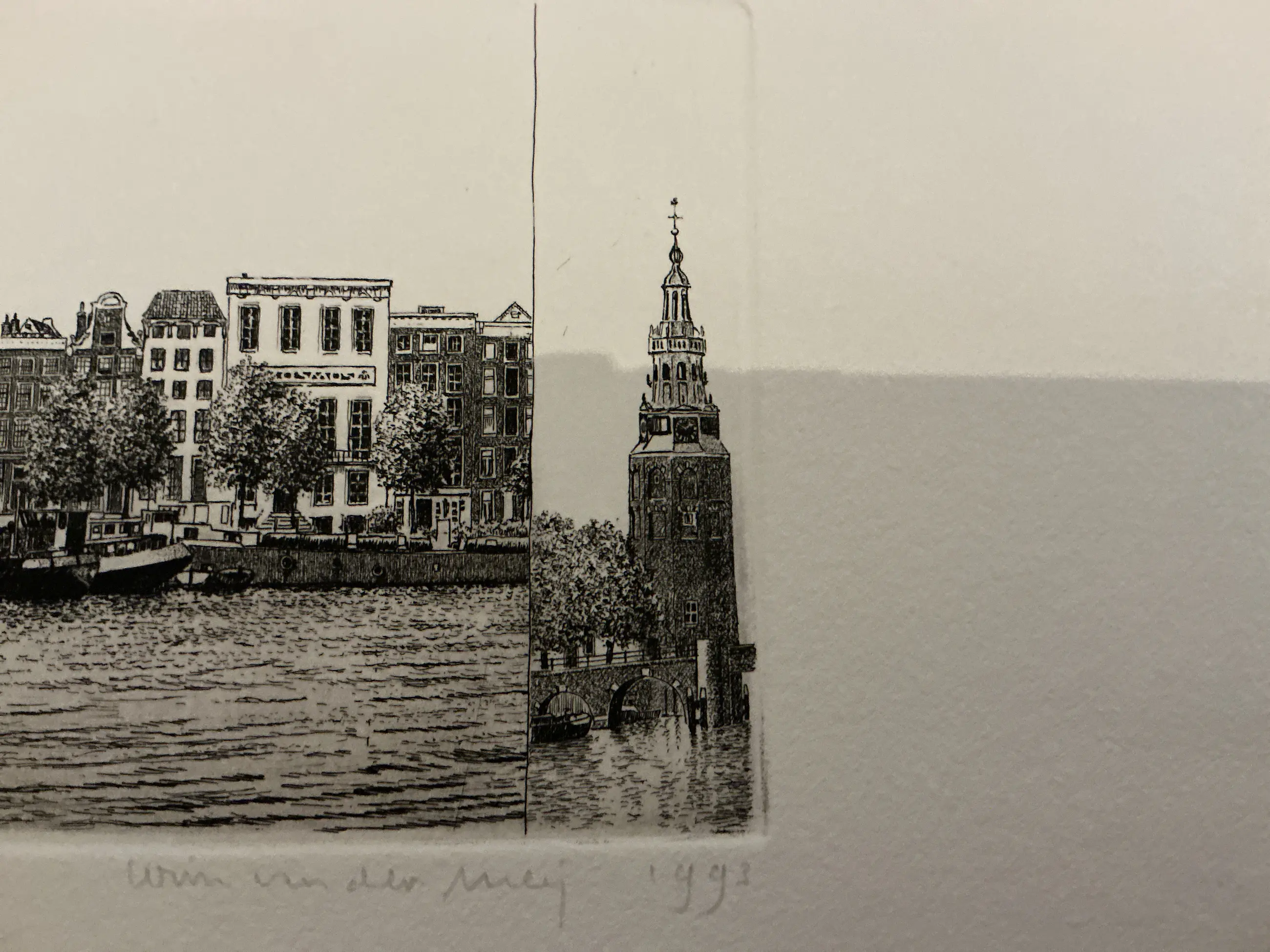 Verfijnde etsers, mooi uitgewerkt, diverse Amsterdamse herkenbare torens en kade. se