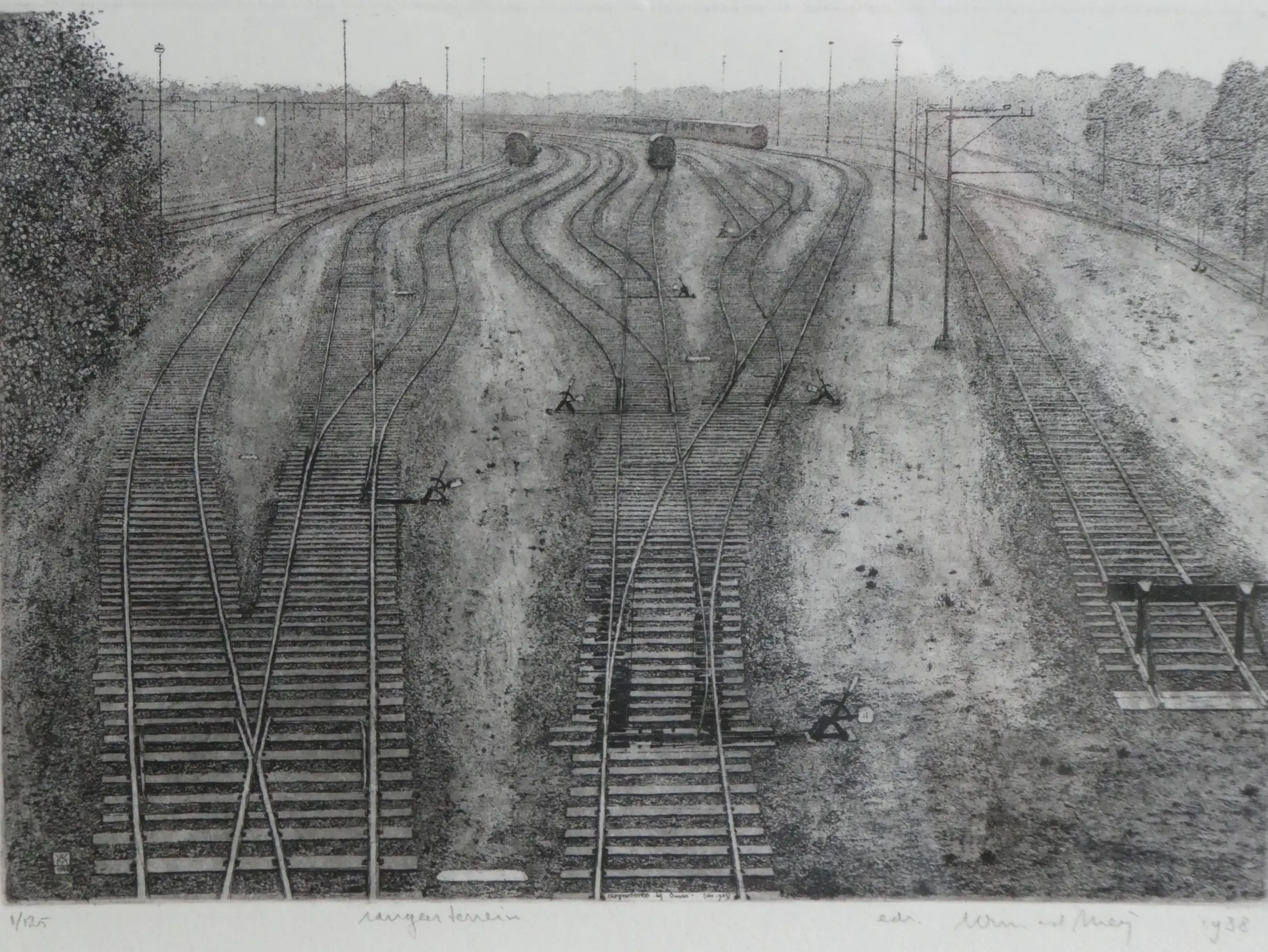 Mooie verfijnde en gedetailleerd uitgewerkte zwart wit ets van het spoor