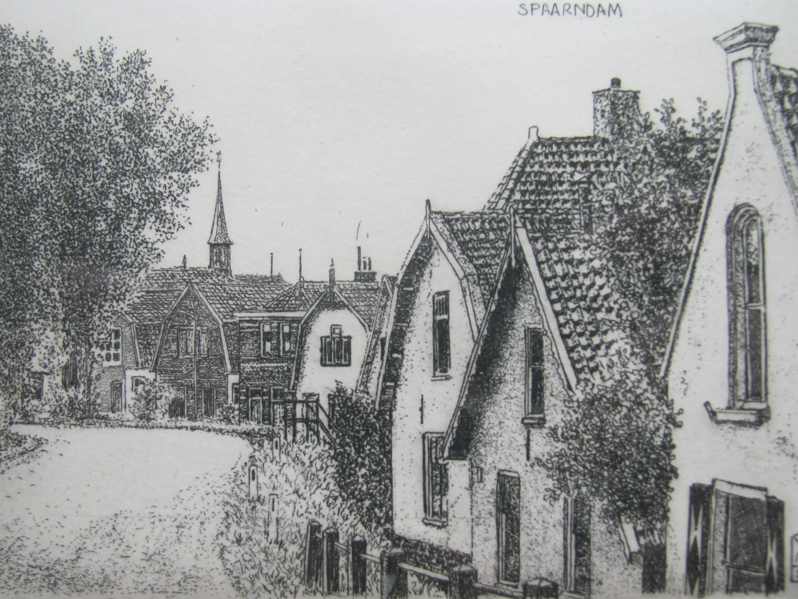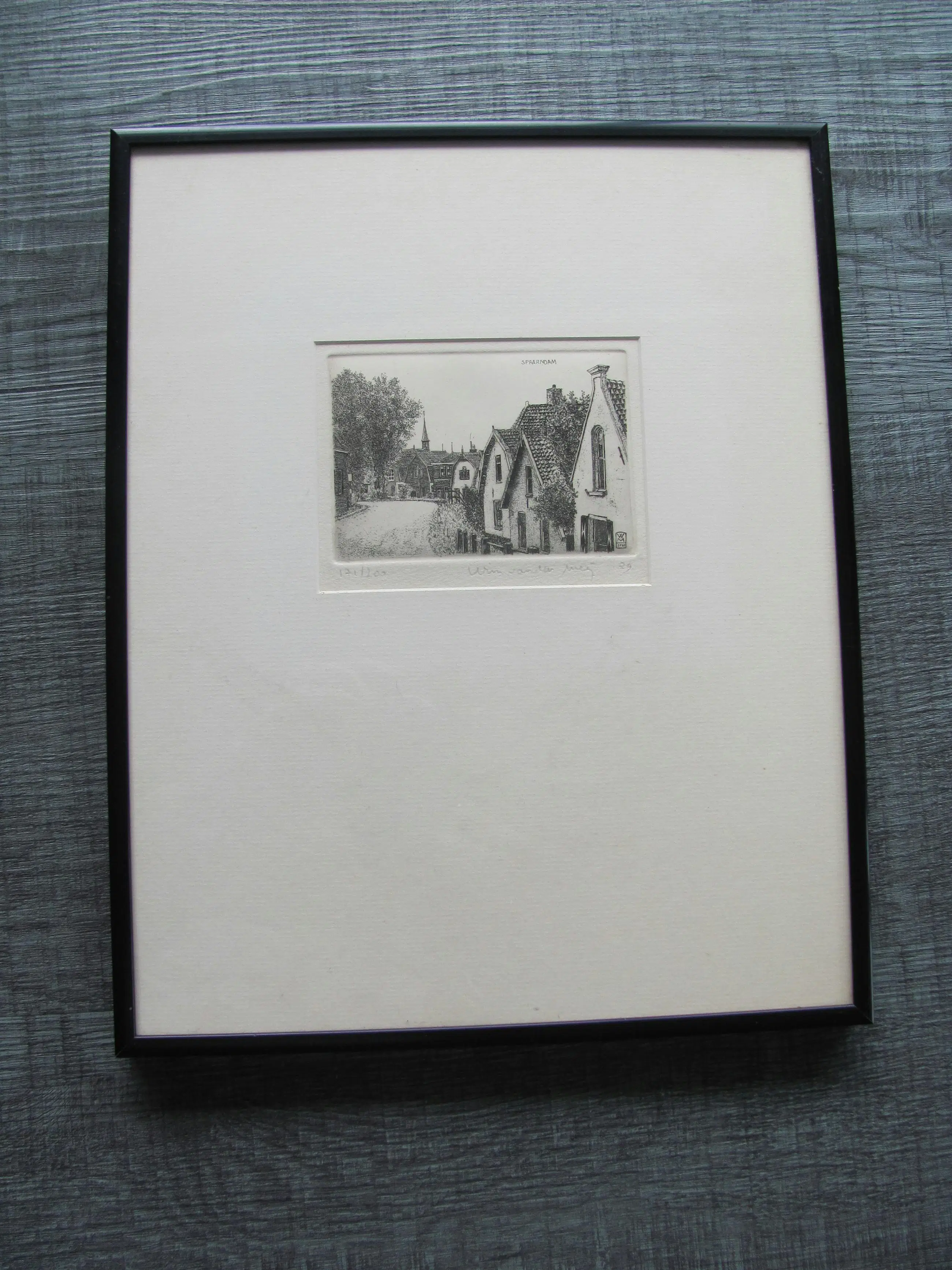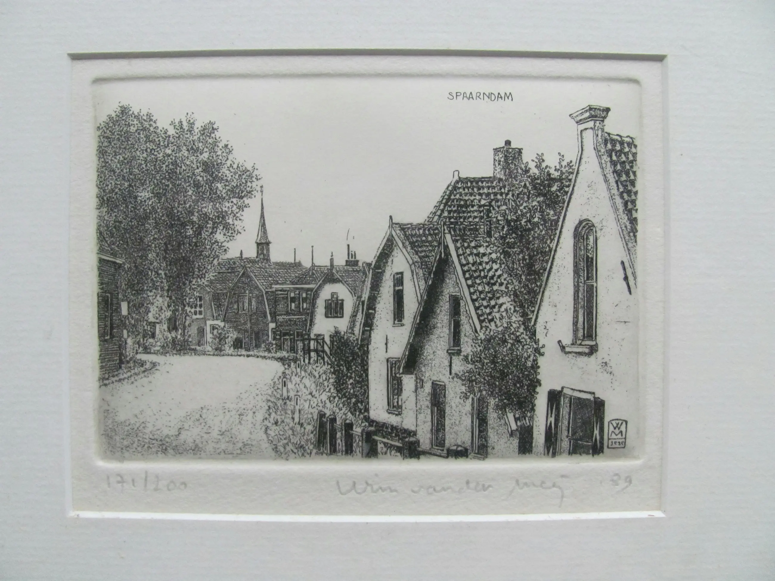 Ets van Wim van der Meij. Rechtsboven in de plaat getiteld: Spaarndam. Linksonder met potlood genummerd: 171/200 Rechtsonder met potlood gedateerd 1989 In het midden met potlood gesigneerd: Wim van der Meij. Rechtsonder in de plaat ook monogram.
