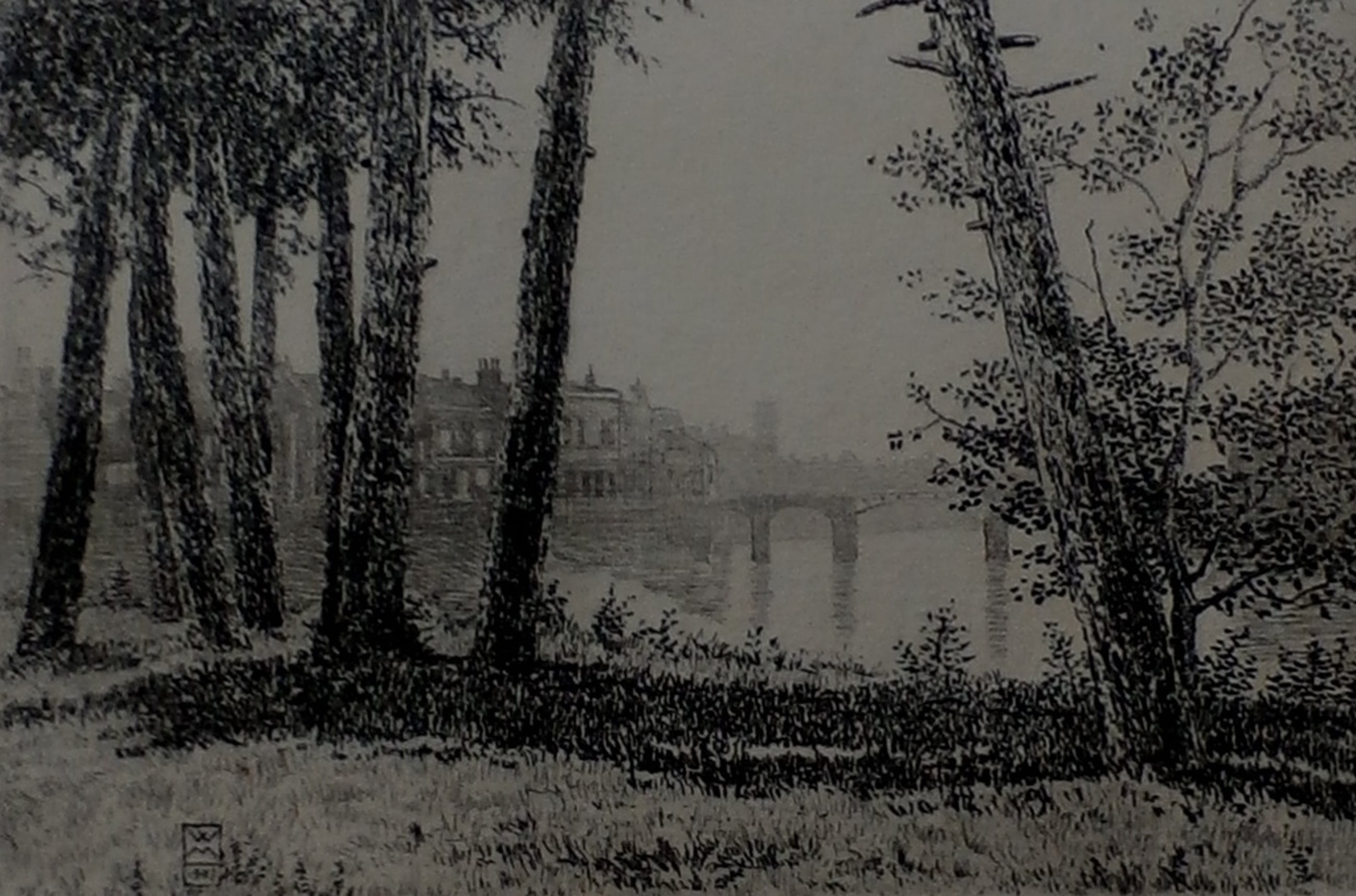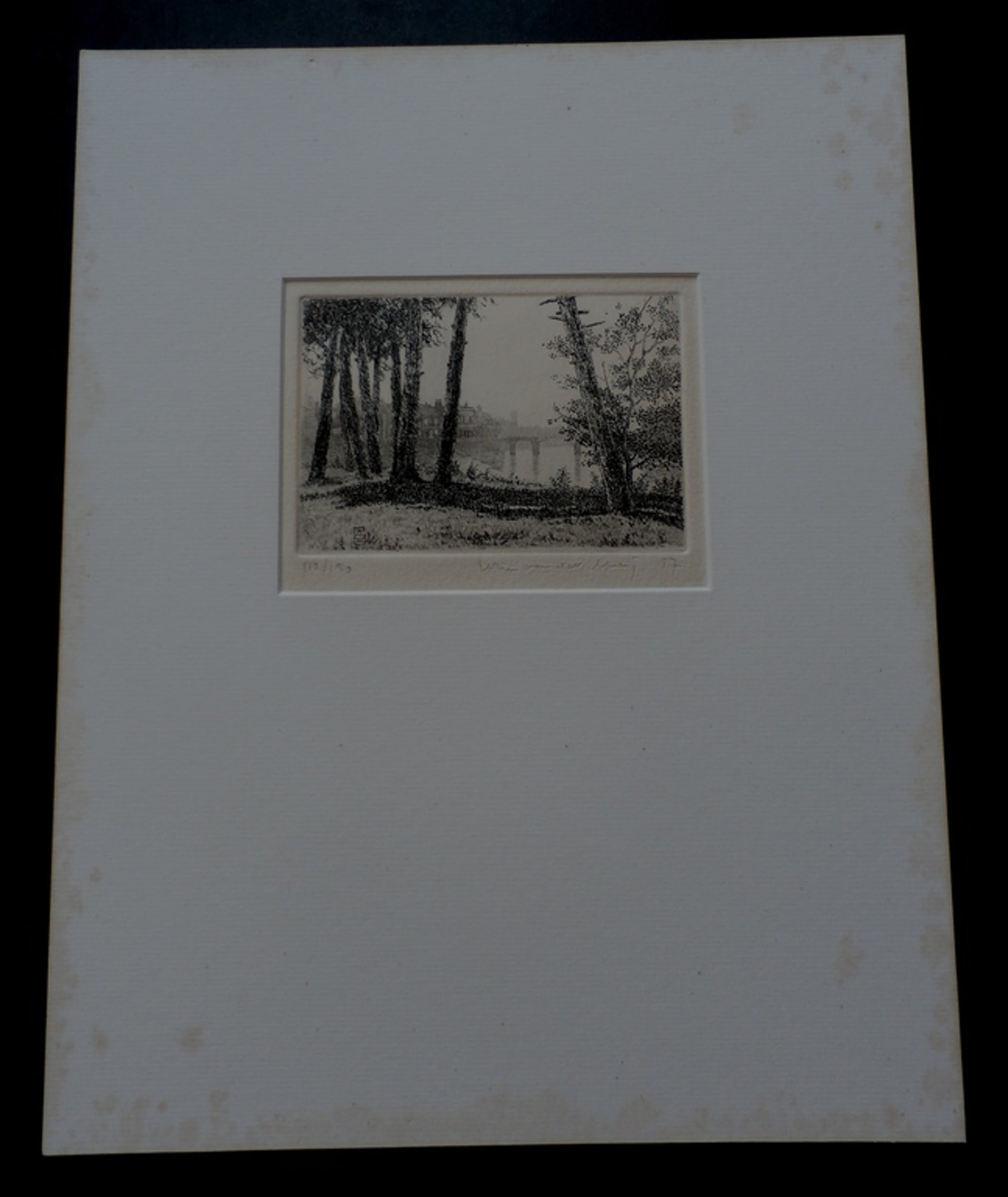 Ets van Wim van der Meij uit 1987. Nr: 112/150. Afmetingen blad incl. passe-partout: h30 x b24 cm. Afmetingen voorstelling: h7,5 x b10,5 cm. Het werk is rechtsonder gesigneerd door de kunstenaar. De authenticiteit van het aangeboden werk wordt voor 100% gegarandeerd. Een certificaat van echtheid kan, op aanvraag, worden meegestuurd. Conditie: in goede staat. Het passe-partout is vuil.