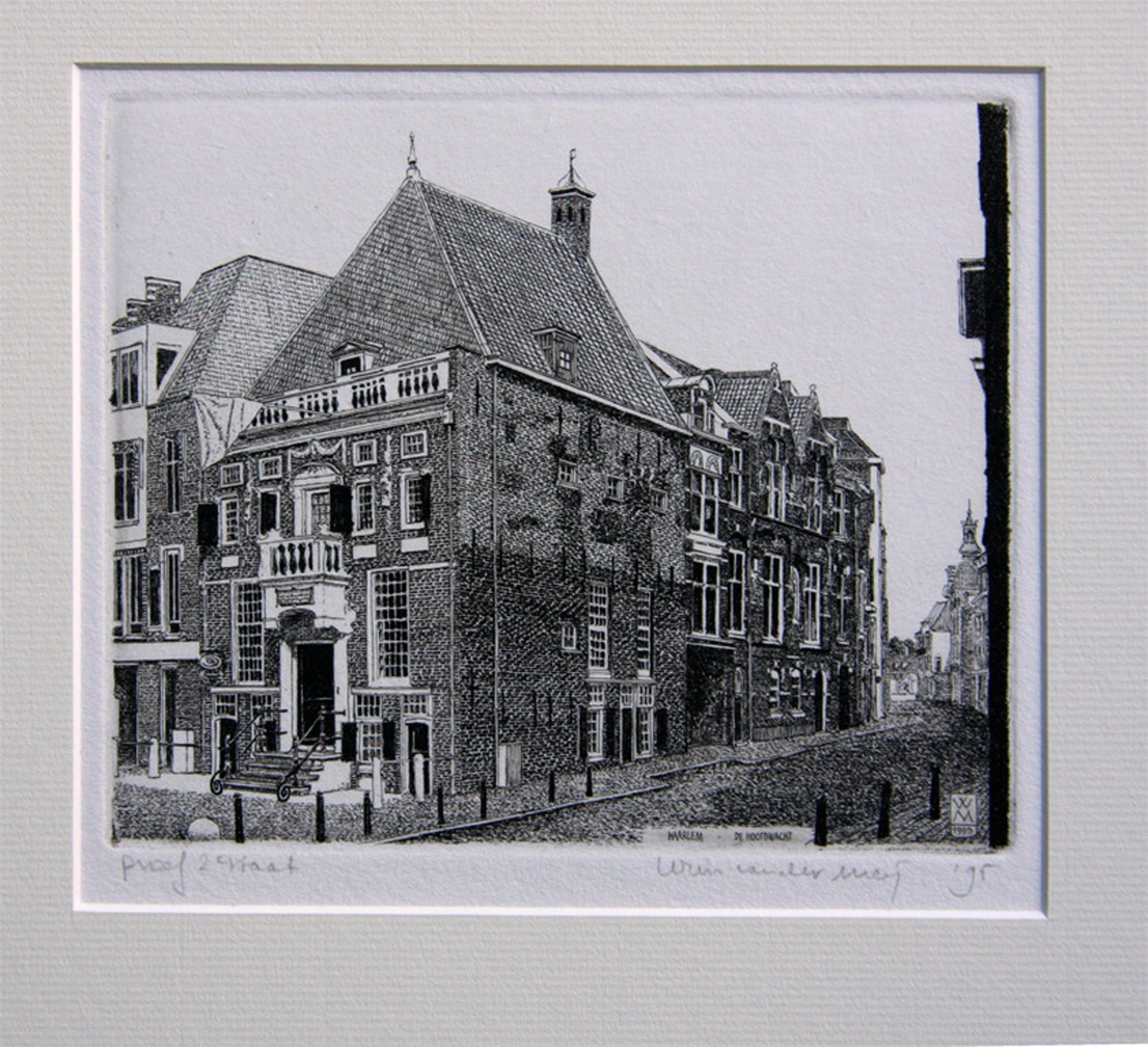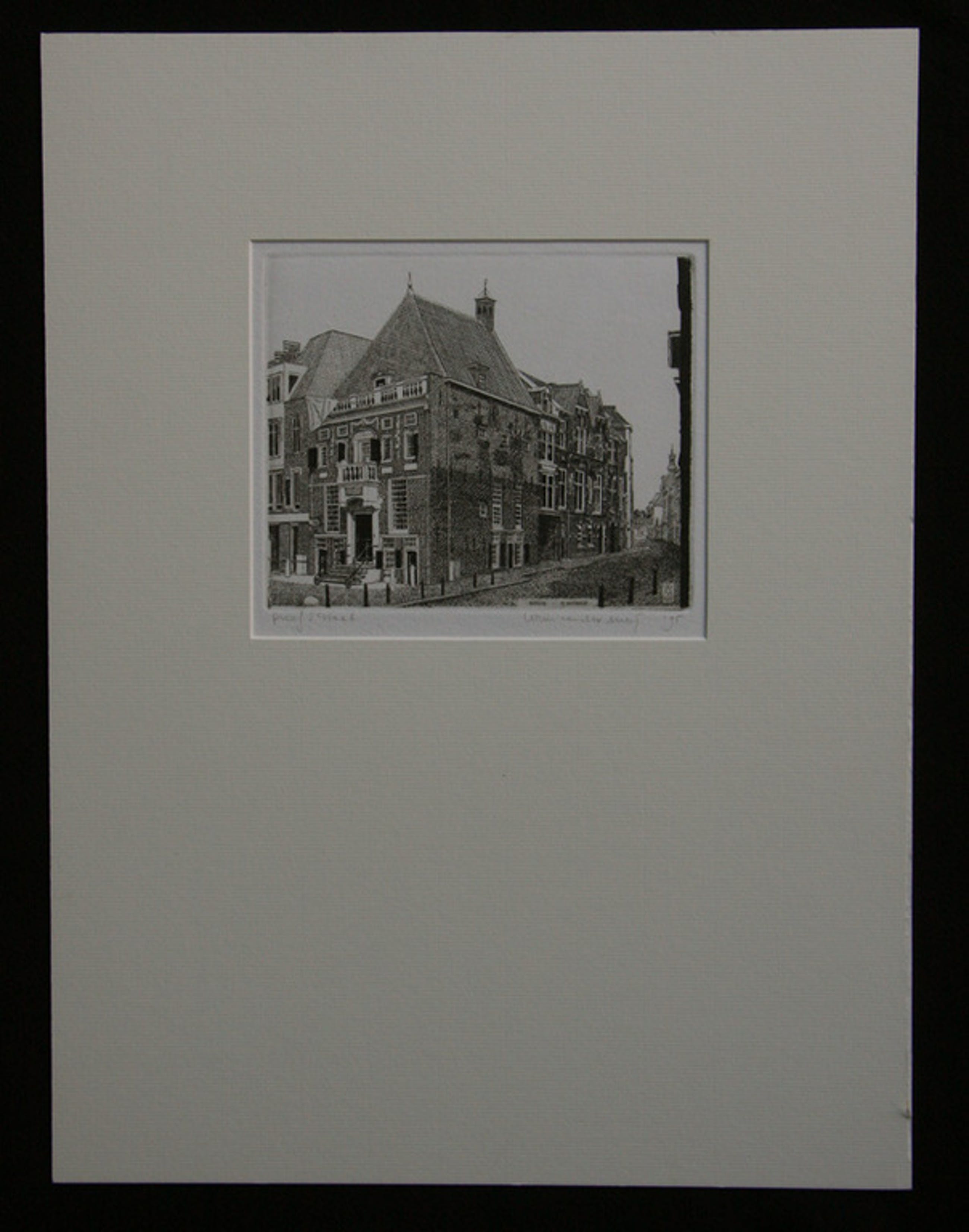Passe-partout 30 x 40 cm, papier 26 x 26 cm, beeld ca. 12 x 14,5 cm.