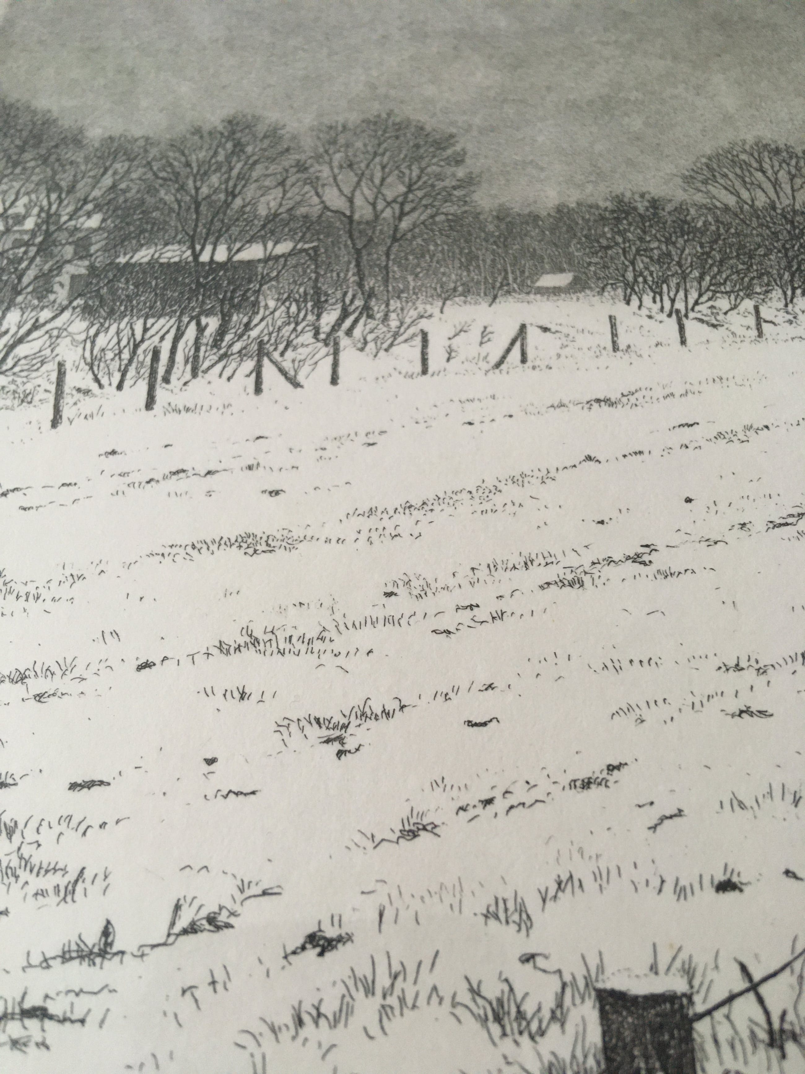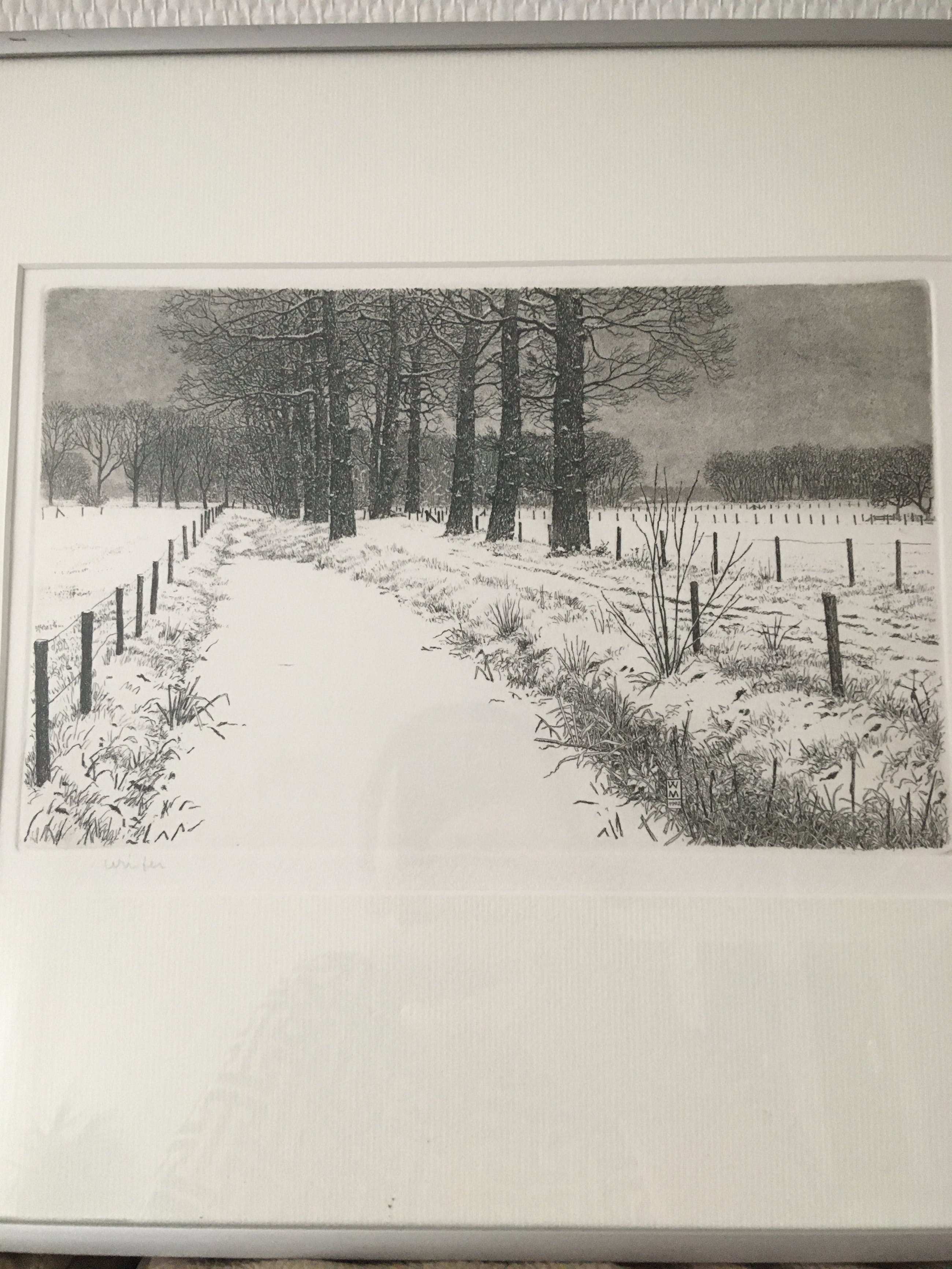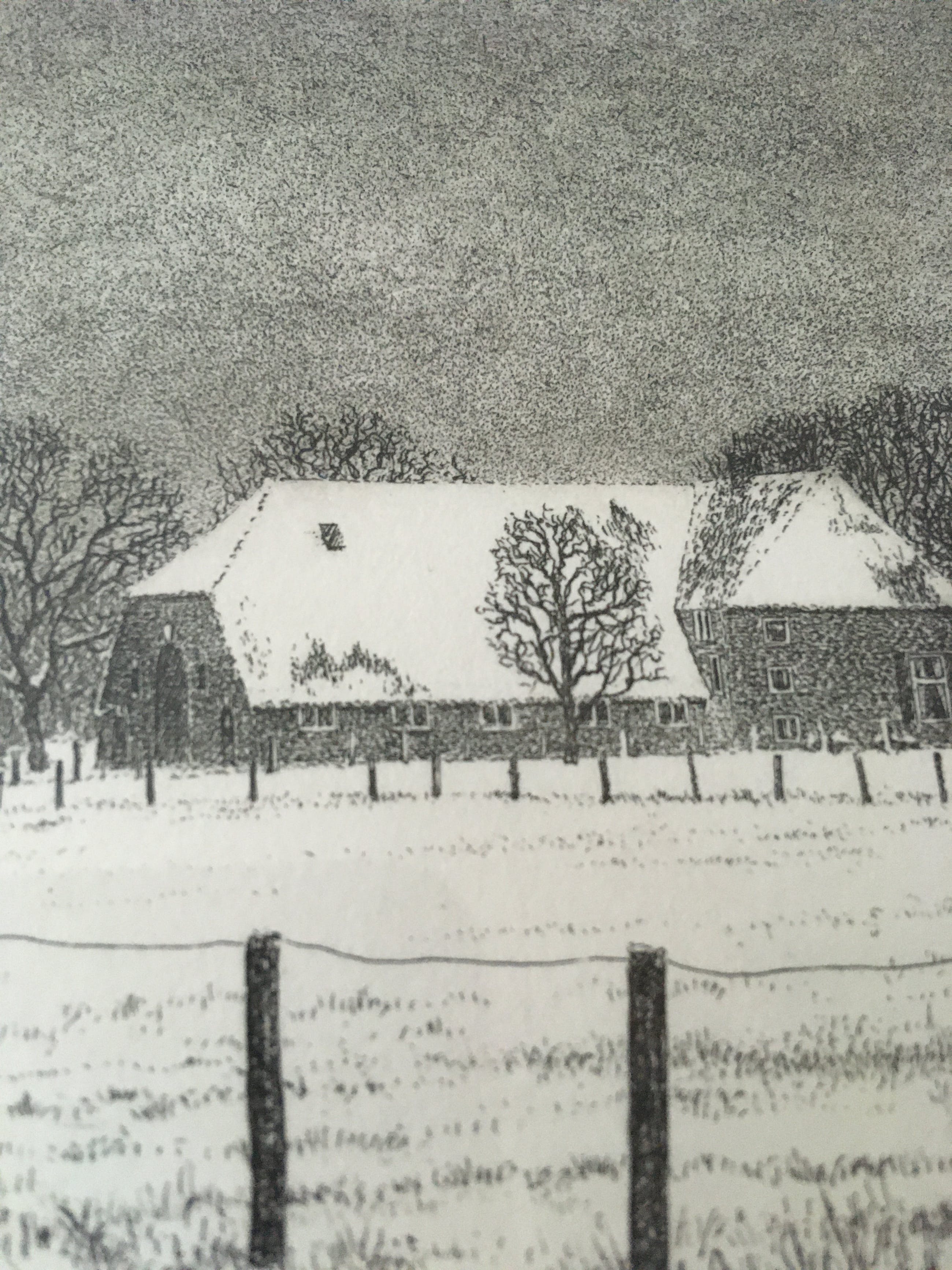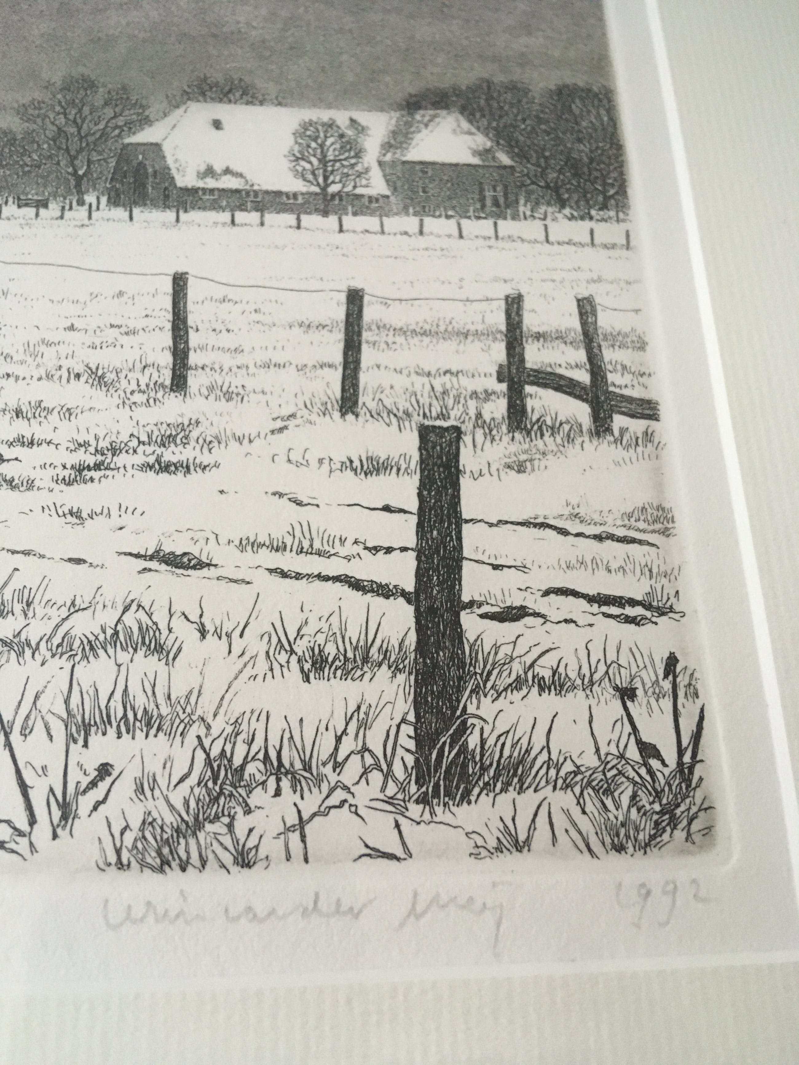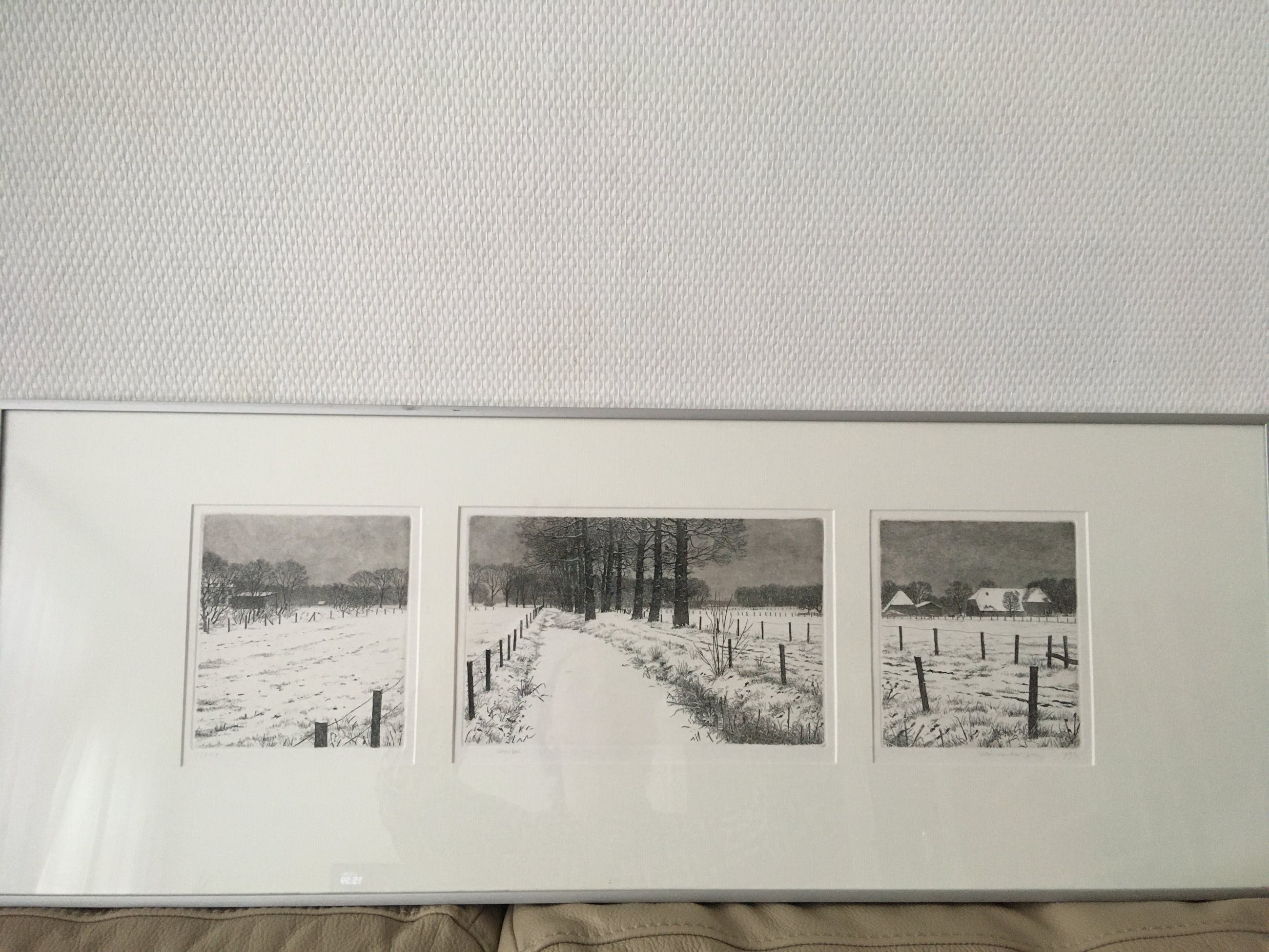 Winterlandschap met boerderijen op de achtergrond. Het werk bestaat uit 3 aparte werken die samen één geheel vormen. Werk is in uitstekende staat, er zit alleen een kleine beschadiging bovenin de lijst. Zie laatste foto.