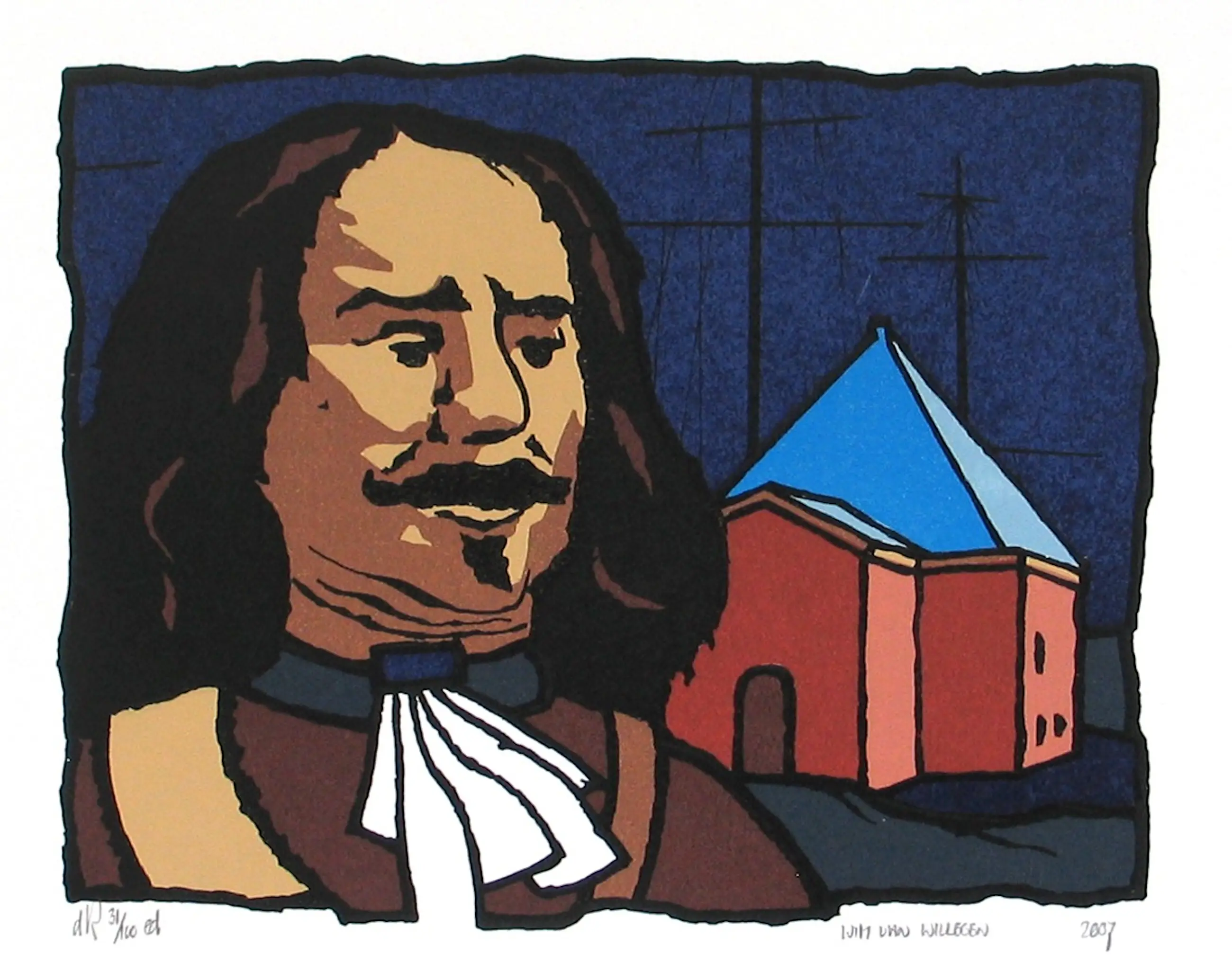 Te koop aangeboden: losse zeefdrukken met als afbeelding “Michiel de Ruyter”, gemaakt door kunstenaar Wim van Willegen.