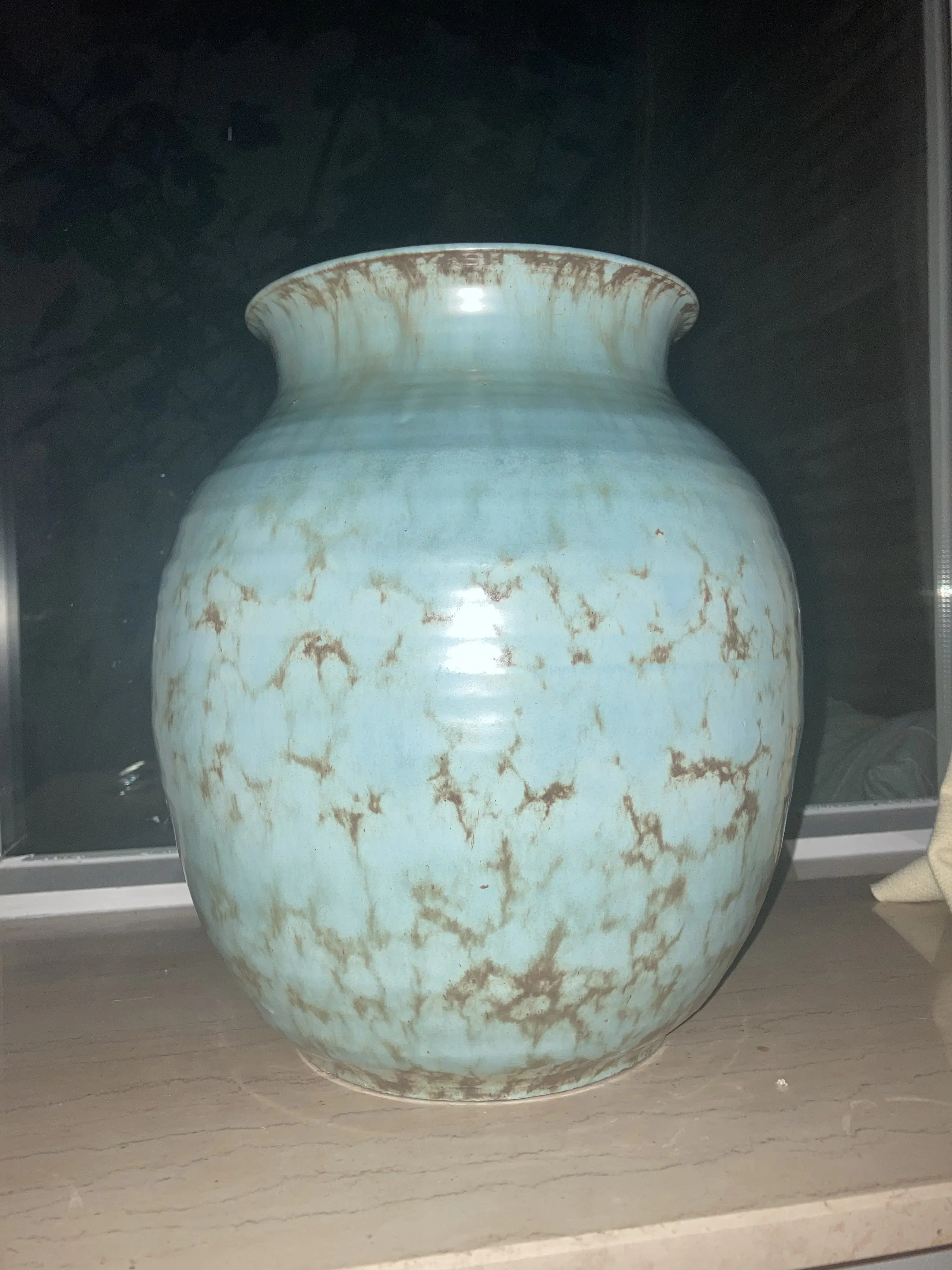 Mooie bruin-blauwe vaas van Wim Visser, uit zijn tijd bij de Sphinx Maastricht.
