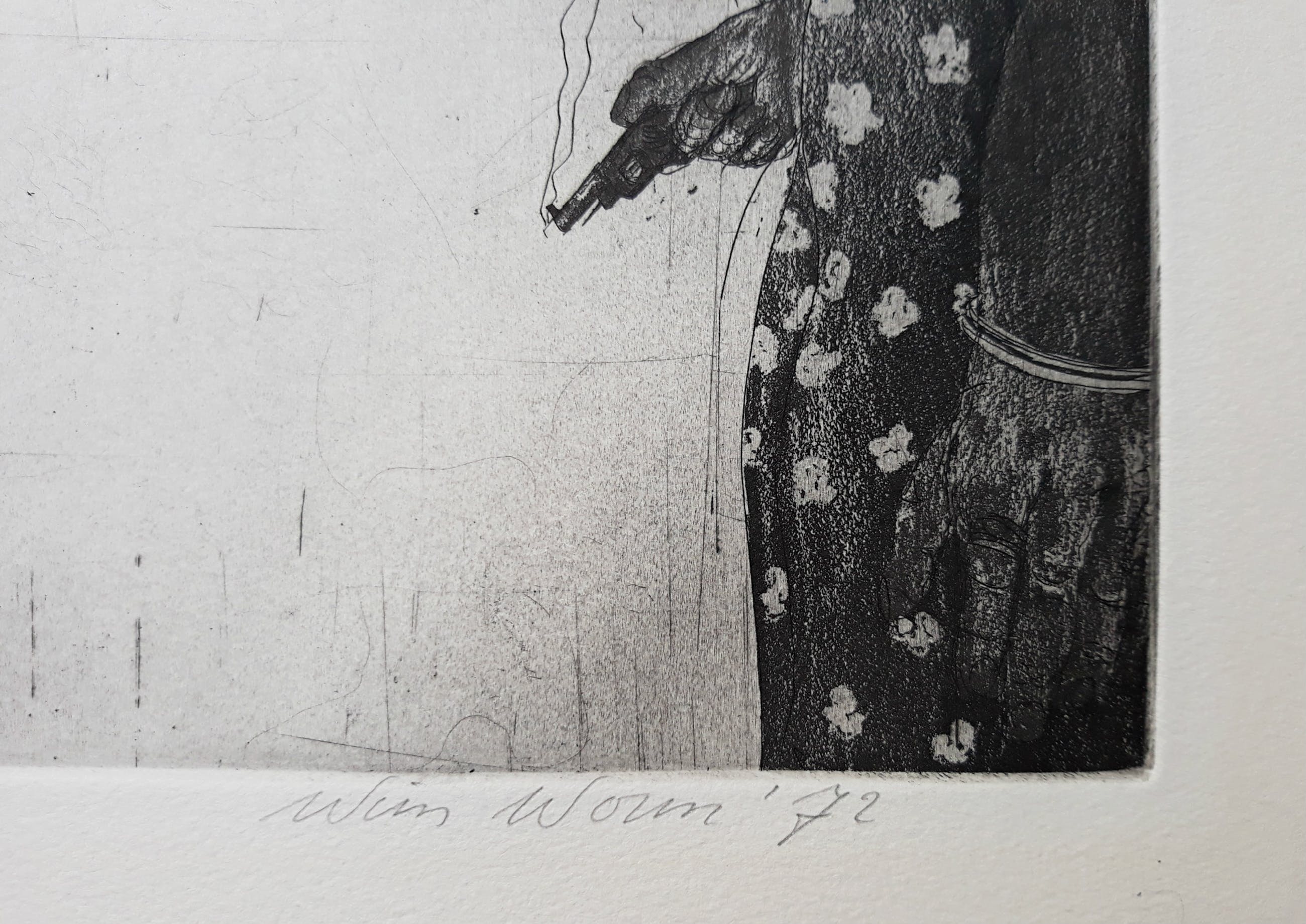 Karakteristiek werk van Wim Work. Ets op geschept papier, met potlood gesigneerd, gedateerd (‘72), getiteld en genummerd (23/40). In zeer goede conditie.