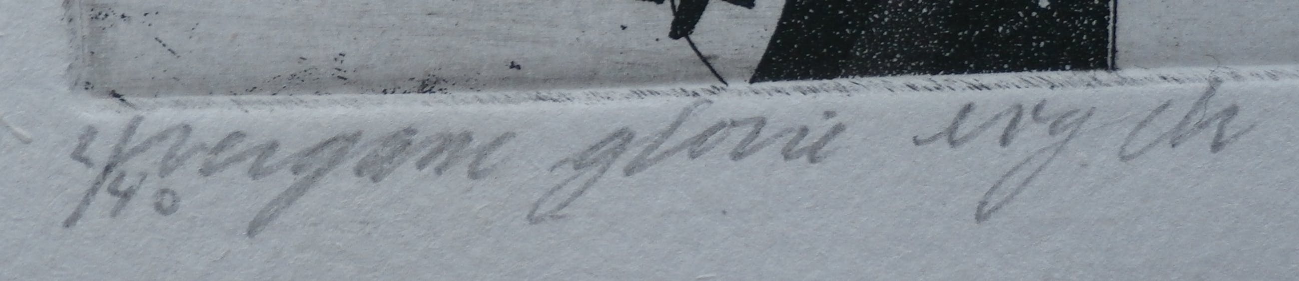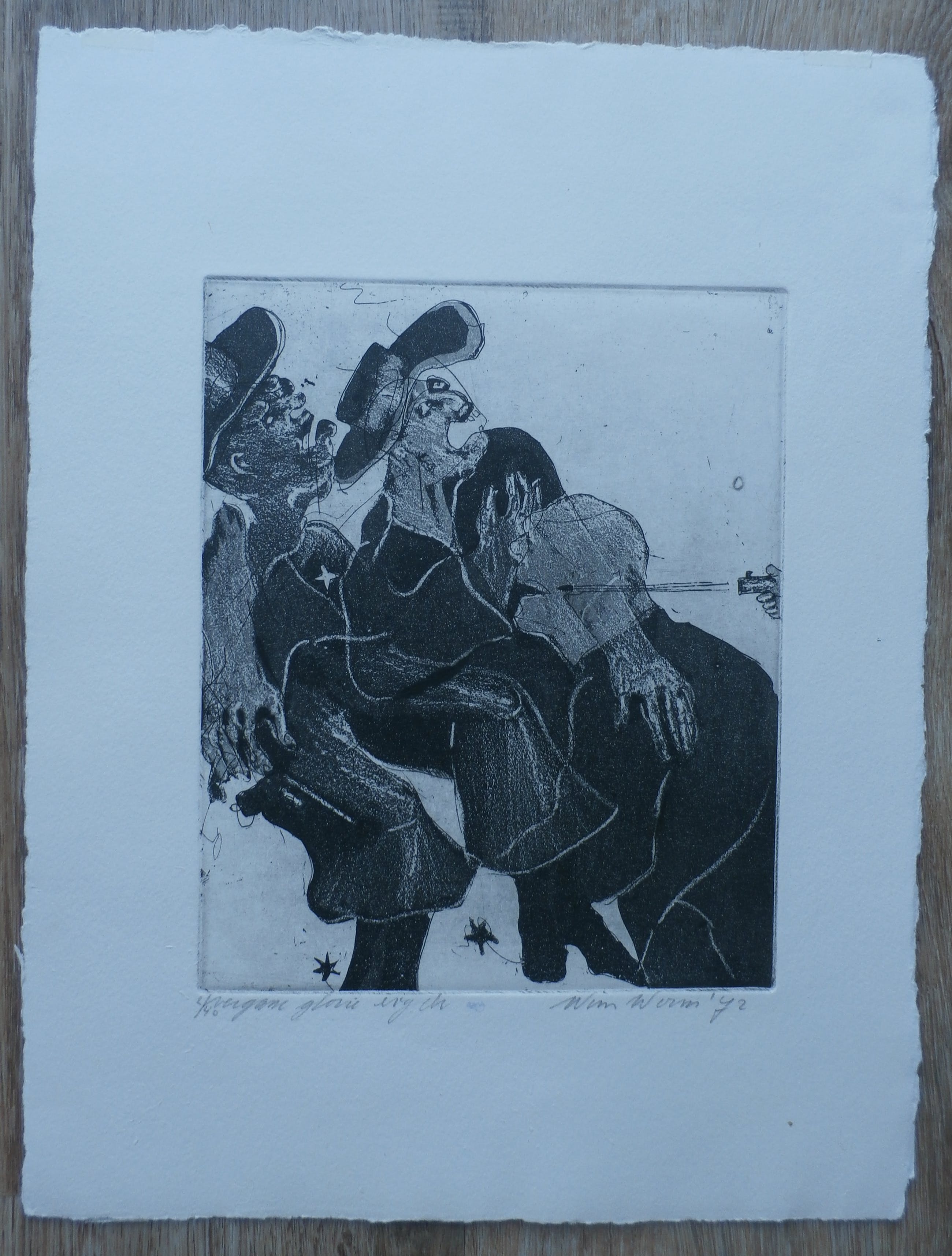 Ets van Wim Worm. Jaar: 1972. Afmetingen blad: H32.5 X b25. Afmetingen voorstelling: H19.5 x B16. Het werk is rechtsonder gesigneerd door de kunstenaar. De authenticiteit van het aangeboden werk kan voor 100% worden gegarandeerd. Een certificaat van echtheid kan, op aanvraag worden meegestuurd. Conditie: in goede staat. Er zitten wat plakresten op de achterzijde van een vorige inlijsting.