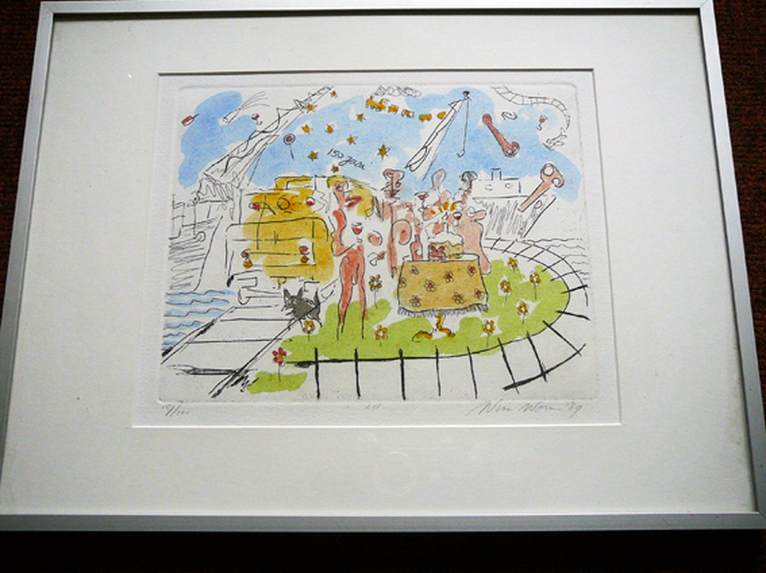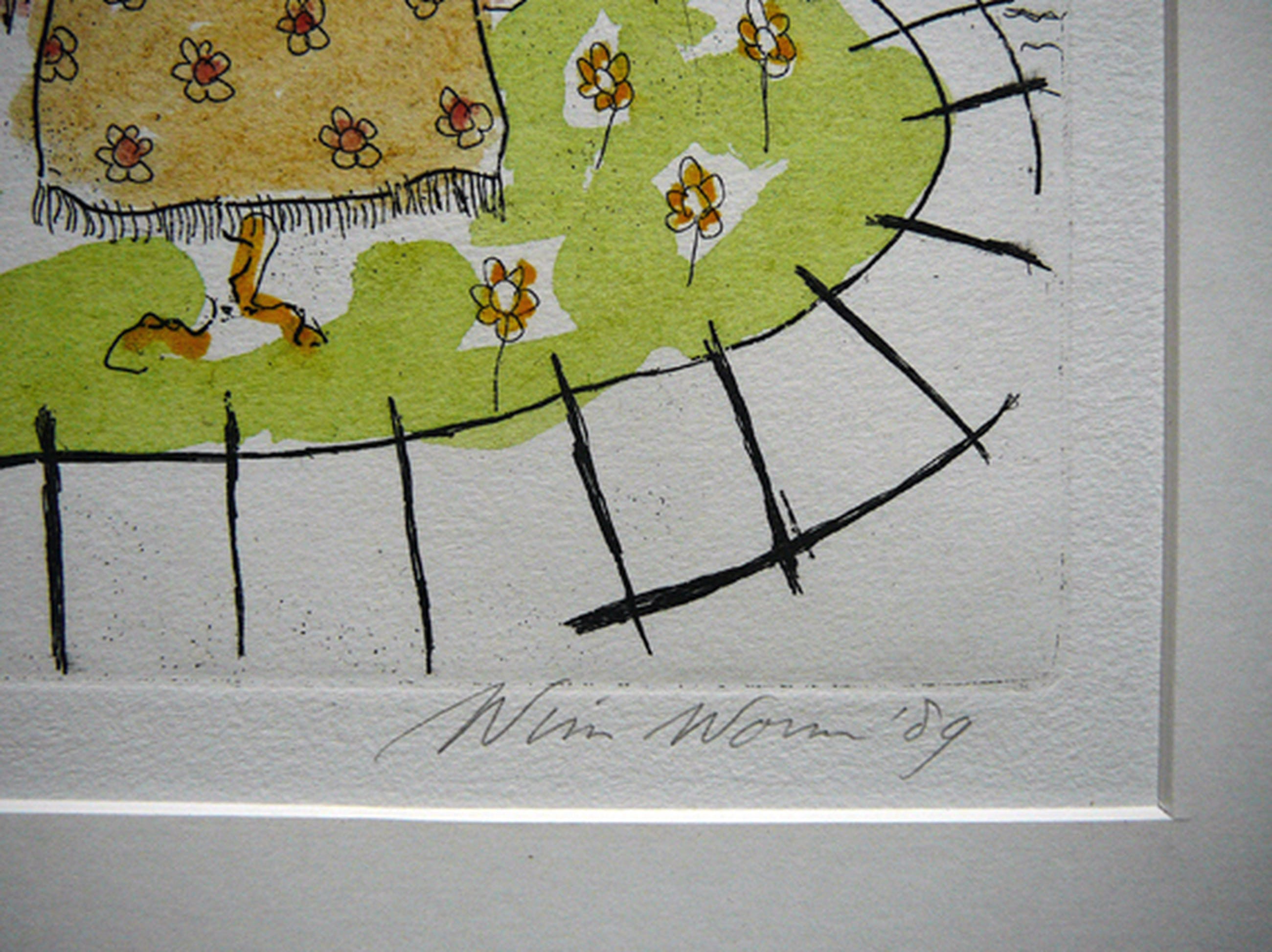 Feestelijke, met aquarel ingekleurde en gelijste ets van Wim Worm uit 1989. Rechtsonder met potlood gesigneerd en genummerd 157/200 eigen druk. Beeldformaat 25 x 20 cm. Lijstformaat 31 x 41 cm. Conditie: als nieuw.
