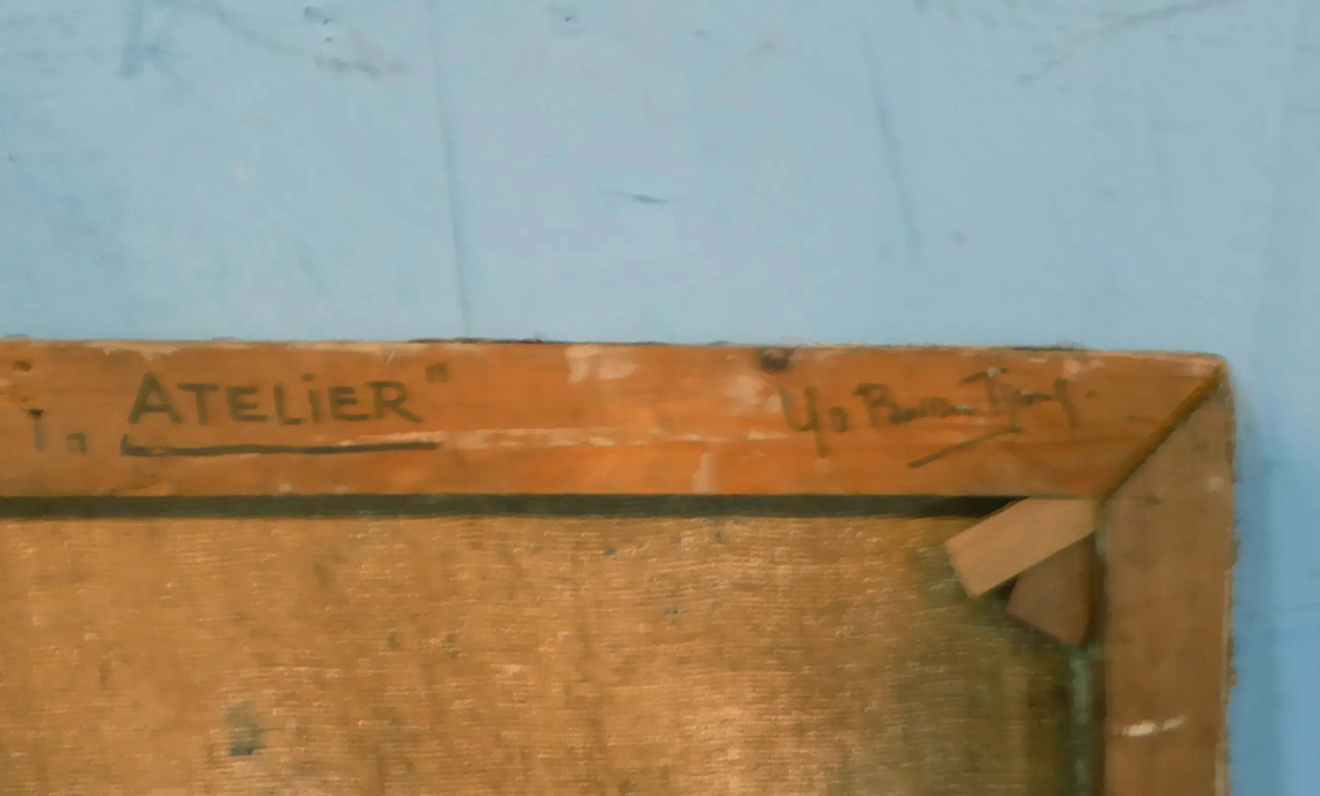 Titel (op achterzijde vermeld) "Atelier" interieur van kunstenaar. (een ander werk van hem zichtbaar) in goede staat