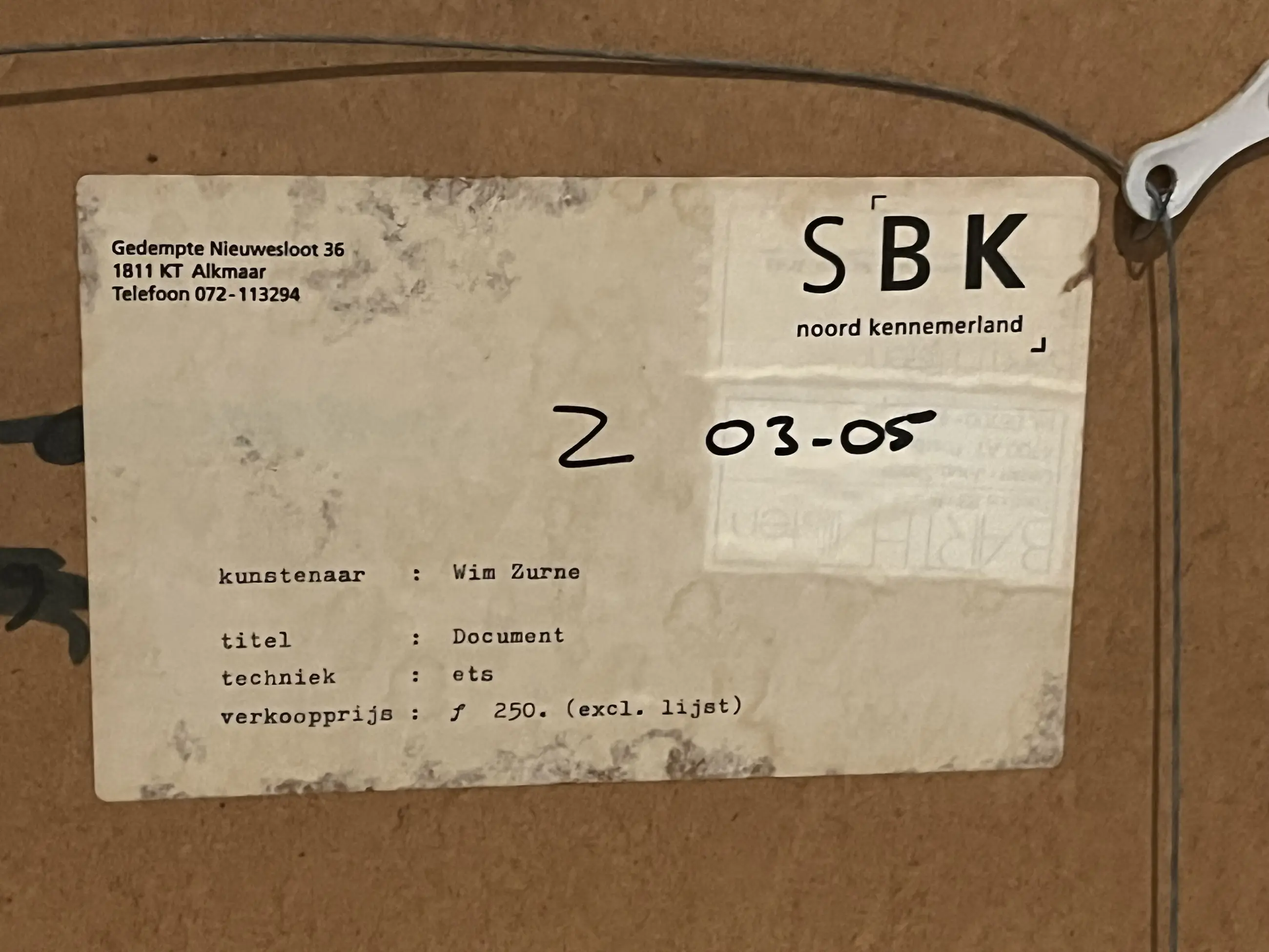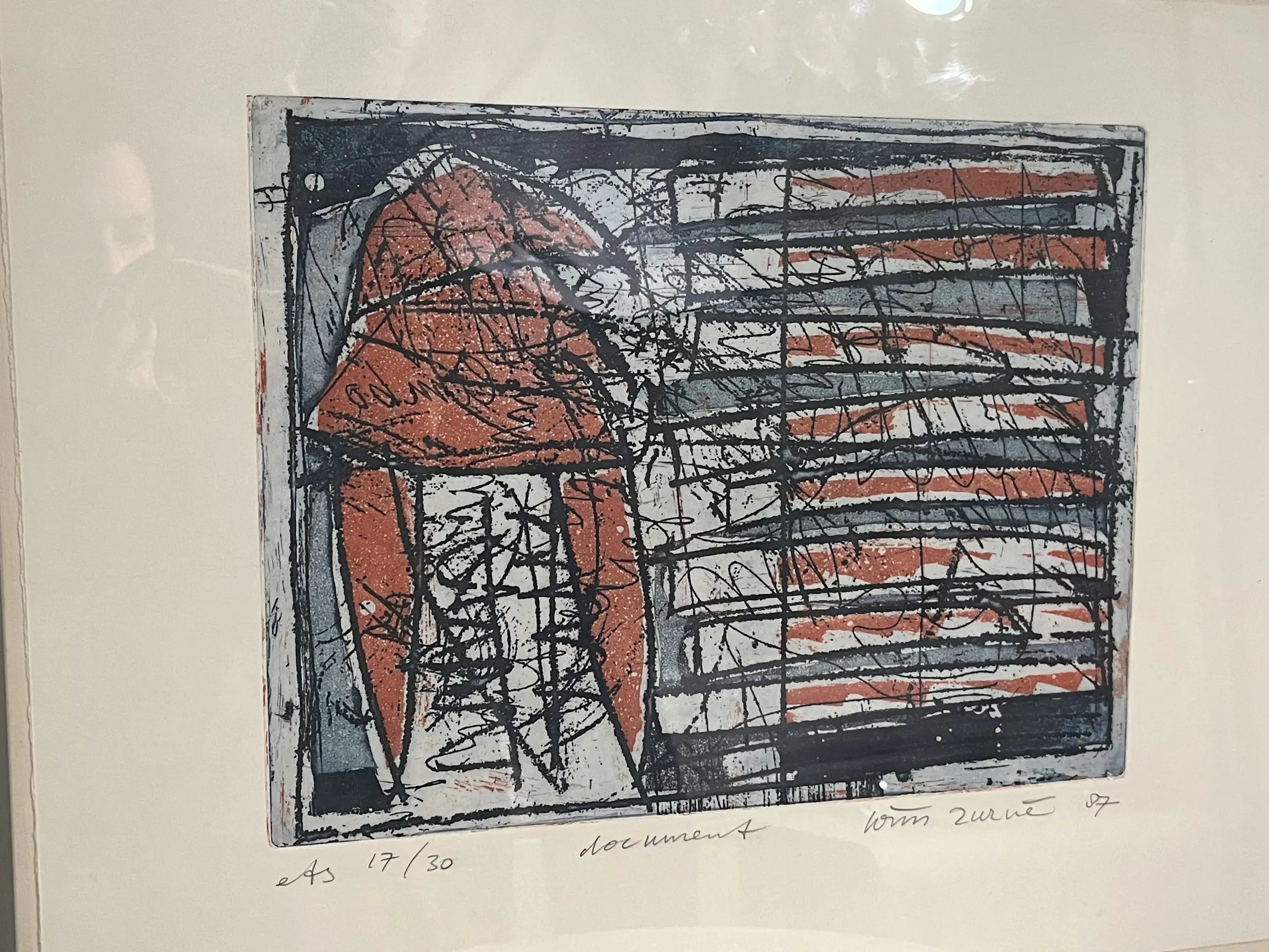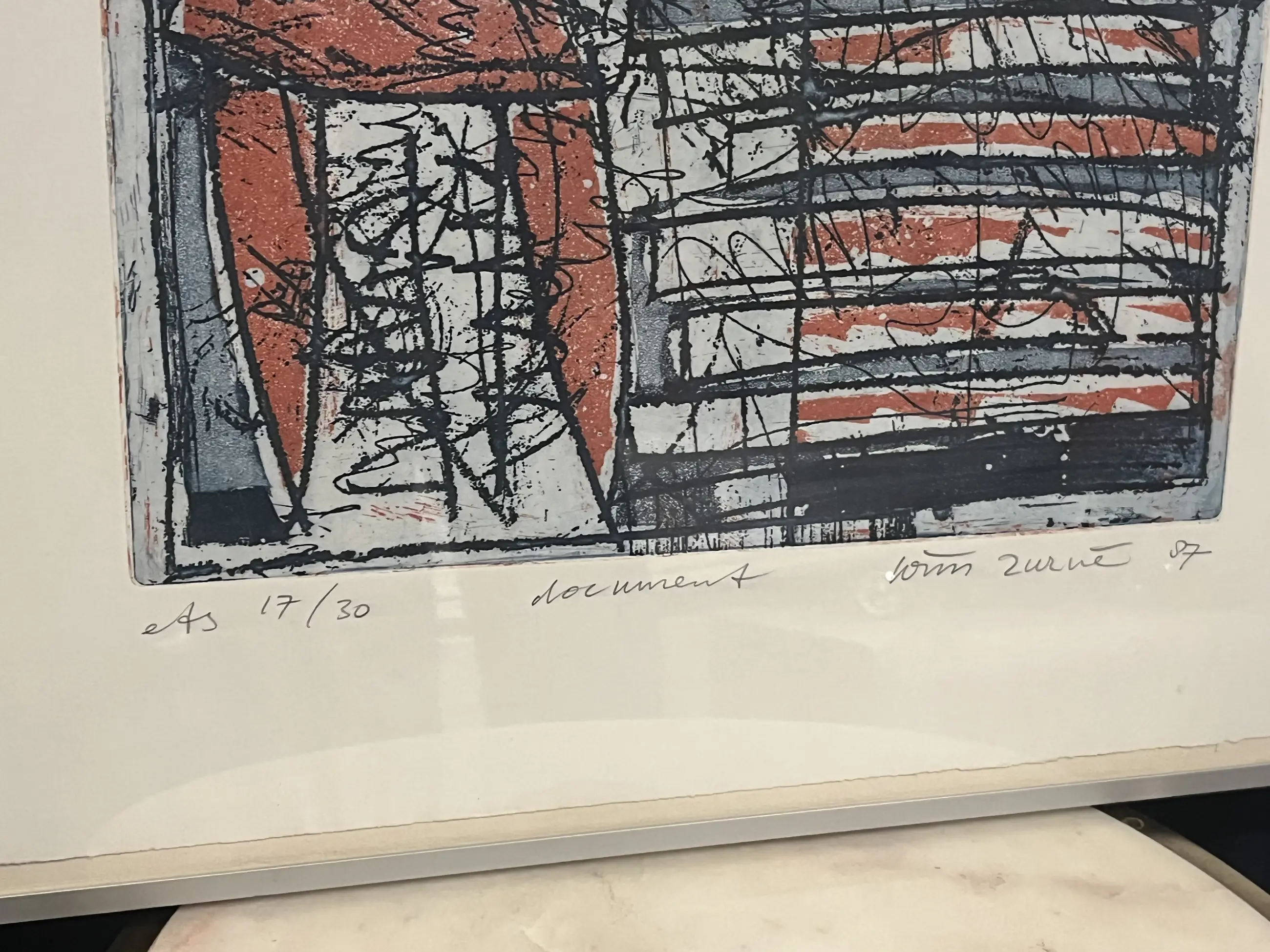 Deze intrigerende ets van Wim Zurne toont een krachtig abstract beeld waarin structuur, beweging en gelaagdheid centraal staan. De compositie wordt gekenmerkt door expressieve lijnen en een spannend kleurgebruik in rood-, grijs- en zwarttinten, wat het werk een dynamisch en bijna architectonisch karakter geeft. De titel Document suggereert een vastlegging of momentopname, maar laat tegelijk veel ruimte voor persoonlijke interpretatie.