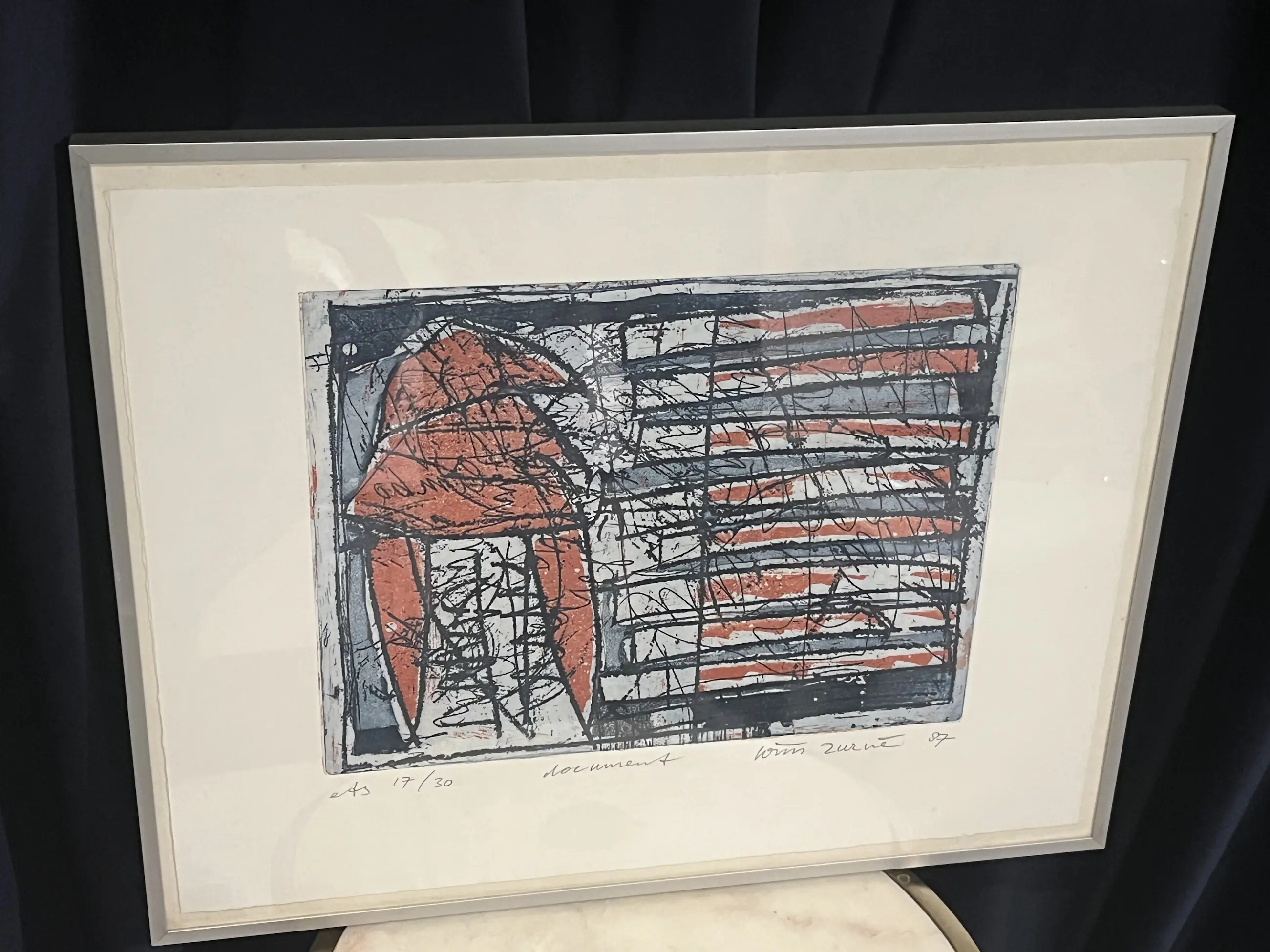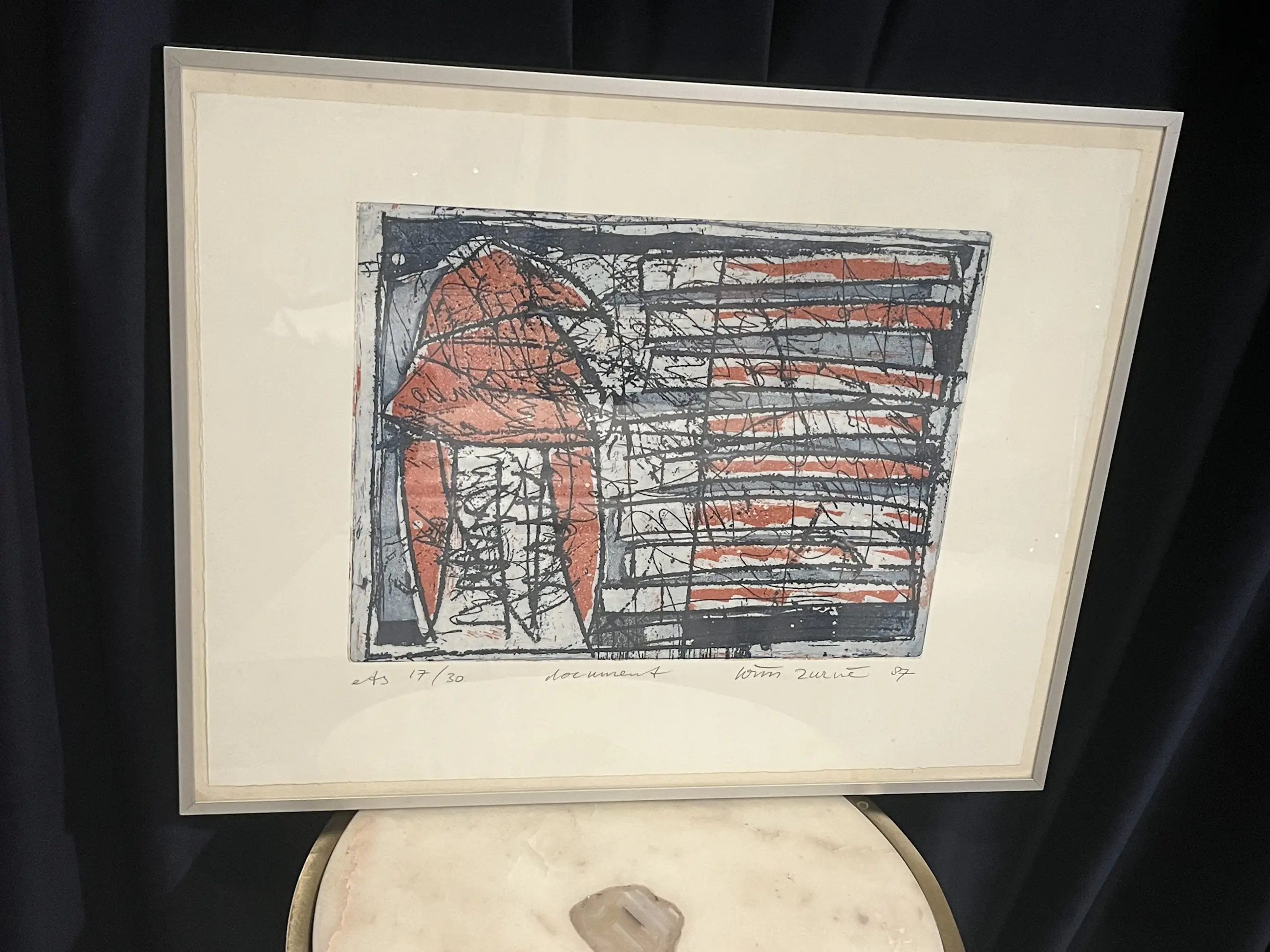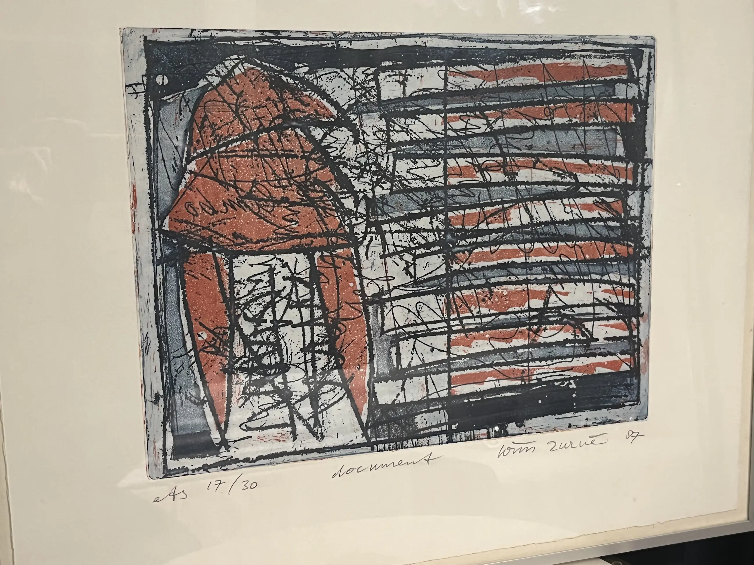 Deze intrigerende ets van Wim Zurne toont een krachtig abstract beeld waarin structuur, beweging en gelaagdheid centraal staan. De compositie wordt gekenmerkt door expressieve lijnen en een spannend kleurgebruik in rood-, grijs- en zwarttinten, wat het werk een dynamisch en bijna architectonisch karakter geeft. De titel Document suggereert een vastlegging of momentopname, maar laat tegelijk veel ruimte voor persoonlijke interpretatie.