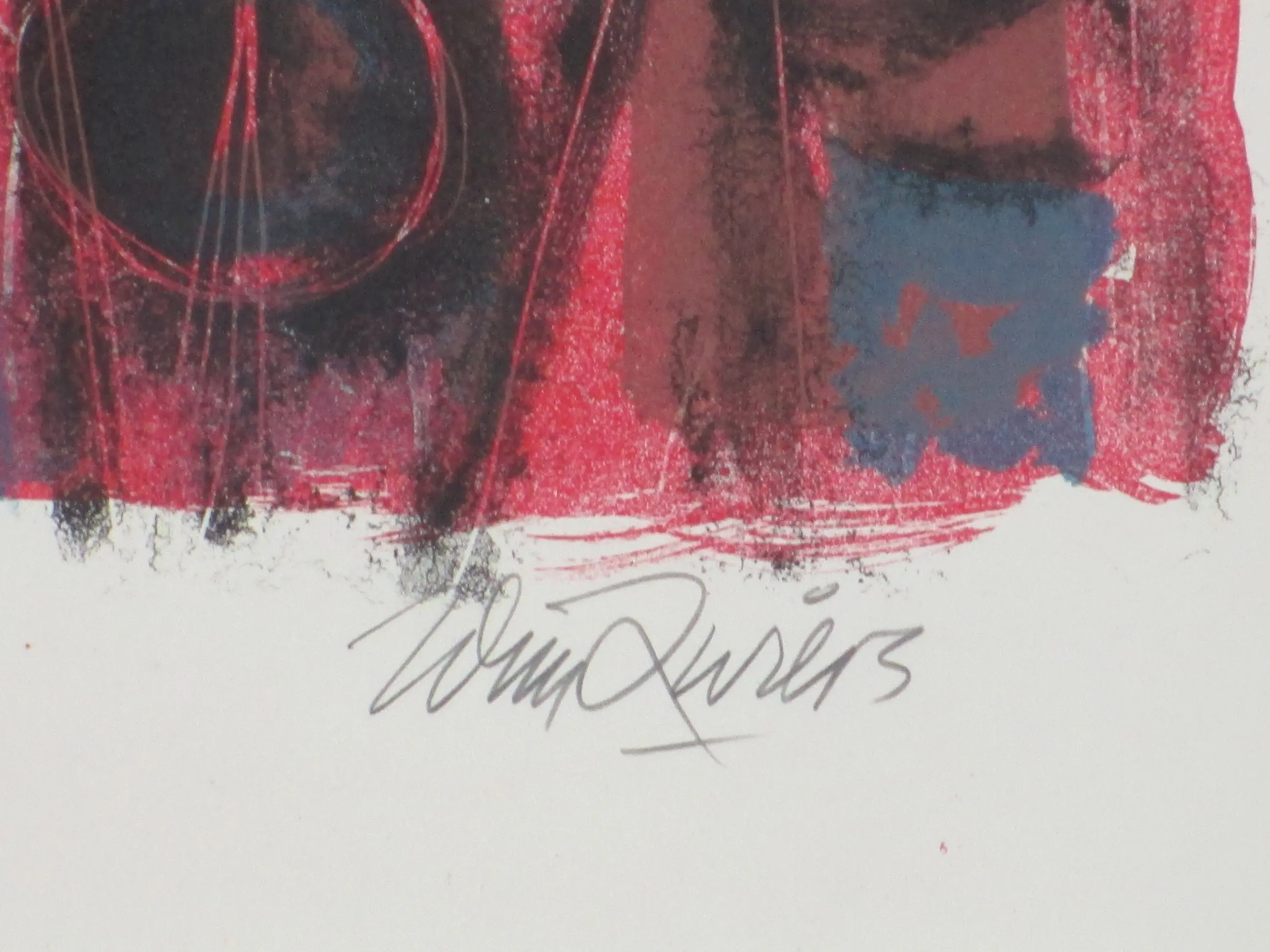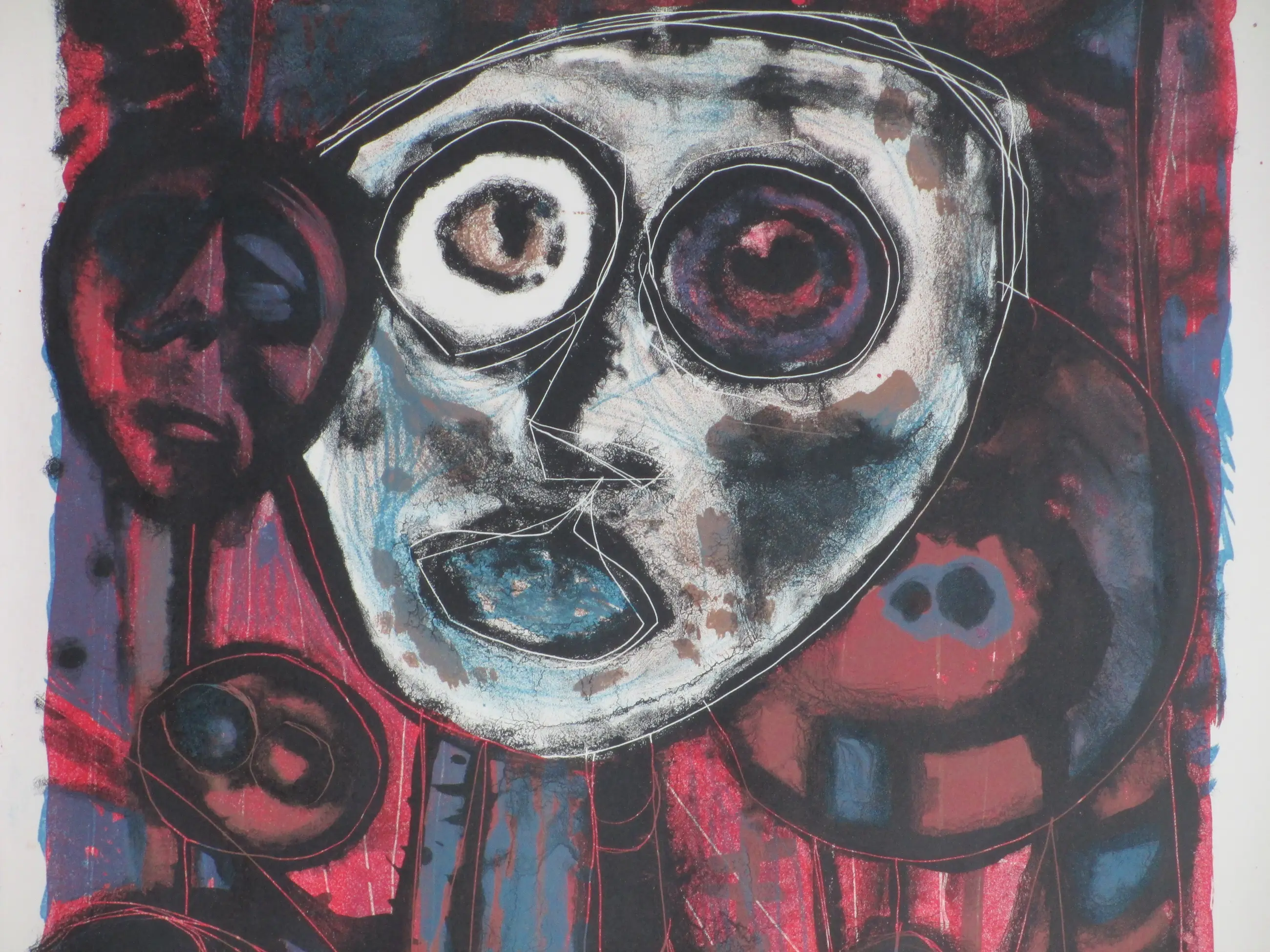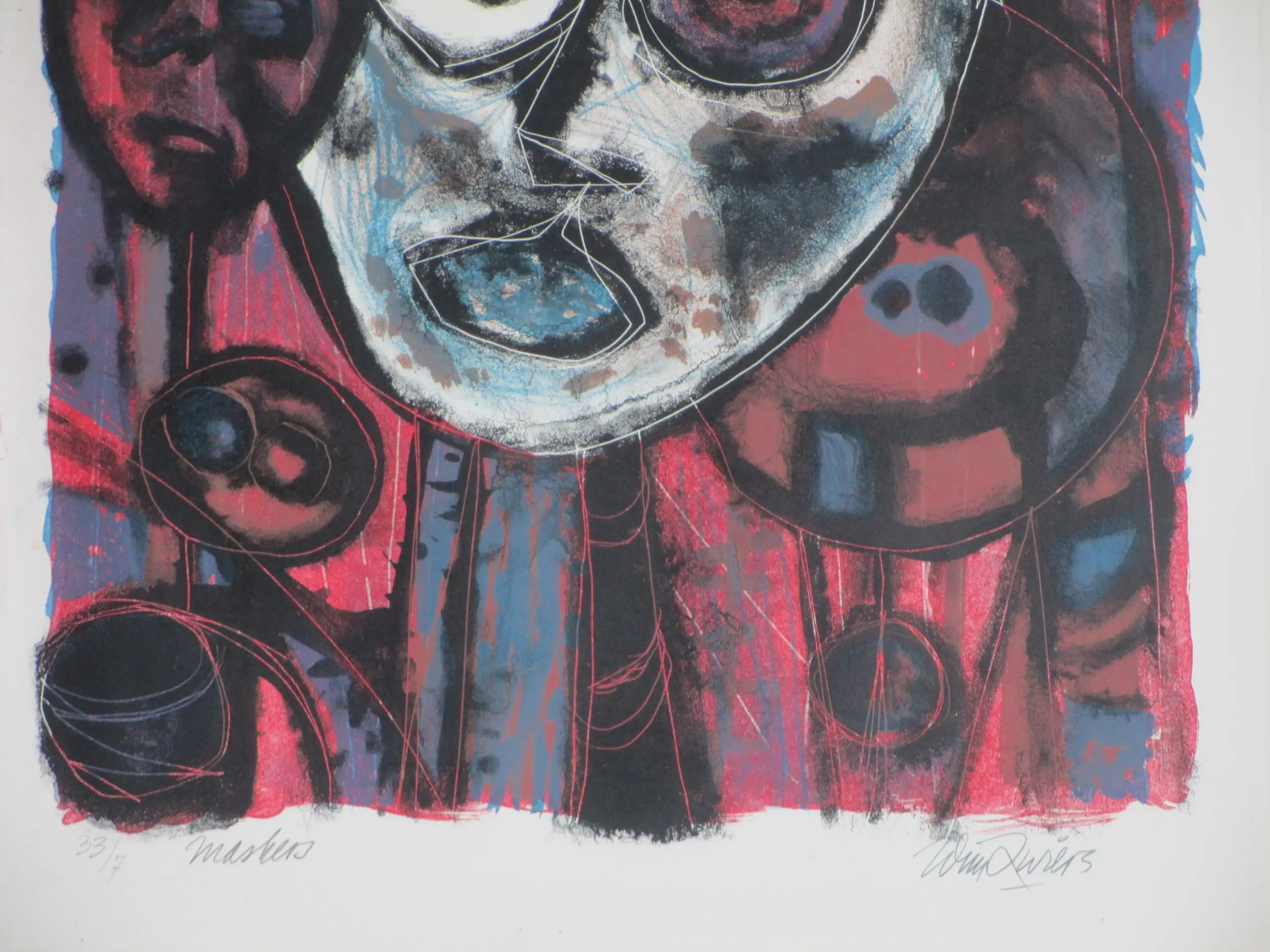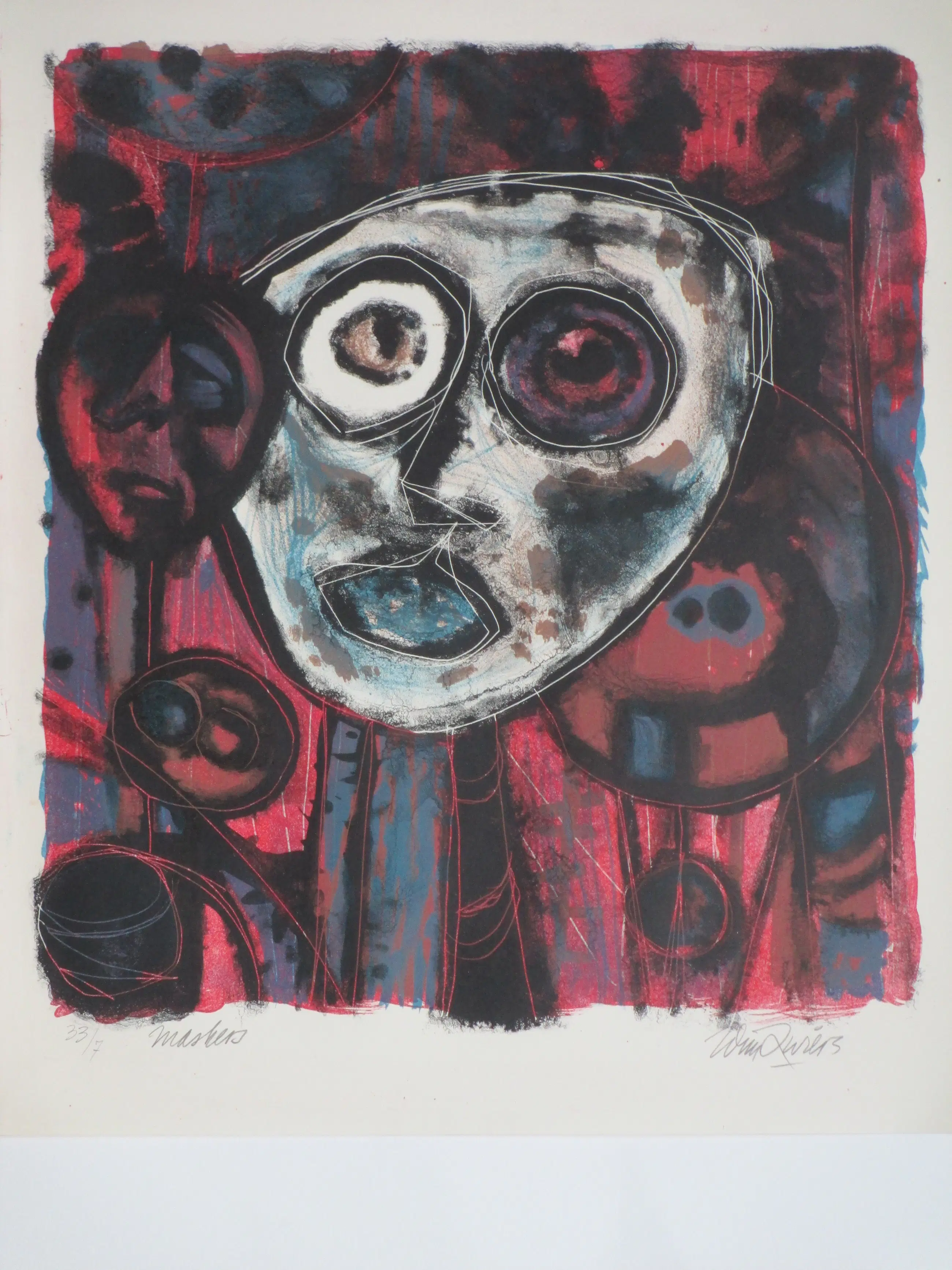 Kleurenlitho door Wim Zwiers Voorstelling getiteld 'Maskers' Losbladig, beeldmaat 32x28, bladmaat 38x33 Gesigneerd in potlood r.o.: 'Wim Zwiers' Genummerd en getiteld in potlood l.o.: '33/7 & Maskers'