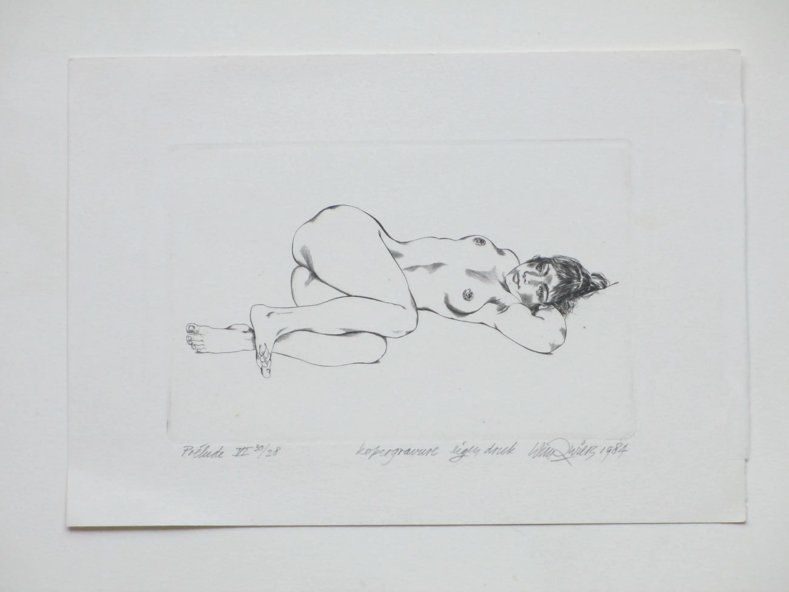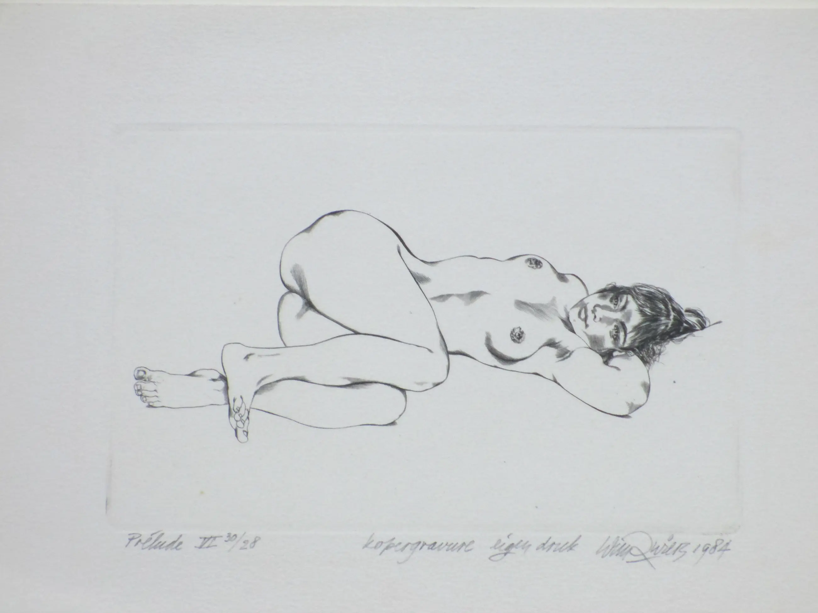 Kopergravure door Wim Zwiers Voorstelling van een liggend naakt Losbladig, beeldmaat 10.5x16, bladmaat 16x23 Gesigneerd en gedateerd in potlood r.o.: 'Wim Zwiers 1984' Getiteld en genummerd in potlood l.o.: 'Prélude VI 30/28' Annotatie in potlood m.o.: 'kopergravure eigen druk' Authenticiteit volledig gegarandeerd