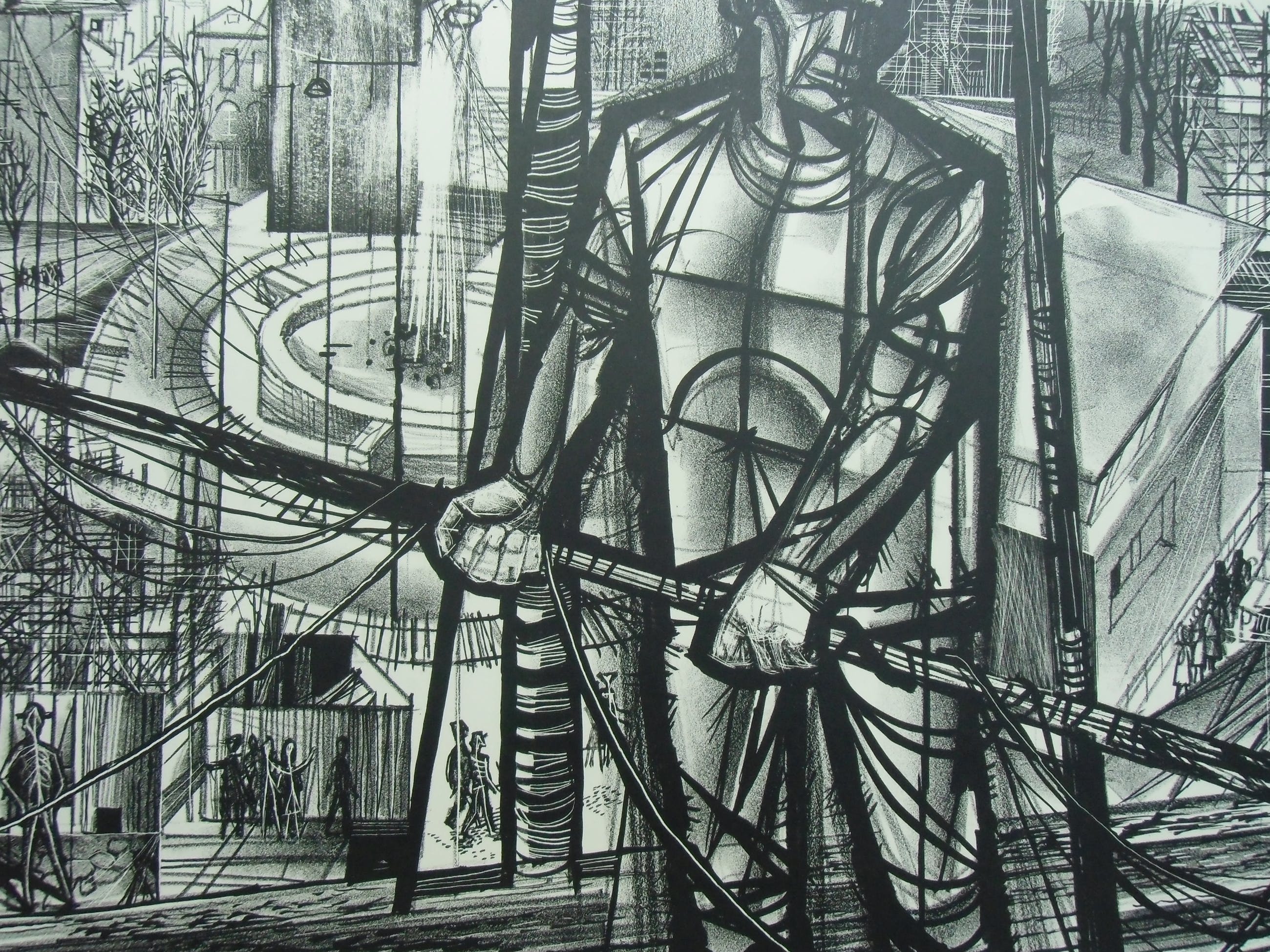 Als onderwerp heeft dit werk van Wim Zwiers de wederopbouw van Rotterdam na de bombardementen.