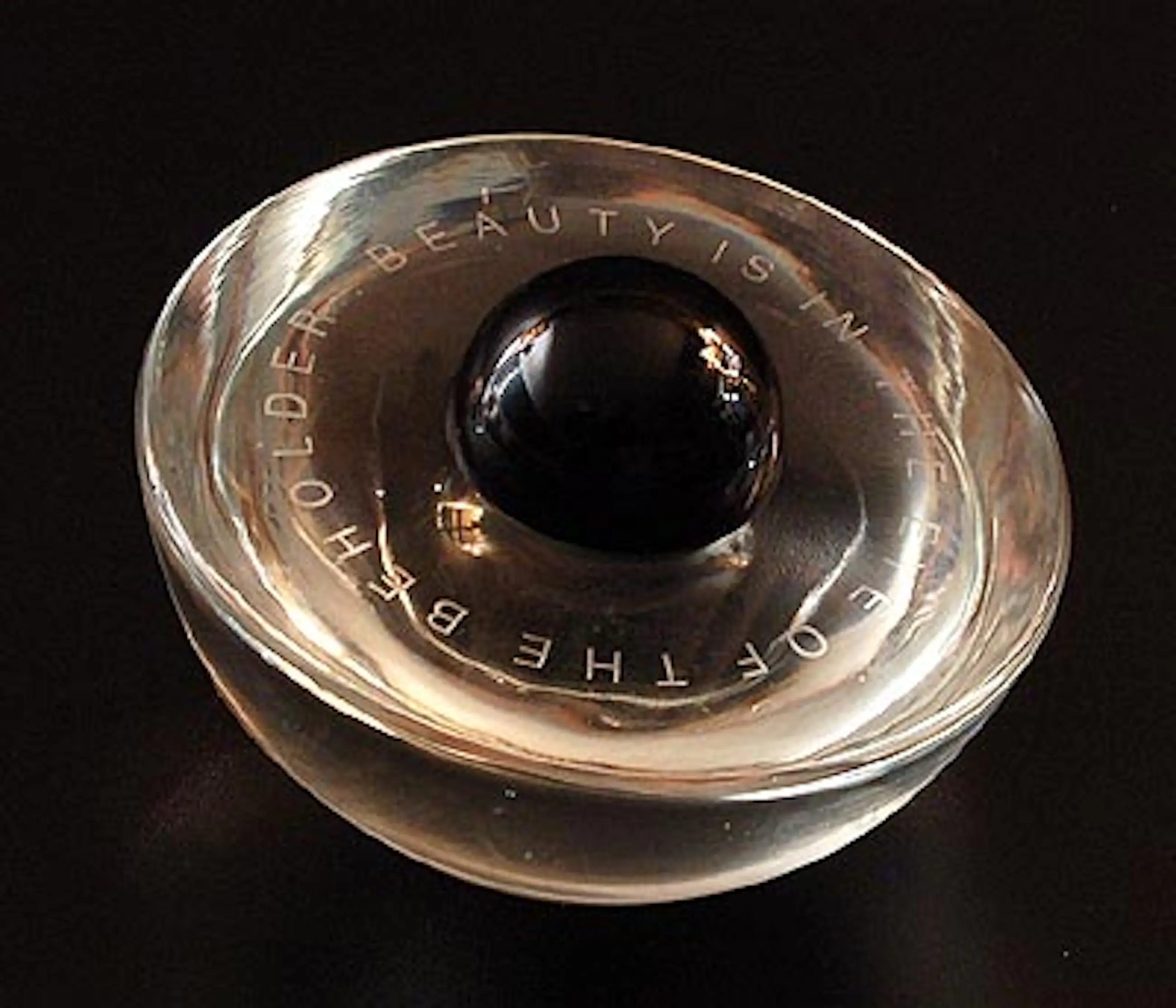 Een tweedelig object, blanke halve bol met daarop de tekst Beauty is in the Eye of the Beholder met daar in het midden een rode glazen bol.