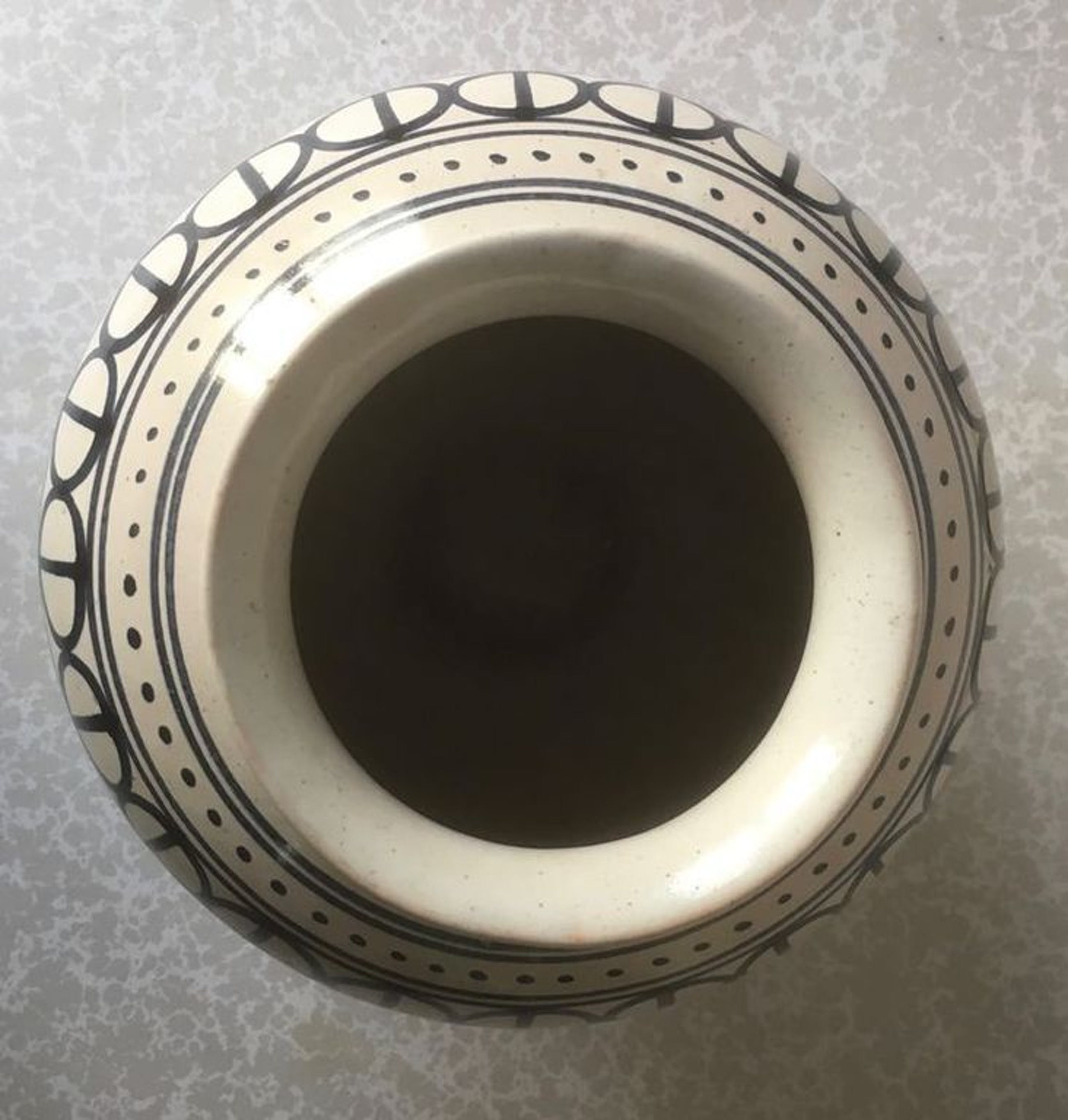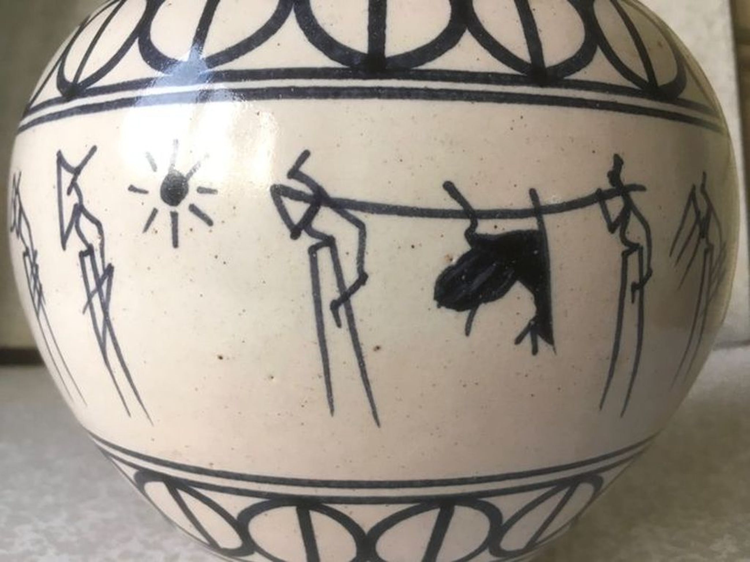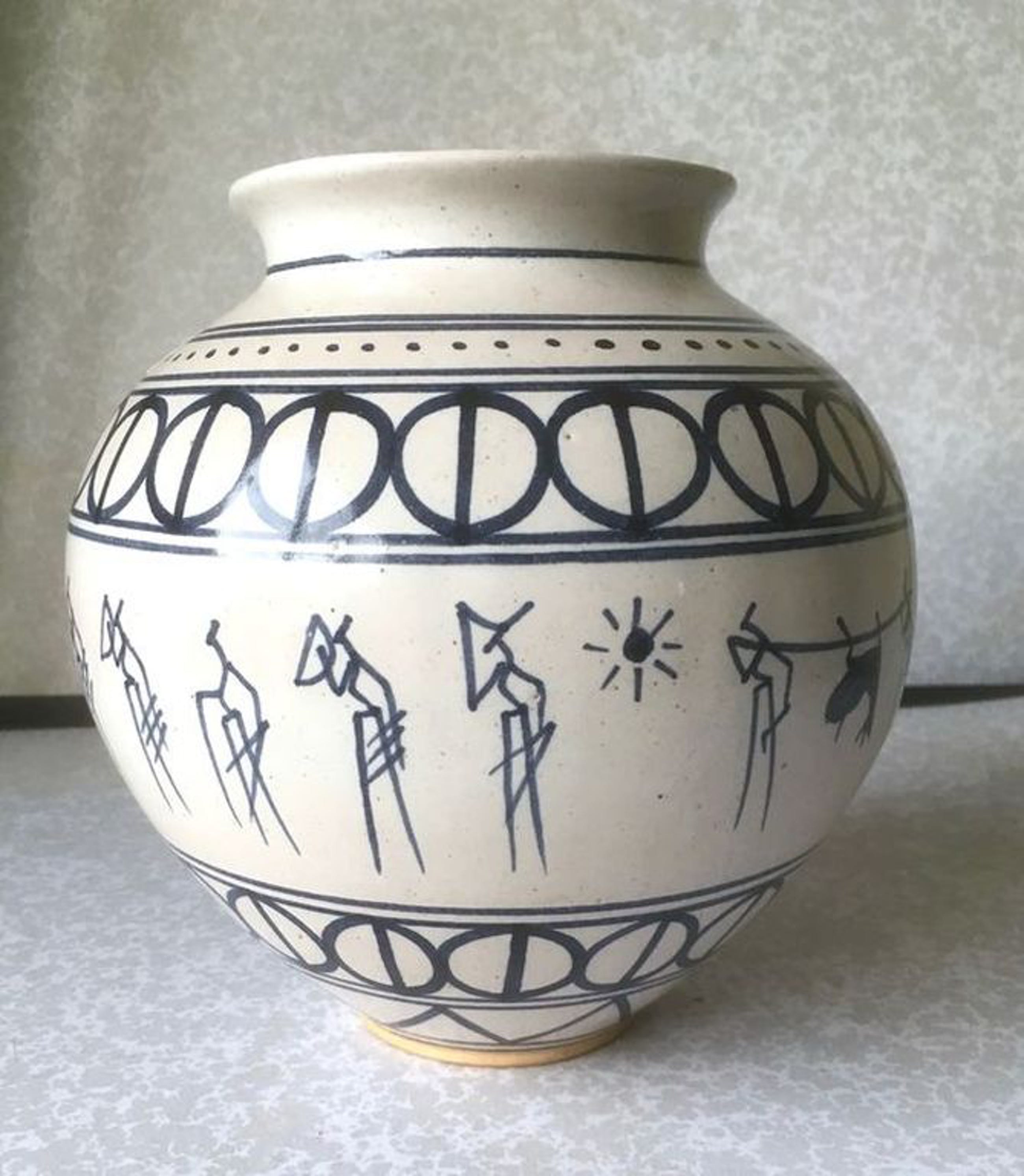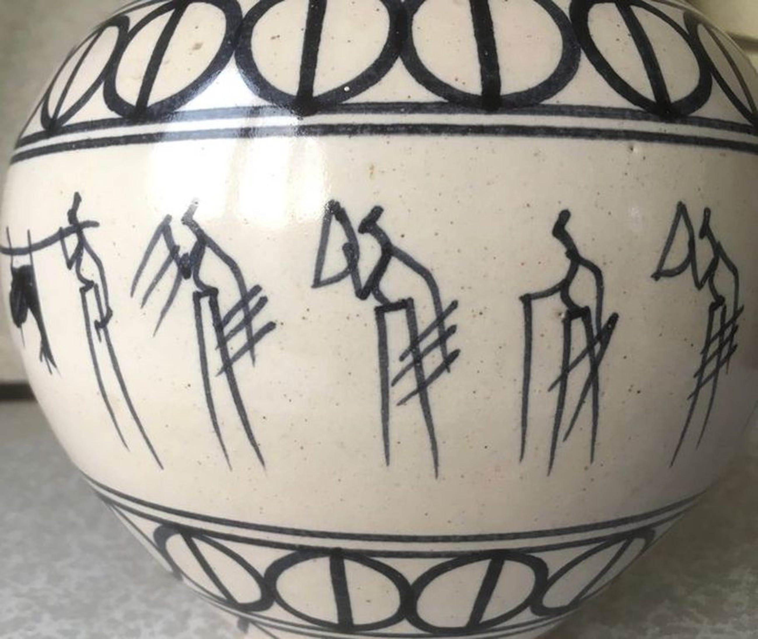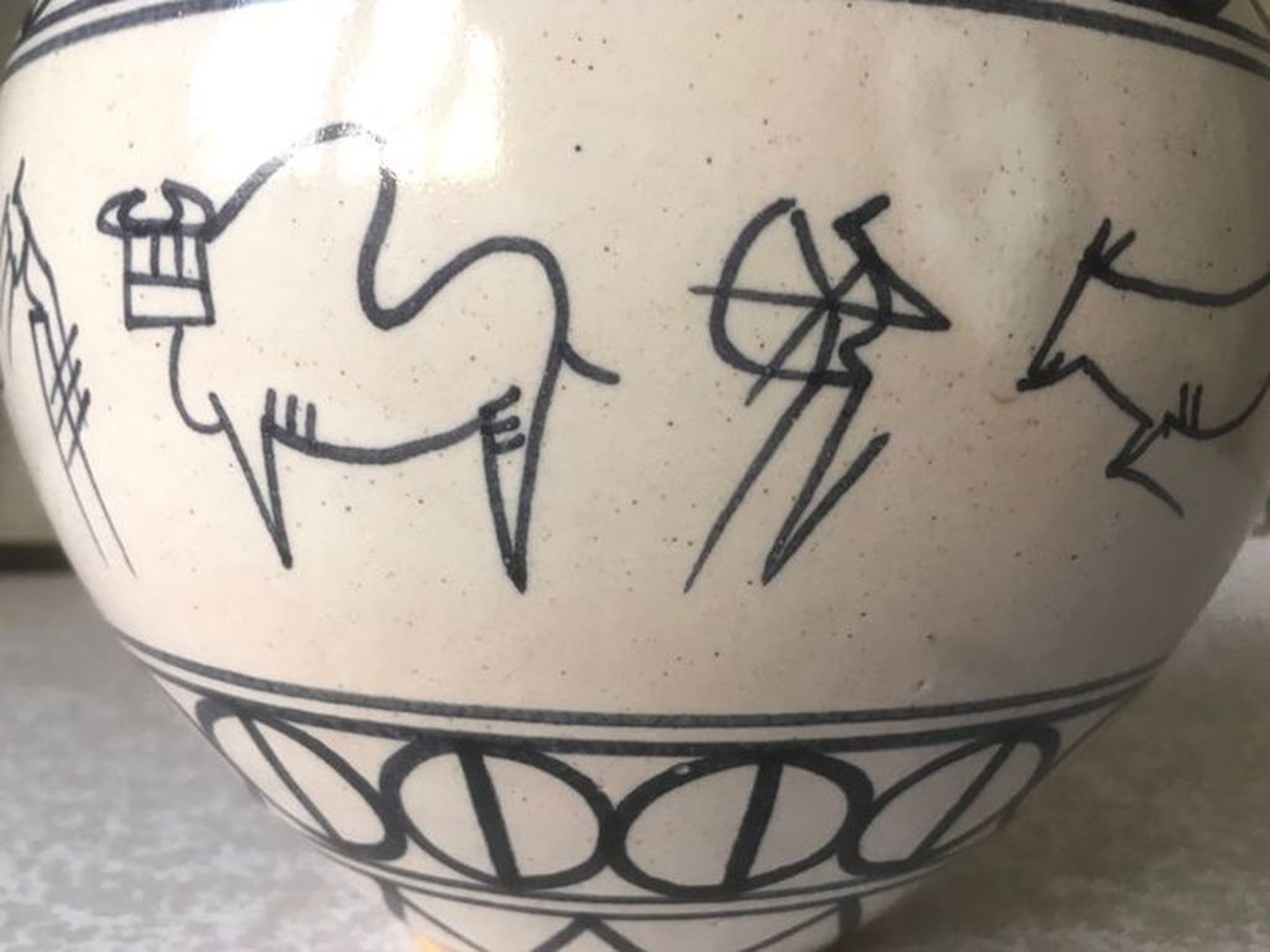 Interessante Witte vaas met stilistisch" jagers" decor. Vermoedelijk geïnspireerd door prehistorische grot tekeningen.
