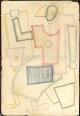 Sitzende Frau, Farbkreidezeichnung 1918/20, auf der Rückseite ein Architektur-Stich eines ägyptischen Tempels und ein Stempel "Atelier C. Movaux - Ecole des Beaux-Arts", Papier 415 x 280 mm mit älteren und neueren fachmännischen Reparaturen, sehr typische Zeichnung aus der konstruktivistischen Zeit Lebedews.