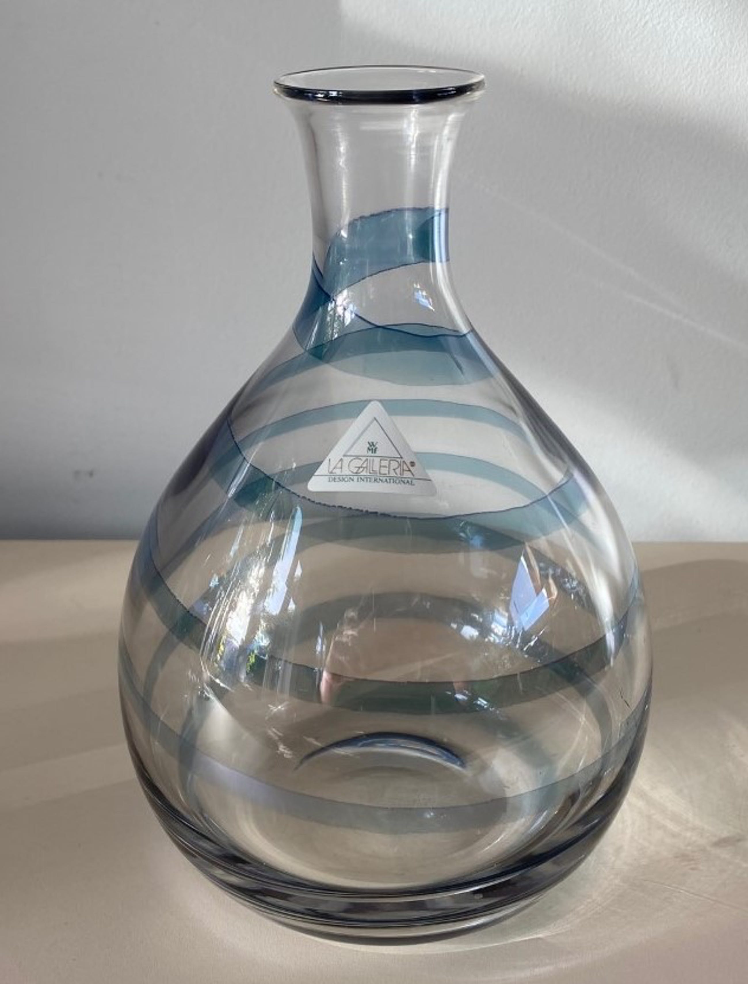 WMF design glazen karaf uit de La Galleria serie. de karaf is voorzien van blauw grijs luster decoratie op de stopper en als een slinger over de karaf heen. Gemerkt met een sticker, in perfecte conditie.